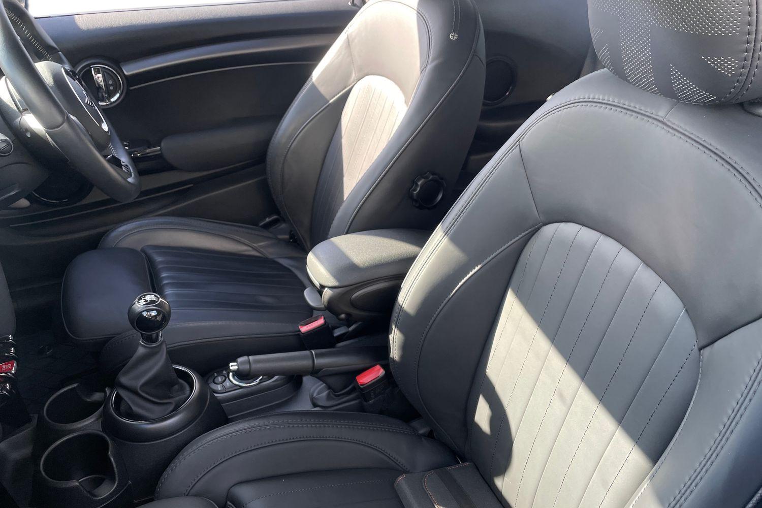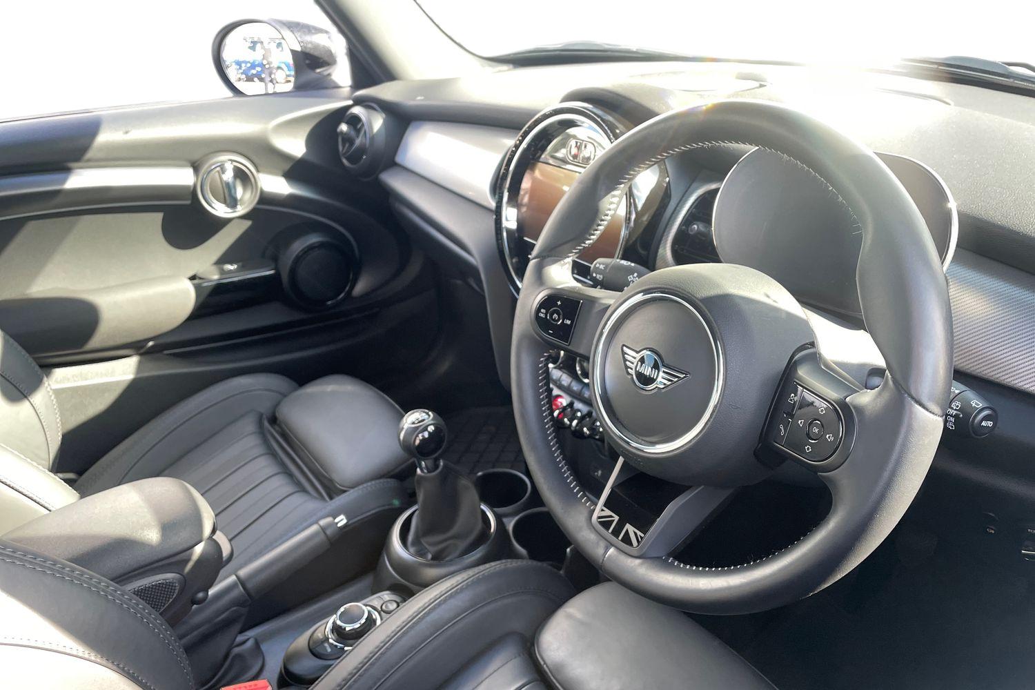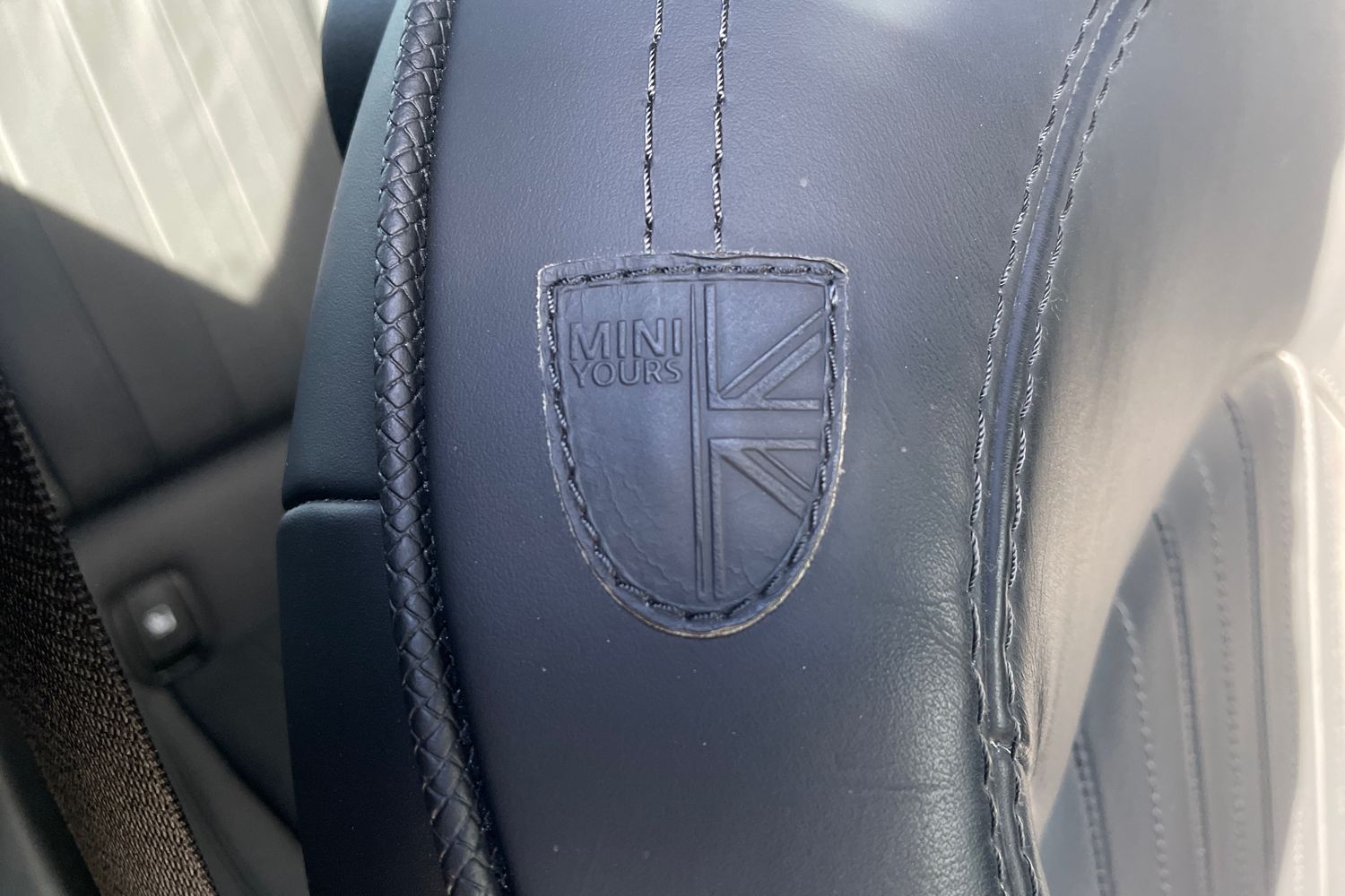 "Walknappa leather steering wheel with grey seam and MINI Yours badge on Piano Black lower steering wheel spoke"