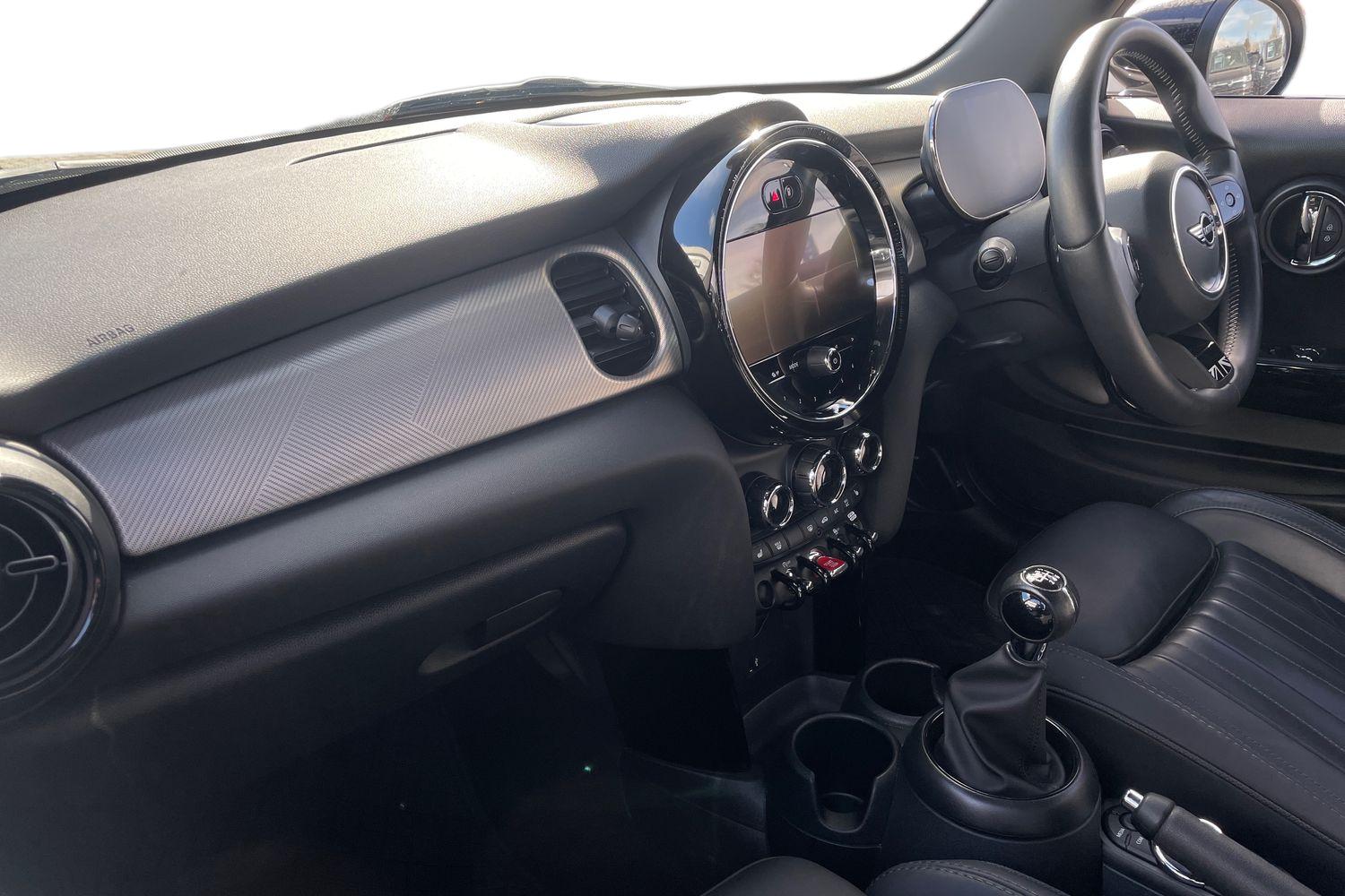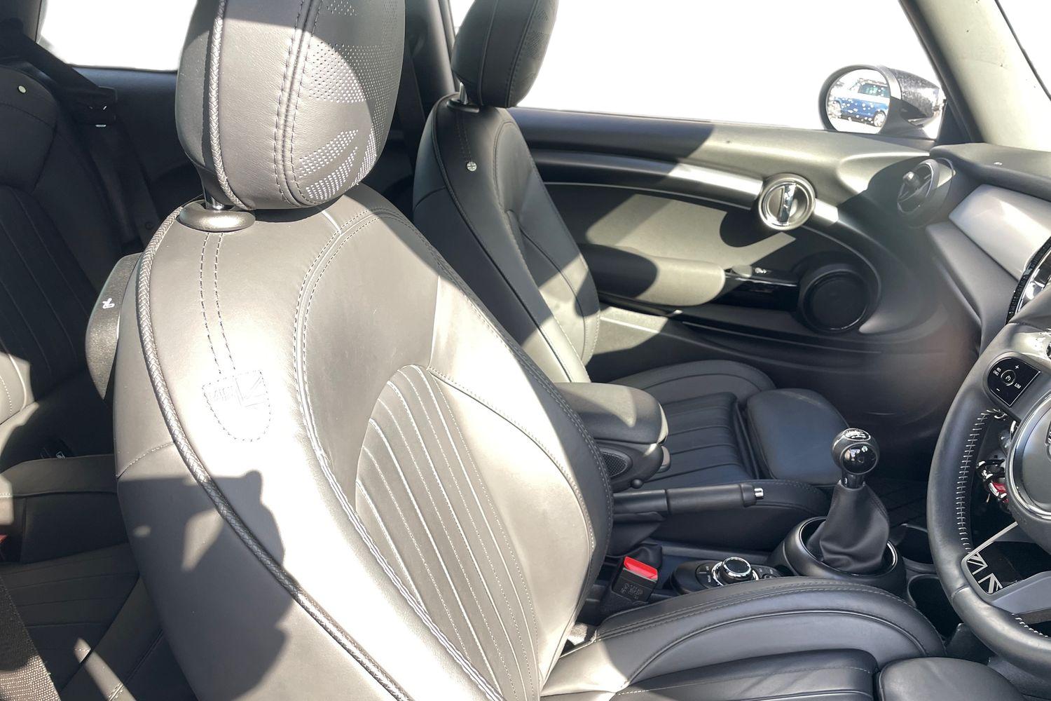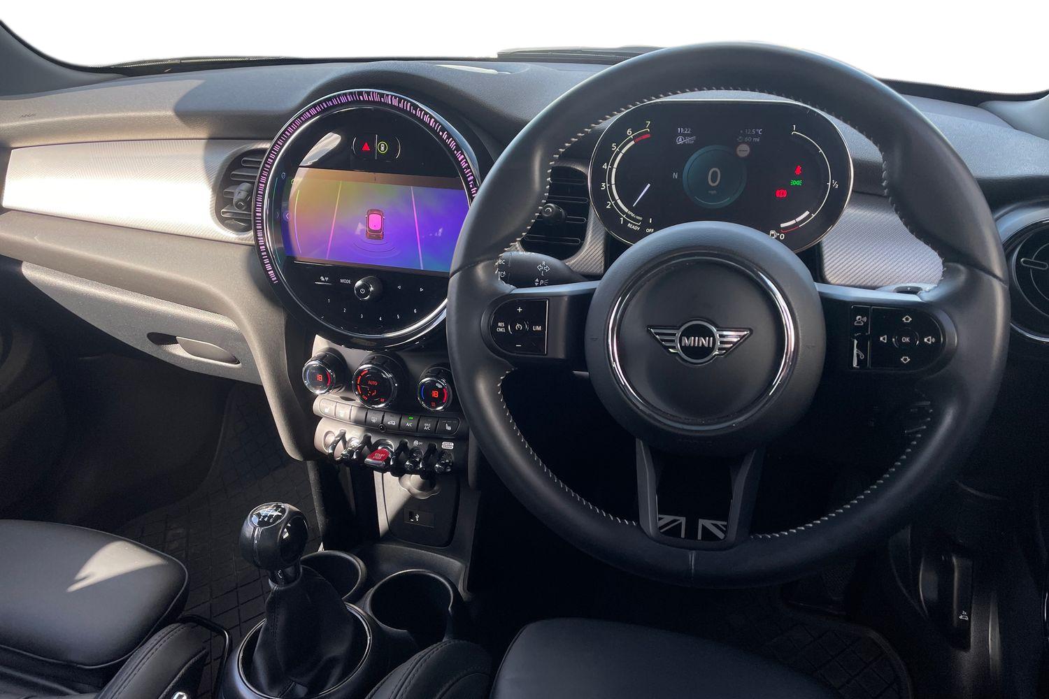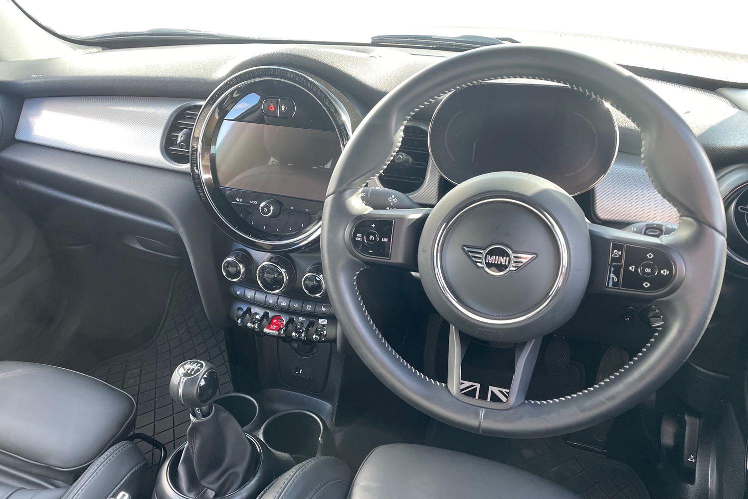 "Walknappa leather steering wheel with grey seam and MINI Yours badge on Piano Black lower steering wheel spoke"