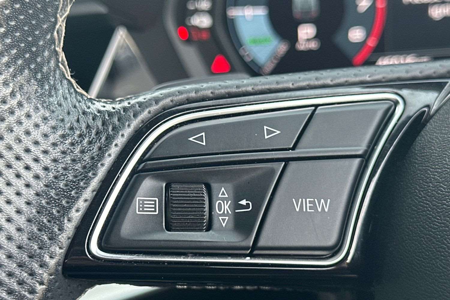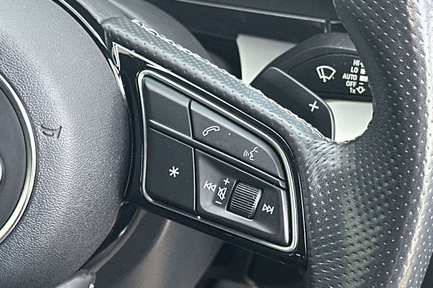 "3 spoke flattened bottom nappa leather multifunction steering wheel with perforated leather in grip area",