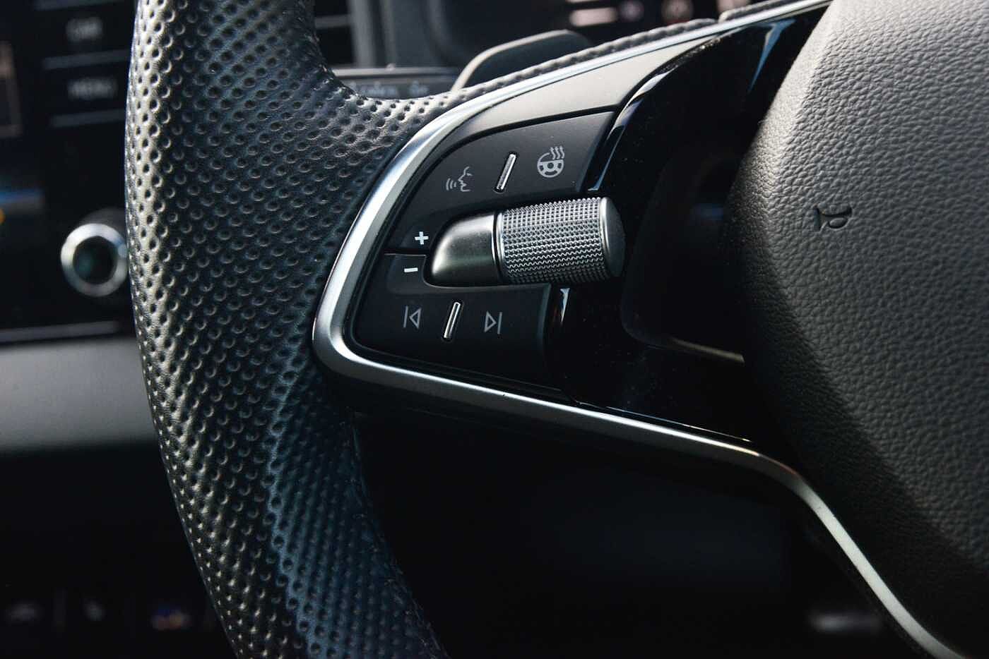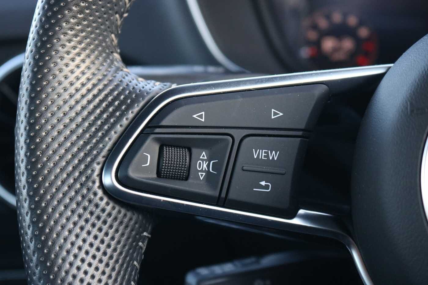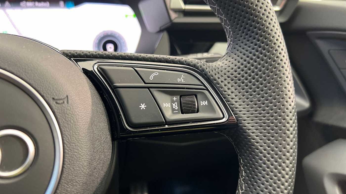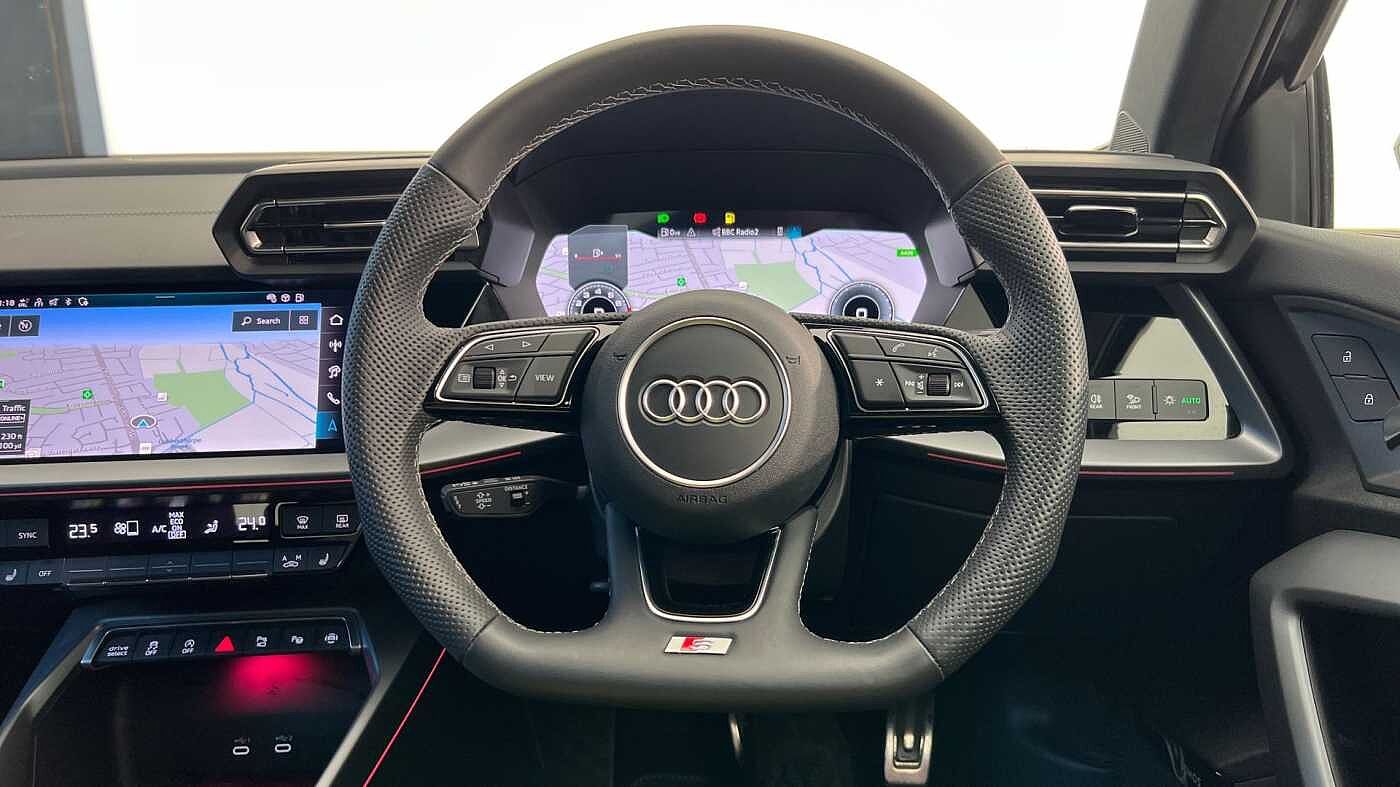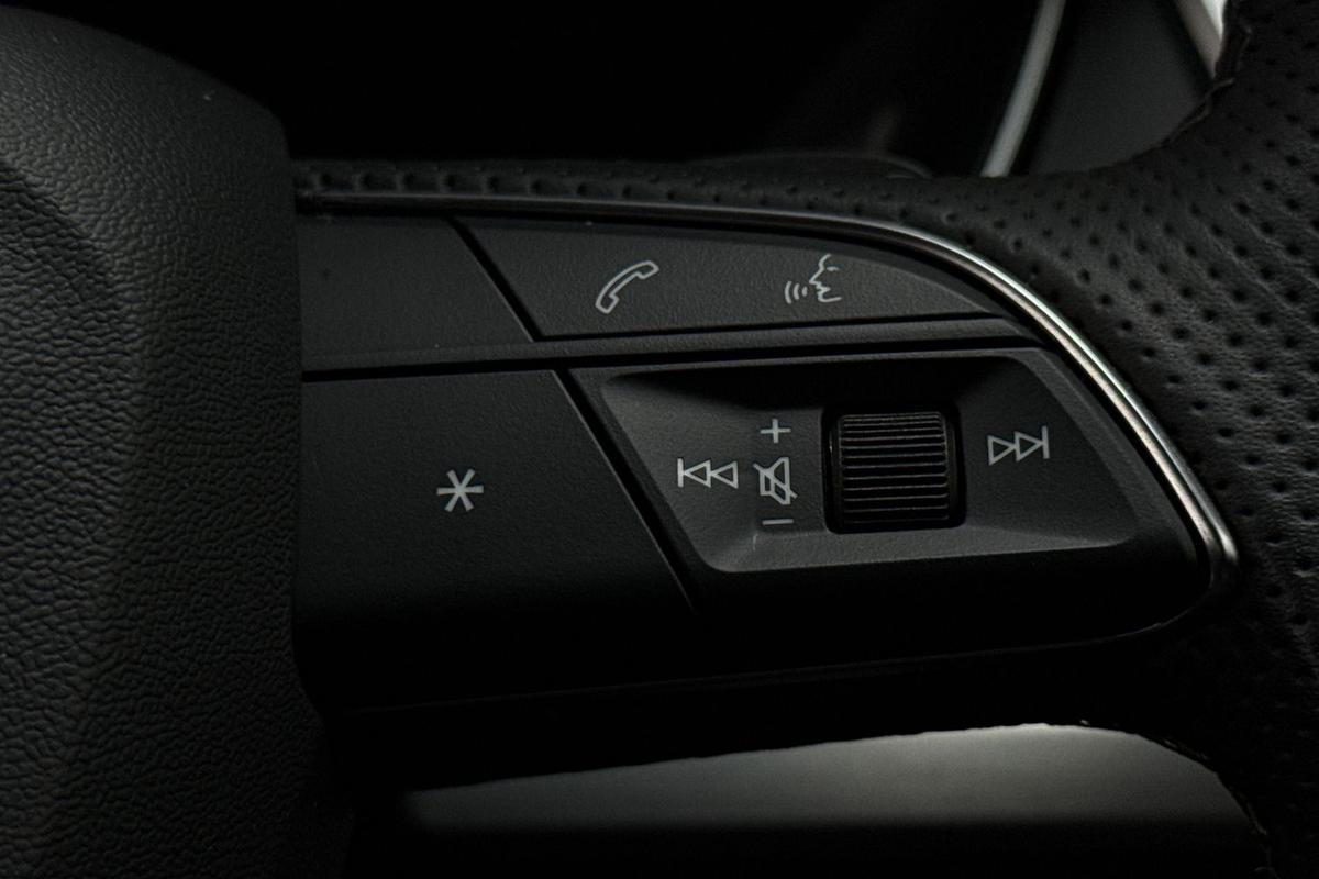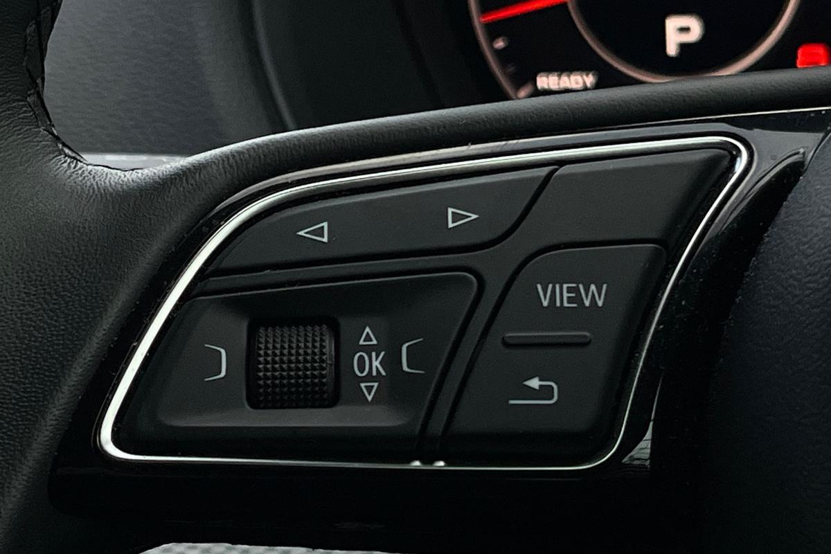 "3 spoke leather multifunction steering wheel with S badging perforated leather grips",