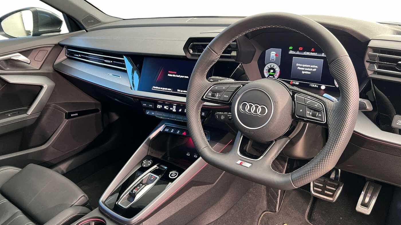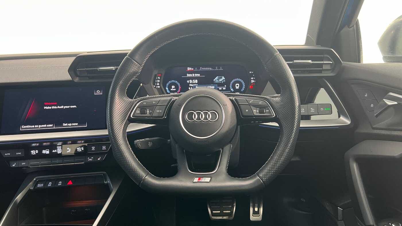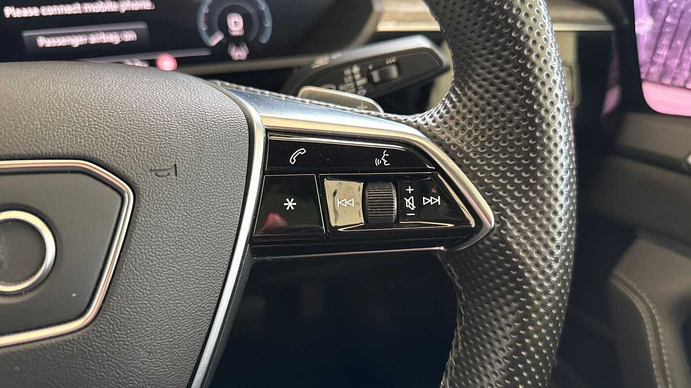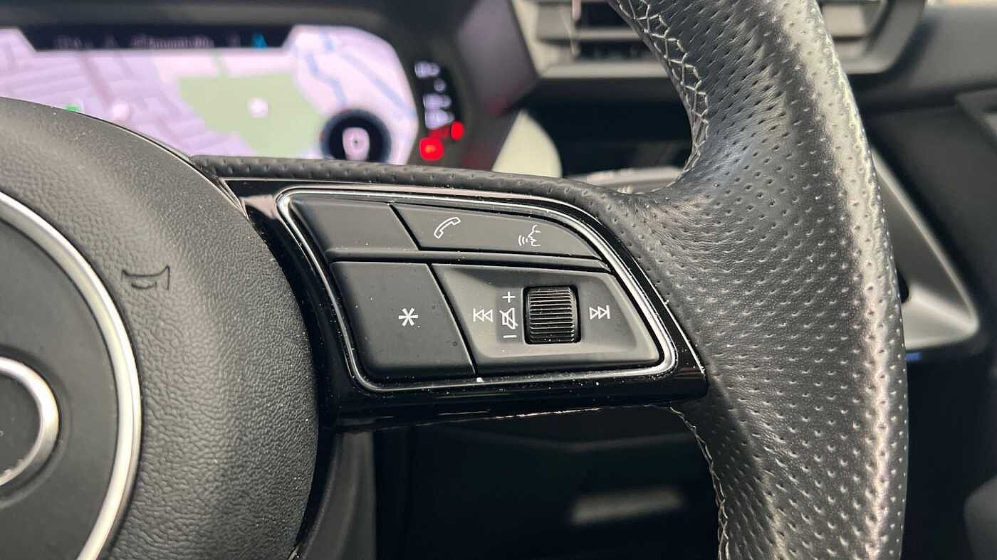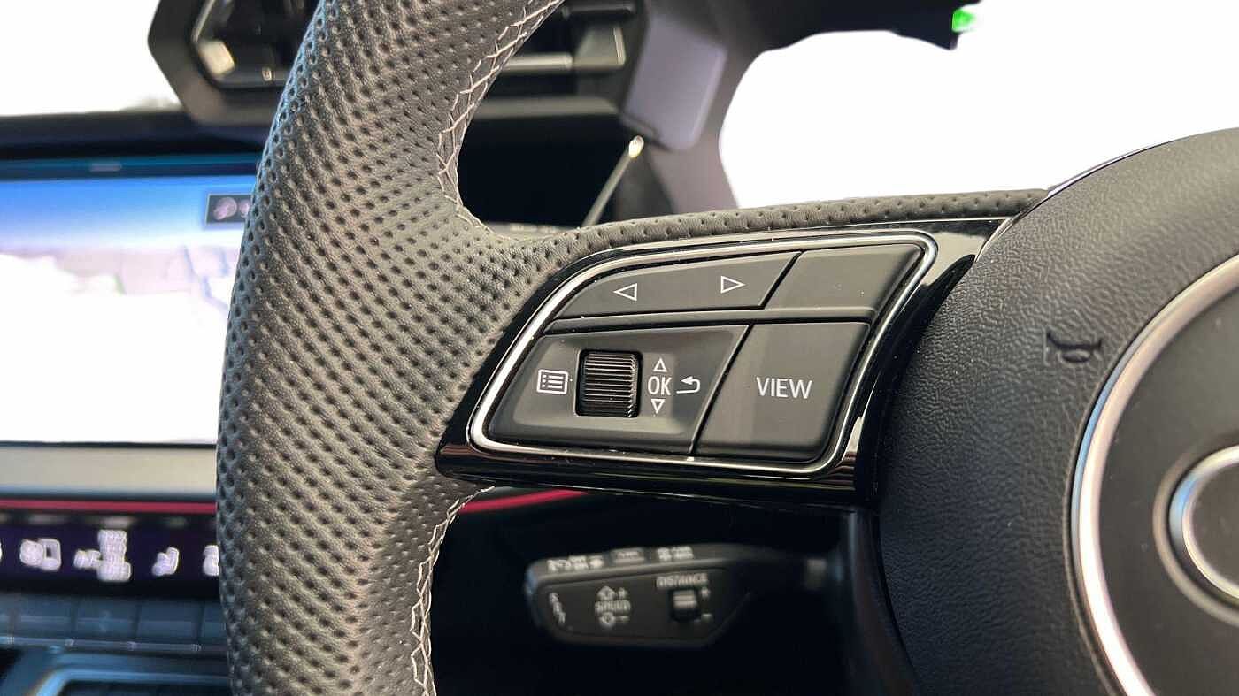 "3 spoke leather multifunction steering wheel with S badging perforated leather grips",