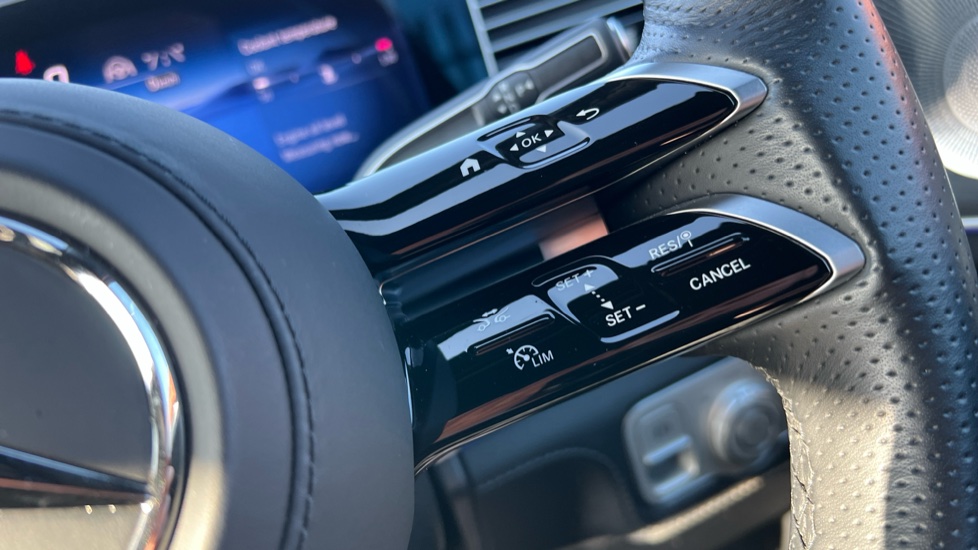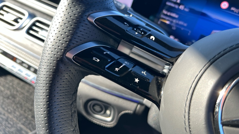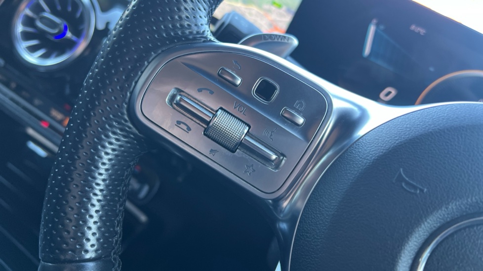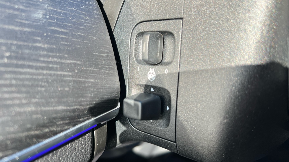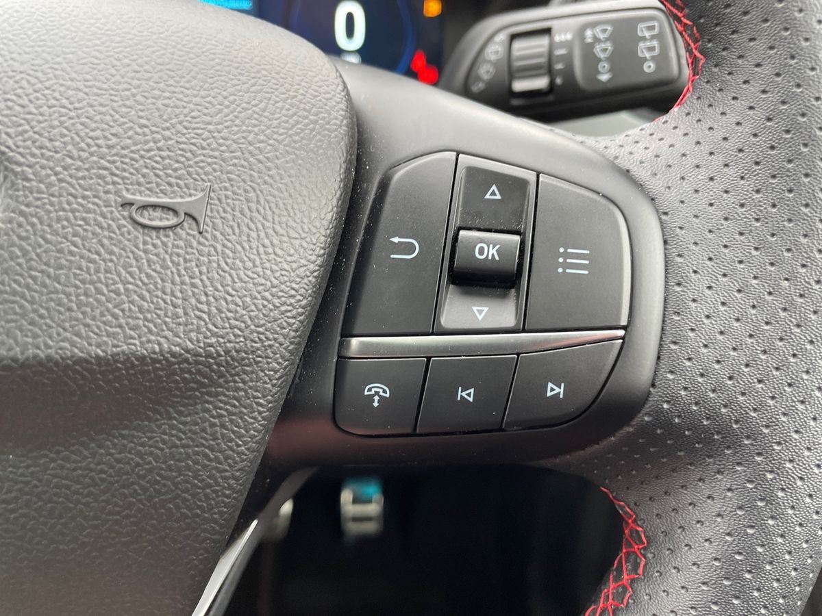 "Leather trimmed three spoke multifunction steering wheel and gear knob with blue contrast stitching",