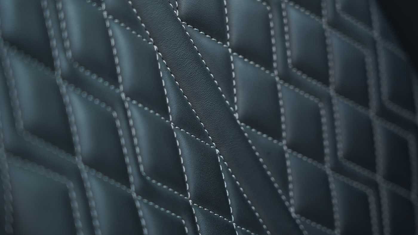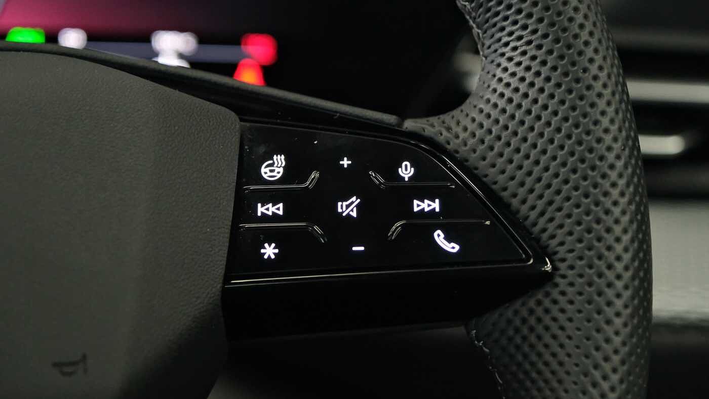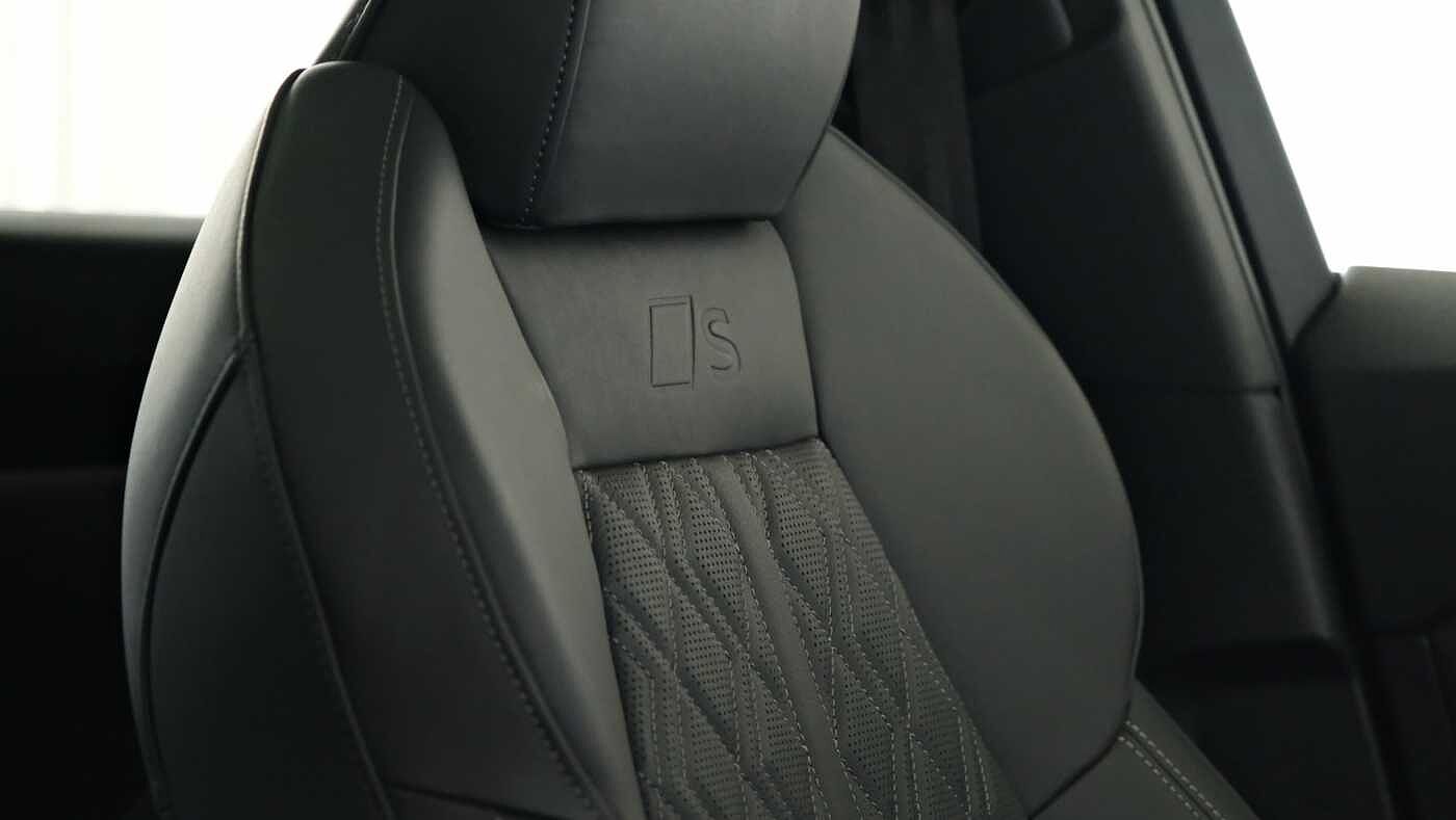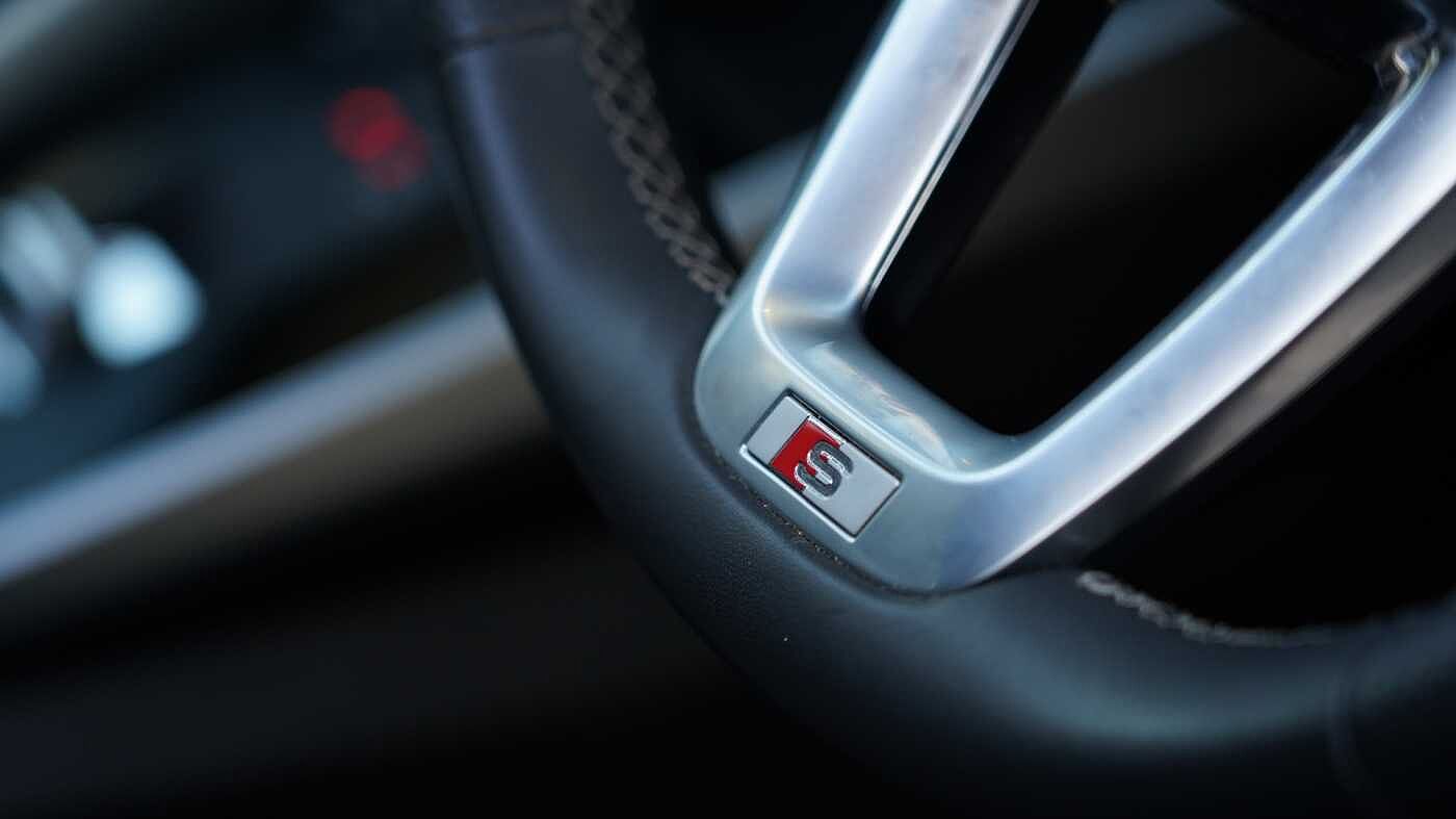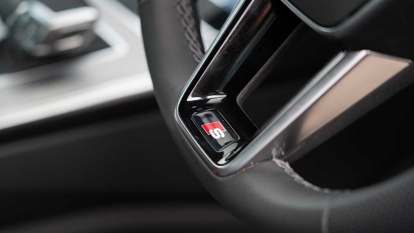 "3 spoke flat bottom multi-fun leather sport steering with gear shift paddle and S badge grip in perforated leather with contrast stitch in rock grey",