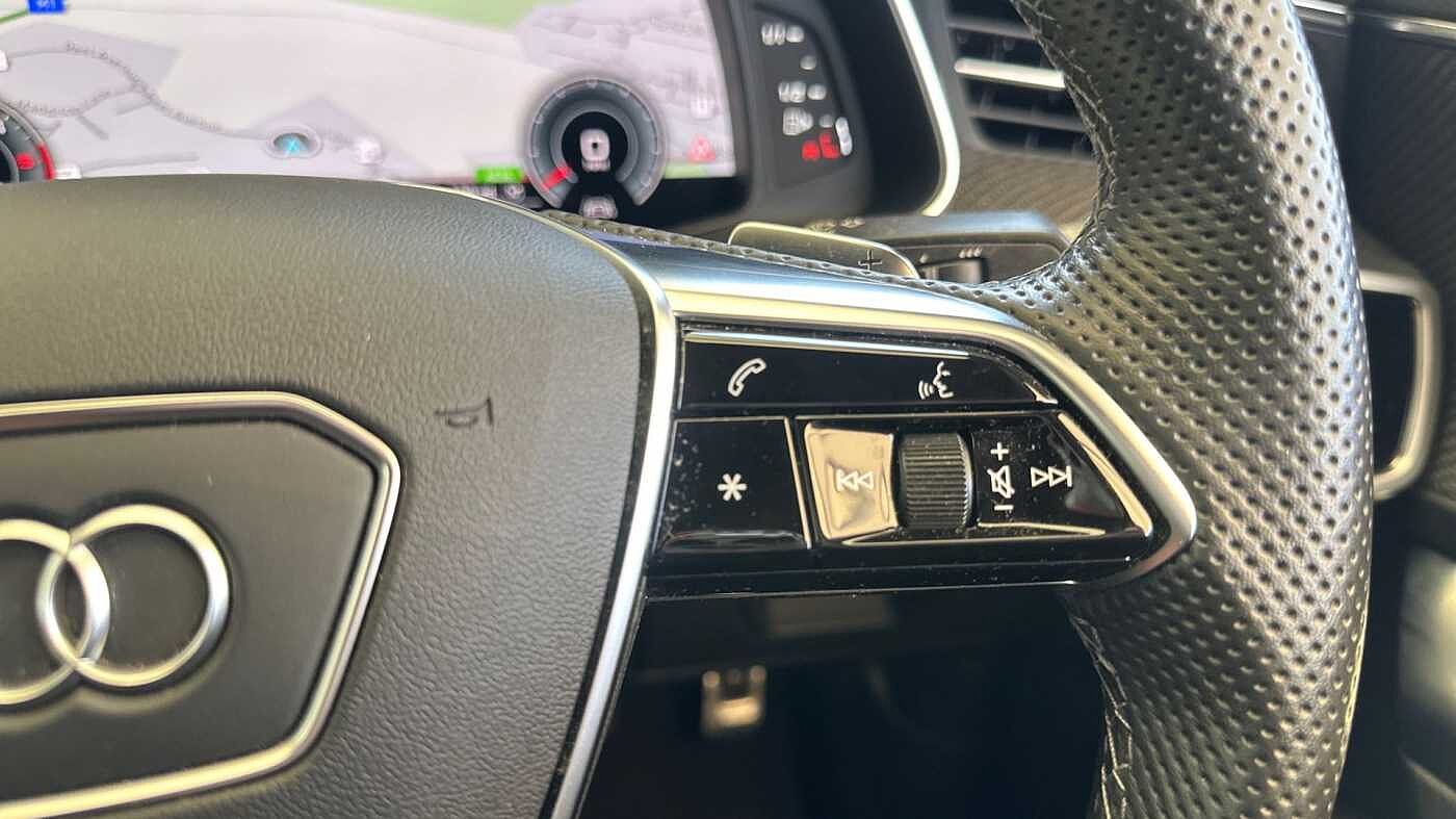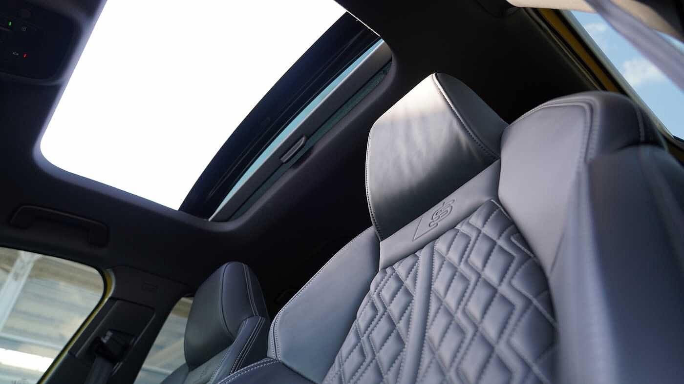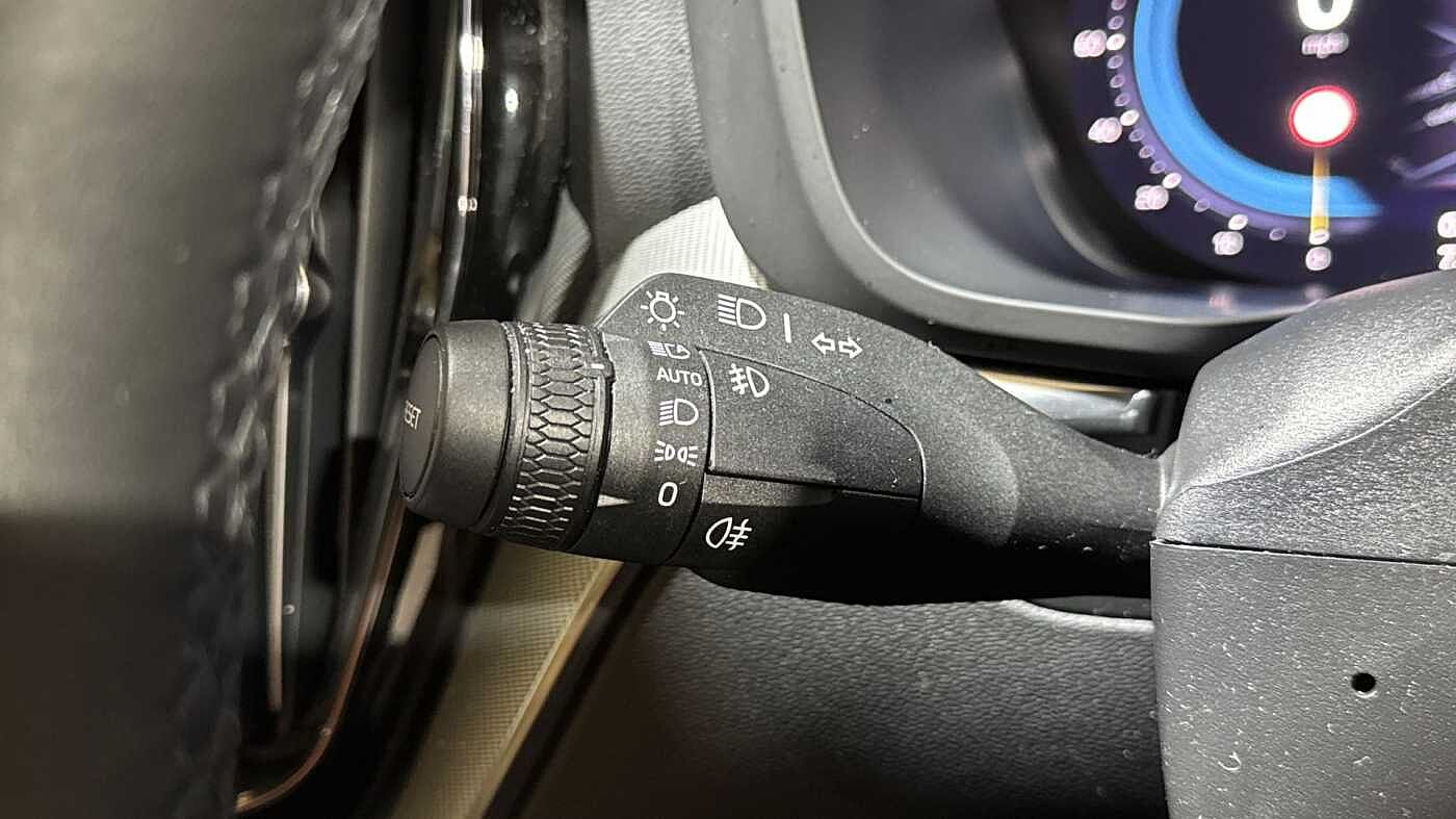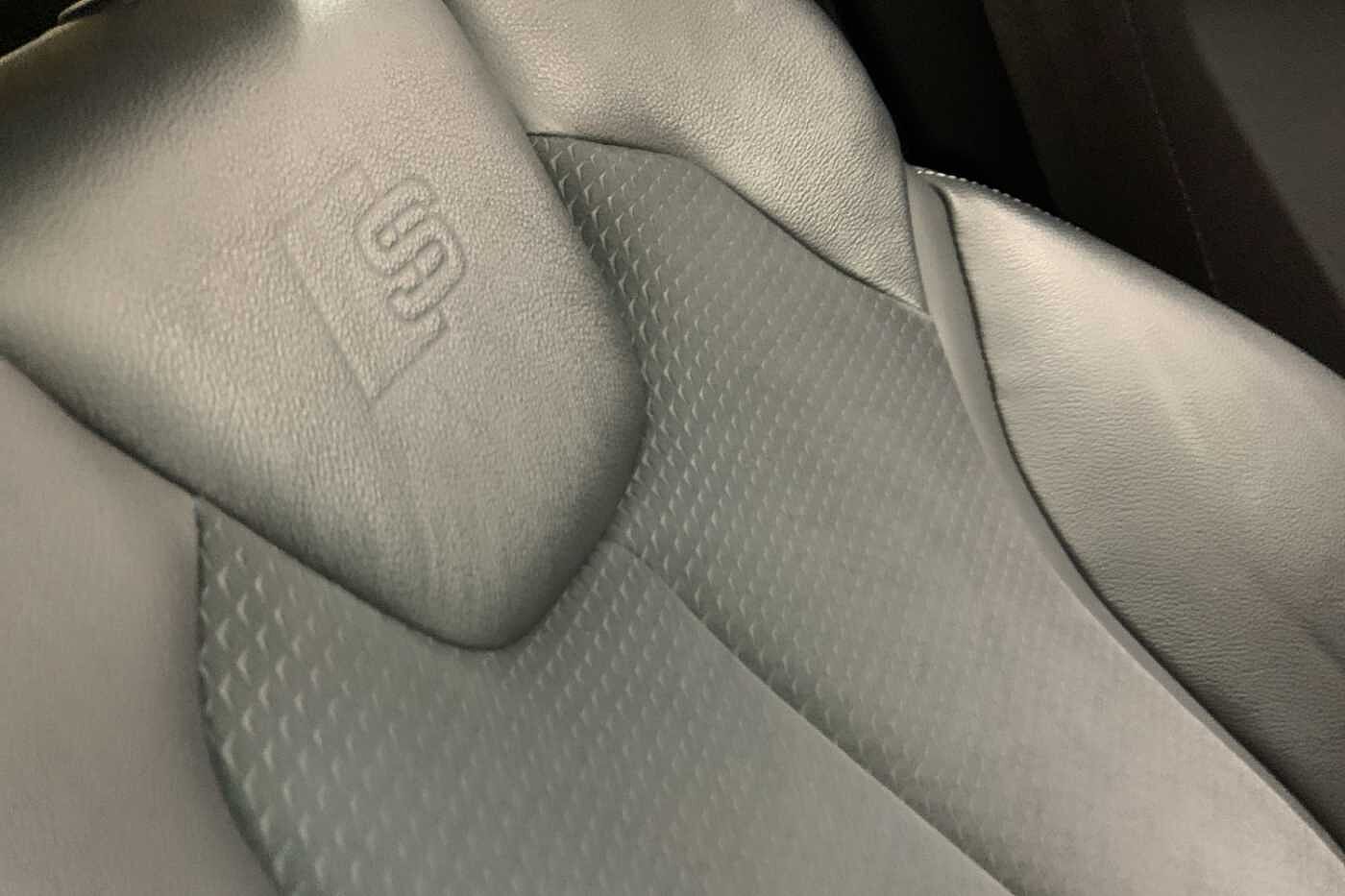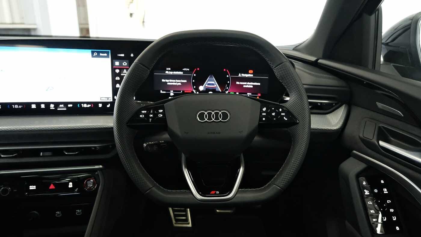 "3 spoke flat bottom multi-fun leather sport steering with gear shift paddle and S badge grip in perforated leather with contrast stitch in rock grey",