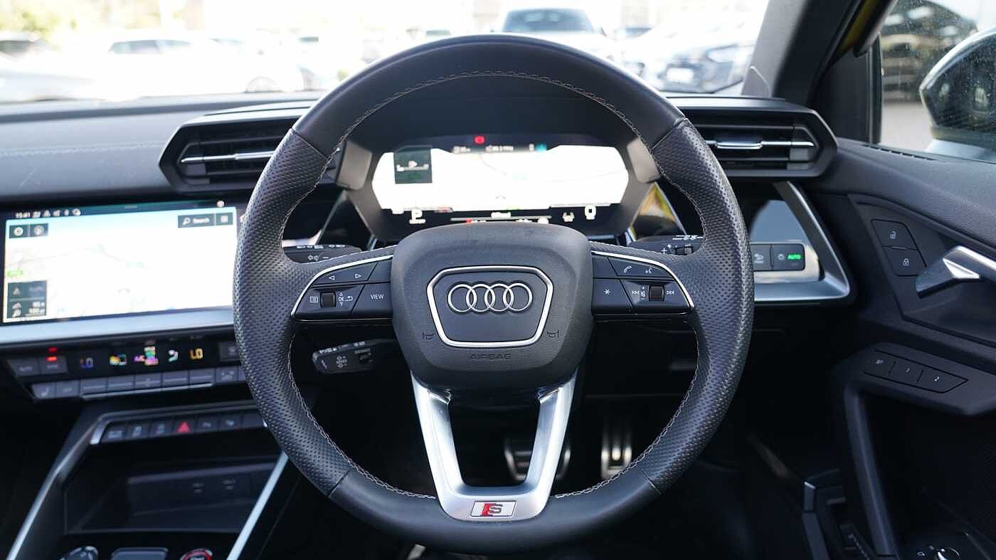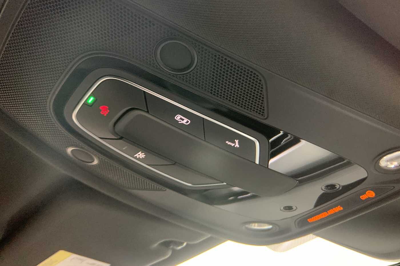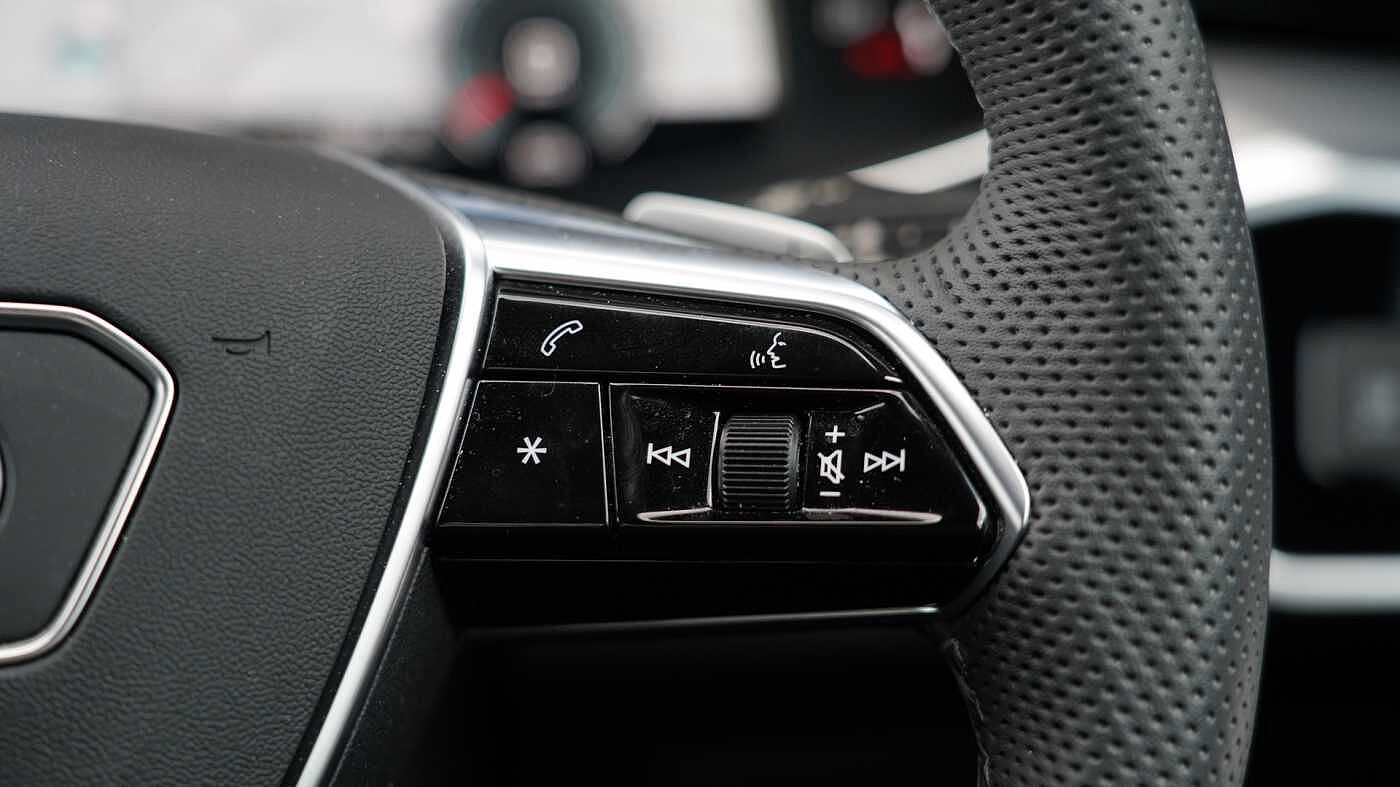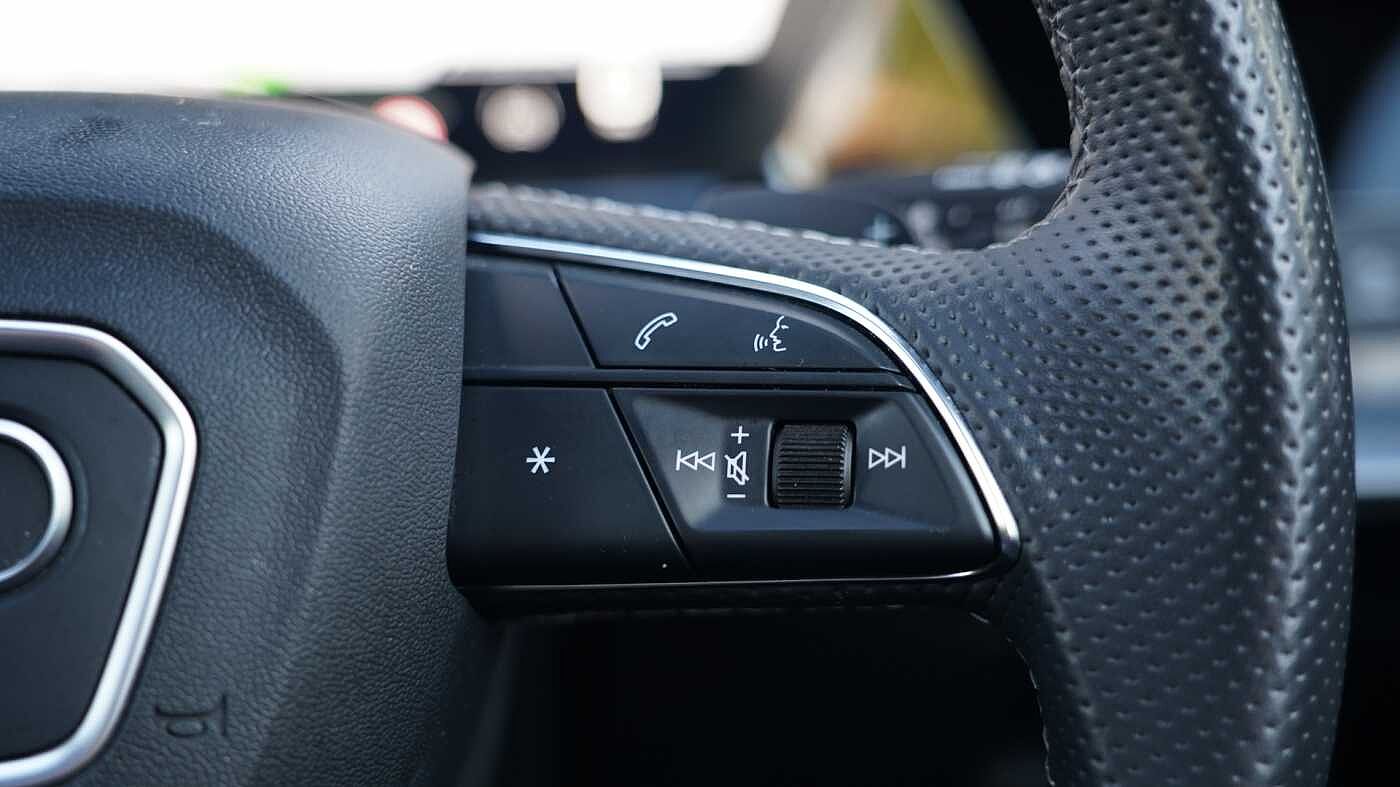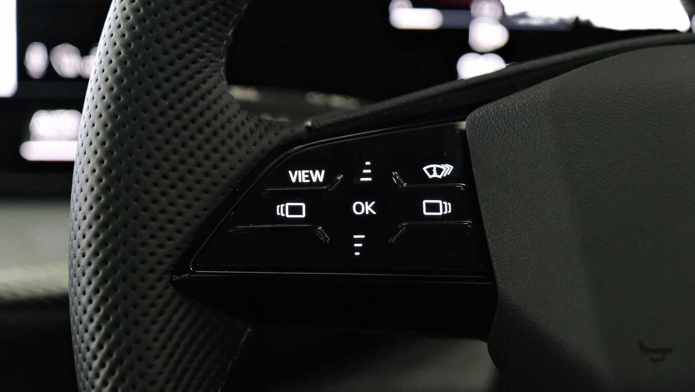 "3 spoke flat bottom multi-fun leather sport steering with gear shift paddle and S badge grip in perforated leather with contrast stitch in rock grey",