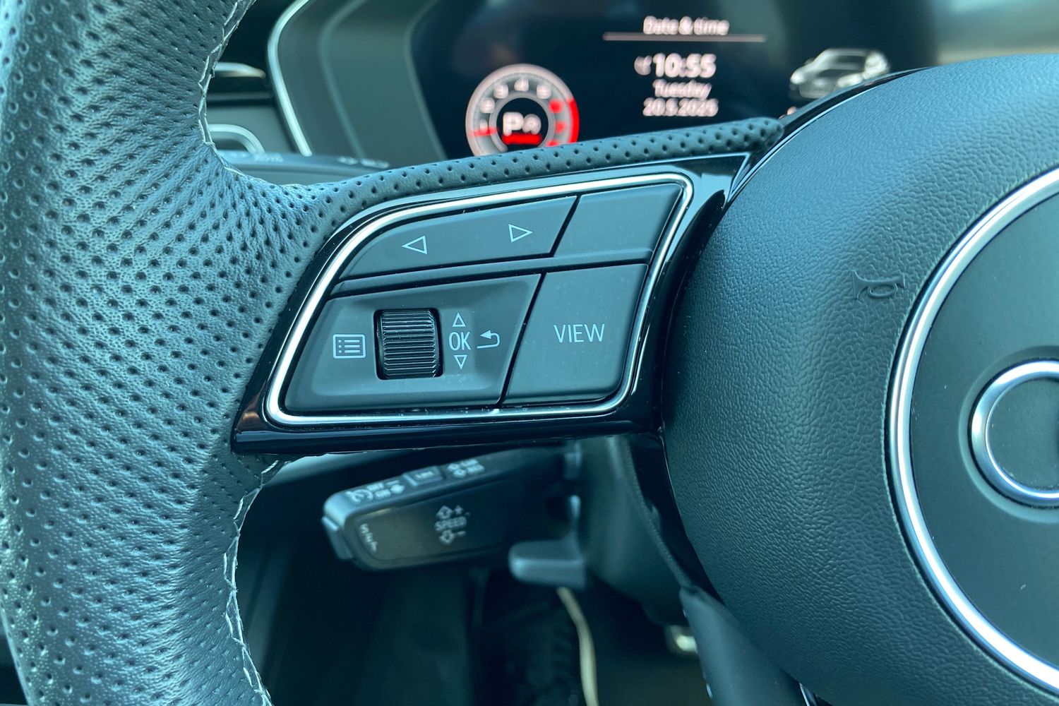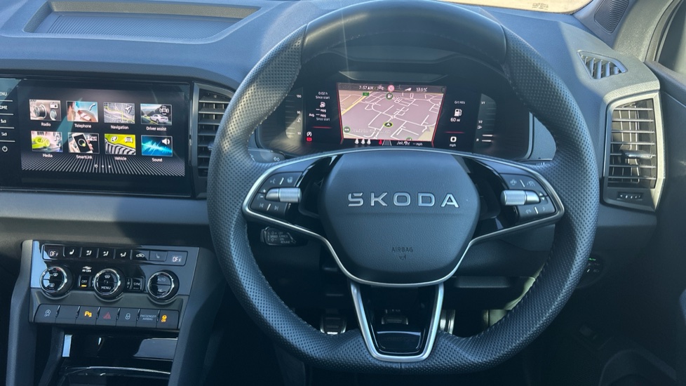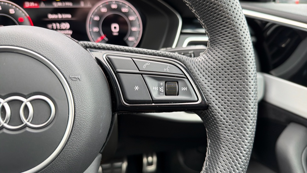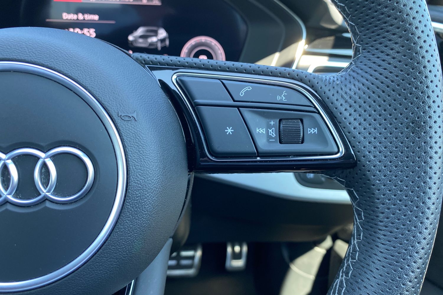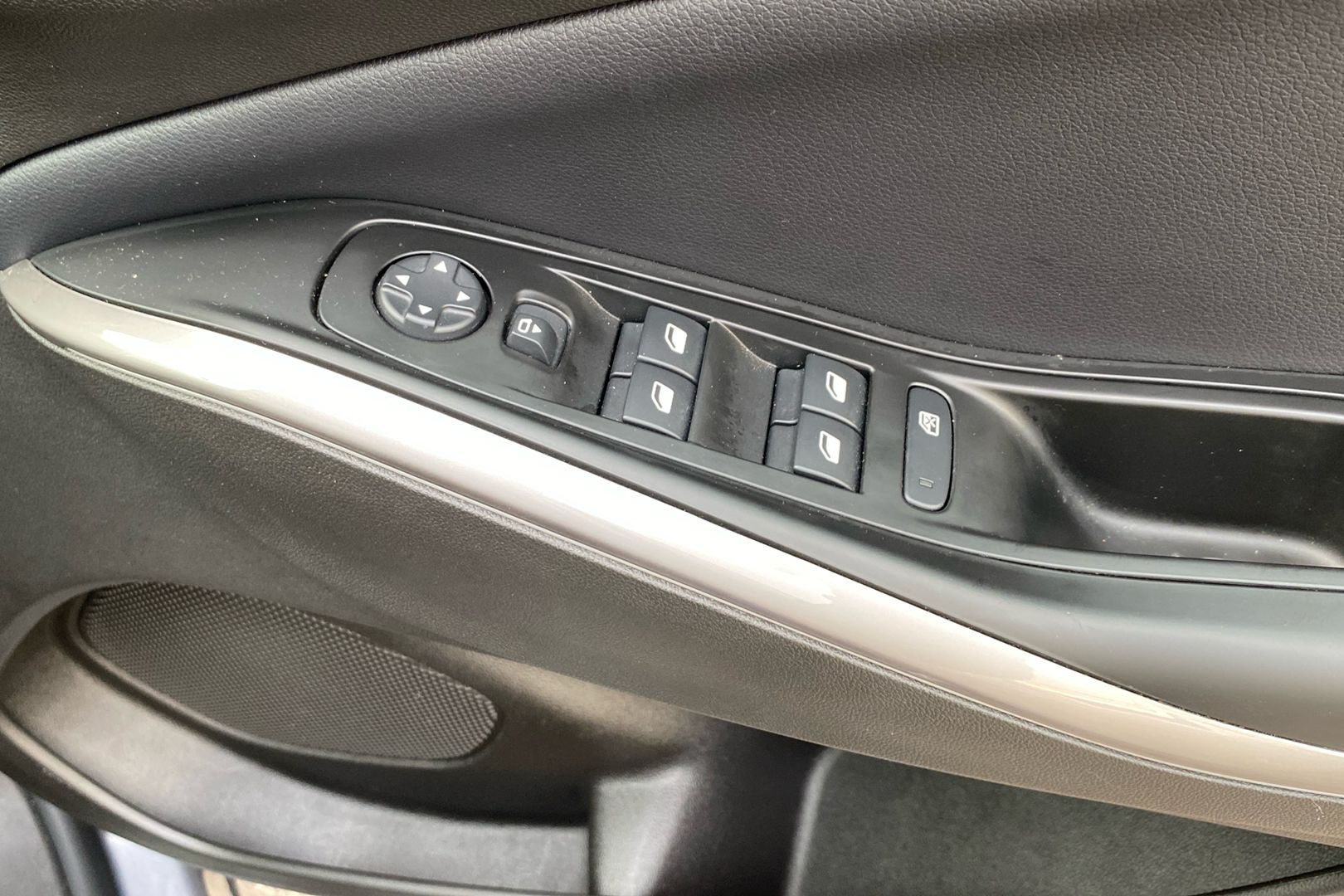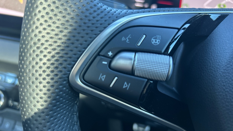 "Leather effect steering wheel with gloss black and chrome elements and integrated audio/telephone/cruise control/speed limit controls",
