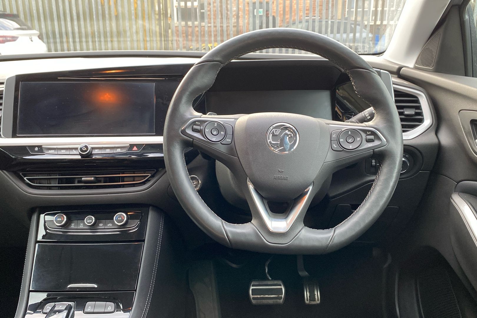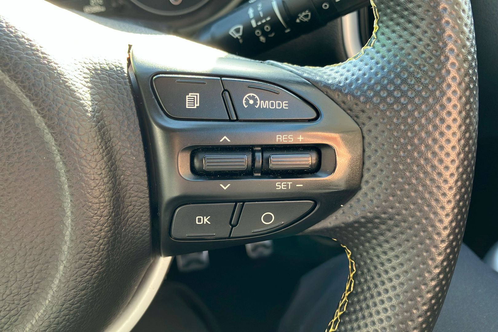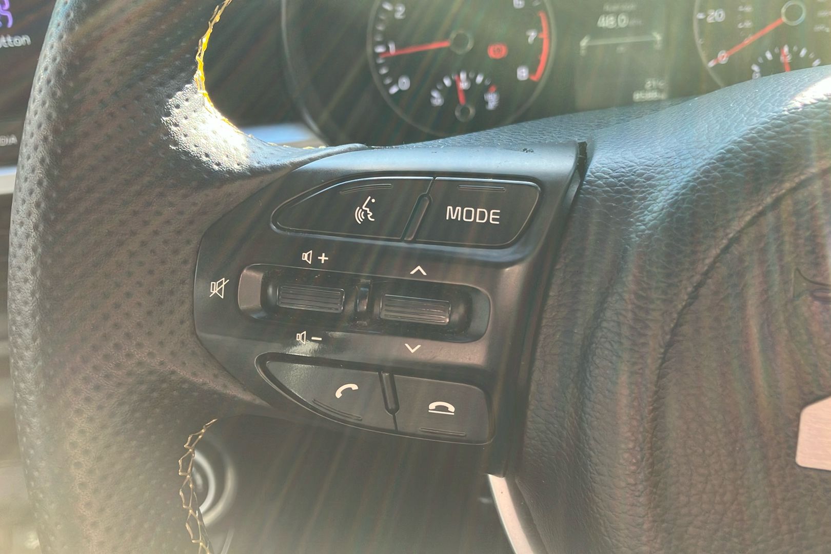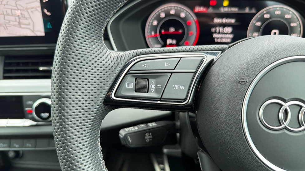 "Leather effect steering wheel with gloss black and chrome elements and integrated audio/telephone/cruise control/speed limit controls",