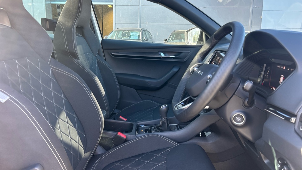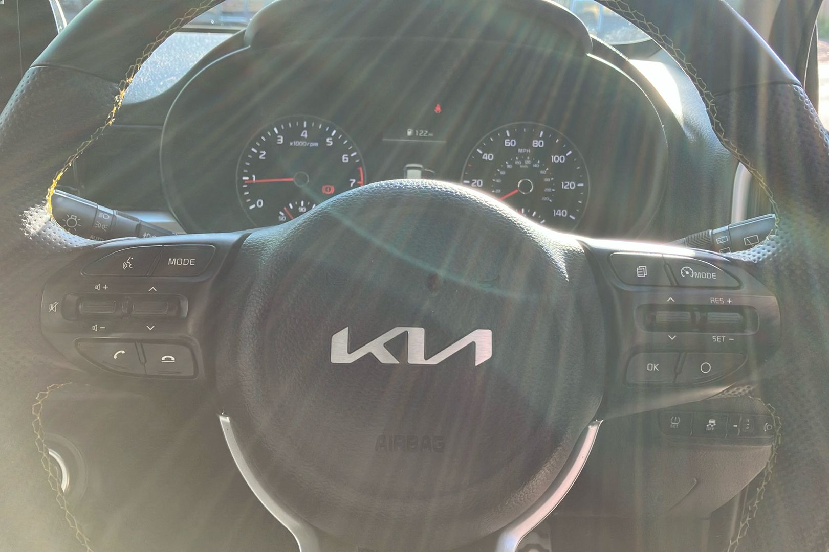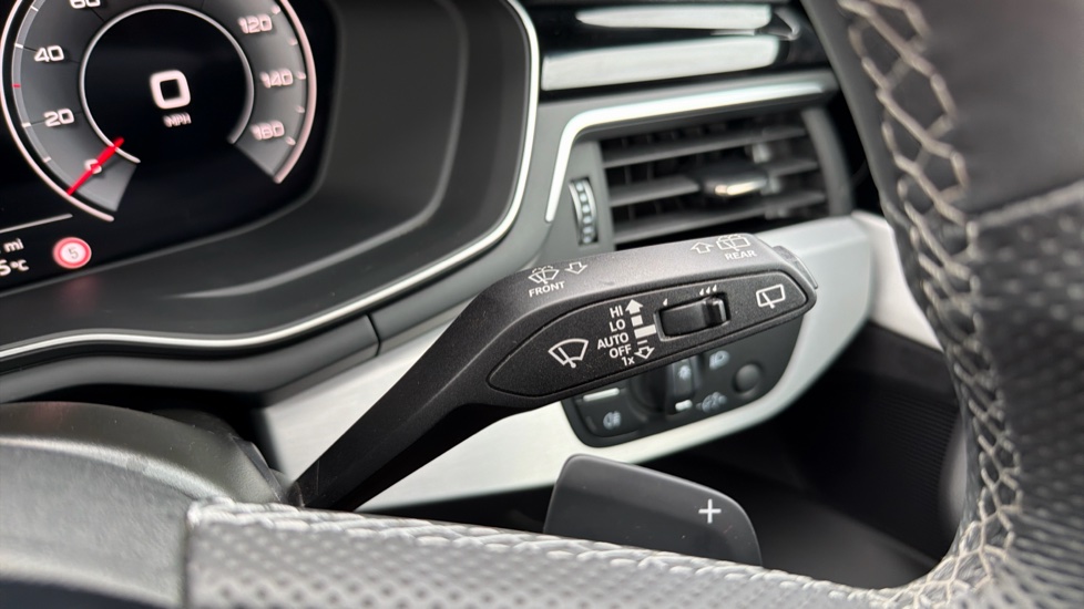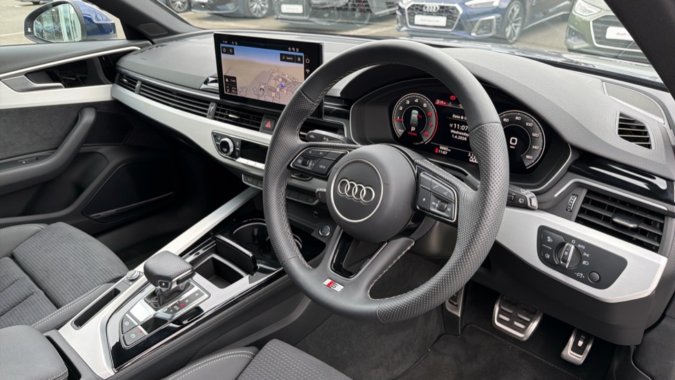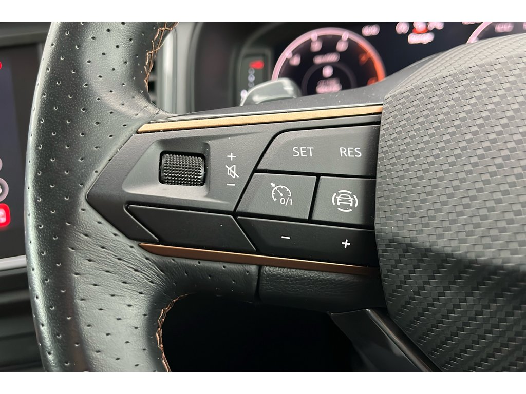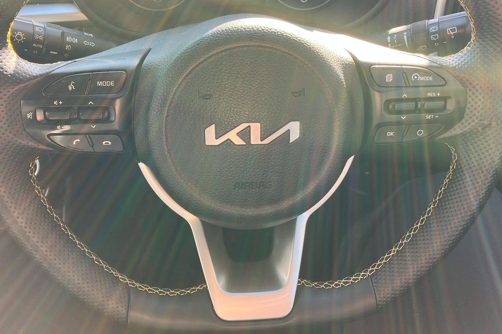 "Leather effect steering wheel with gloss black and chrome elements and integrated audio/telephone/cruise control/speed limit controls",