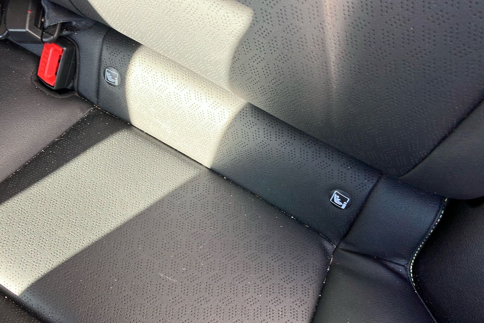"ISOFIX mounting on outer rear seats with top tether and labels indicating fixing points",