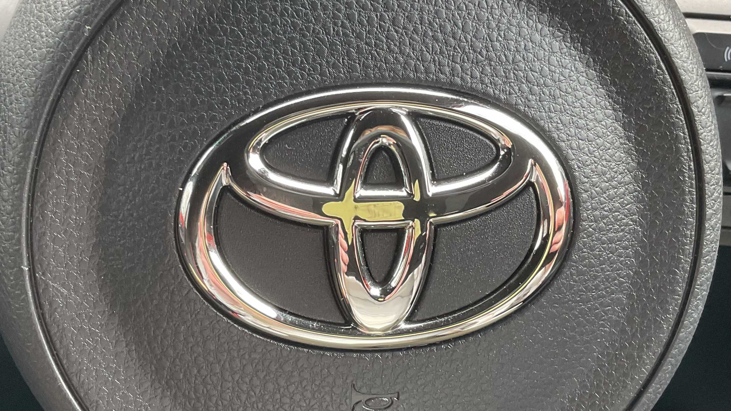 "3 spoke flat bottomed leather effect steering wheel with satin chrome effect bezel",