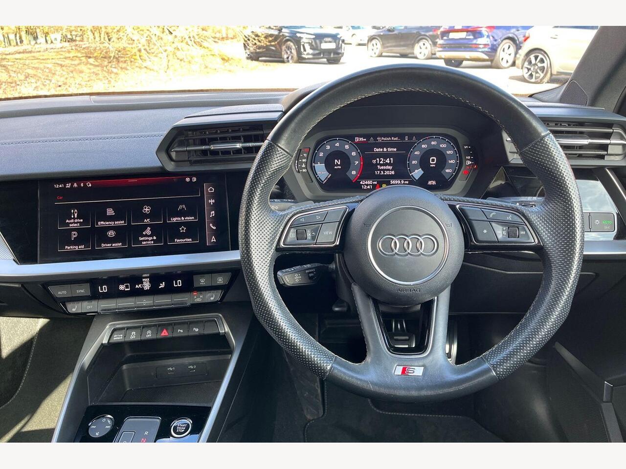 "features": "Audi drive select (Auto, Comfort, Dynamic and Individual), Audi smartphone interface, Audi Virtual Cockpit - 10.25\" digital and colour instrument cluster, Automatic start/stop system with recuperation, Bluetooth interface, Collision avoidance assistant, e-Call (emergency call), Electromechanical power speed sensitive steering, Lane departure warning system, MMI Navigation Plus with high resolution 10.1\" colour touch screen display, Service indicator, Trip computer, Voice control system with natural language interaction, 2xUSB-C connection with data and charging functions, 6 passive loudspeakers, DAB Digital radio, 3rd brake light, Acoustic glass windscreen, Aluminium window trim, Auto dimming frameless rear view mirror, Electrically adjustable/heated/folding/auto dimming door mirrors with integrated LED indications + kerb view function for passenger side, Front electric windows, Illuminated aluminium inserts front door sills with S logo, LED daytime running lights, LED headlights with LED rear lights and dynamic rear indicators, Light and rain sensors, Privacy glass - dark tinted rear window, rear door and side windows, Rear electric windows, Rear side air outlets in grained matt black, Rear side wing doors, Rear wiper, S line bumpers, S roof spoiler, 12V socket and storage compartment in front centre console, 3 seat bench in 2nd row, 40/20/40 split folding rear seat bench with cupholder, Black cloth headlining, Dual zone electronic climate control, Front and rear centre armrest in leather, Front and rear headrests, Front/rear floor mats, Height and reach adjustable steering wheel, Illuminated vanity mirror, Interior lighting - glove compartment light and right hand side, Luggage compartment floor covering, Manual boot compartment lid, Manually adjustable front seats, Seat side bolsters, Single front passenger seat, Stainless steel pedals and front footrest in black, Twin leather upholstery with front sports seats S embossed logo, Aluminium interior elements pack - A3 Sportback, LED interior lighting pack - A3 Sportback, S line styling pack - A3 Sportback, 3x3 point rear seat belts, Audi pre sense front, Driver and front passenger airbag with passenger airbag deactivation, Electronic Stabilisation Control (ESC) including ABS, ASR and EDL, First aid kit with warning triangle and 2 safety vests, Front side airbags with head airbags and interaction airbag, Pre-sense front with pedestrian and cyclist detection, Seatbelt monitoring, Tyre pressure loss indicator, Anti theft alarm, Anti-theft wheel bolts, Electronically operated child lock, Immobiliser, Remote control central locking, Accent surfaces in the dashboard and centre console in platinum grey silk effect paint finish, Dark spectrum aluminium inlays, ",