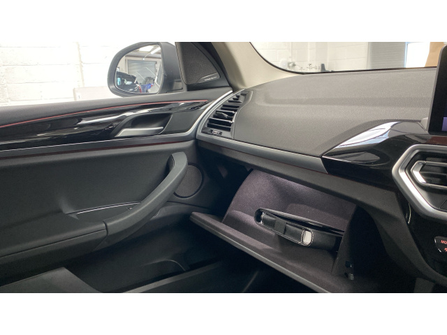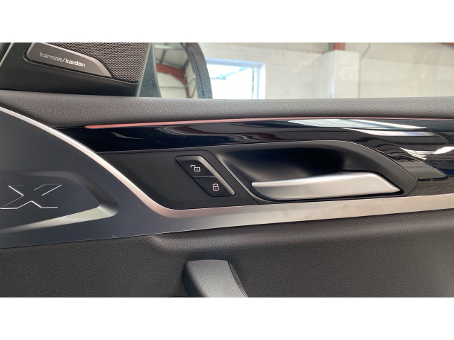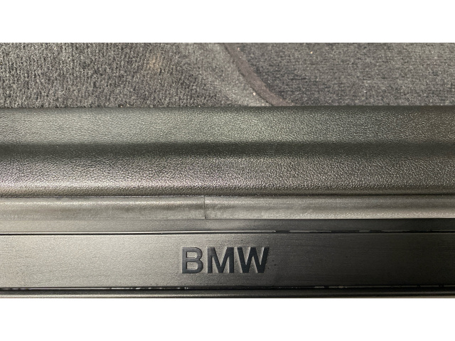 "Front door sill finishers in black plastic with M designation in metallic look",