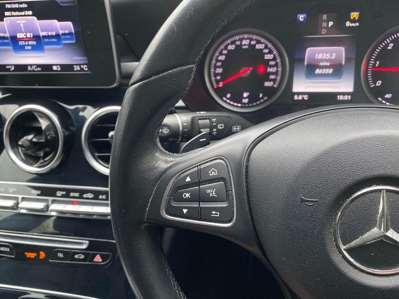 "features": "Active park assist with parktronic system, Attention assist, Bluetooth system, Collision prevention assist, Cruise control with speedtronic variable speed limiter, DYNAMIC SELECT with a choice of driving modes (ECO, Comfort, Sport, Sport+ and Individual), Garmin Map Pilot navigation system with SD card, touchpad and voice control, Multi function trip computer, Multifunction colour display, Outside temperature gauge, Power opening/closing tailgate, Remote boot release, Reversing camera, Service indicator (ASSYST PLUS), Speed sensitive steering, Agility control suspension with selective damping system, Diesel particulate filter, 2 USB ports in centre console, DAB Digital radio, Frontbass loudspeakers, Mercedes Audio 20 radio/single CD + telephone keypad, SD card slot, Adaptive brake lights, Body coloured bumpers, Chrome roof rails, Electric windows one touch open/close, Electrically adjustable and heated door mirrors, Green tinted glass, LED daytime running lights, LED tail lights, Radiator grille with integral star and 2 louvres in matt iridium silver, Rain sensor windscreen wipers, Rear wiper, Side windows surround in matt black, 2 cupholders in front centre console, 3 spoke leather steering wheel, 40:20:40 split folding rear seats, Artico man-made leather upholstery, Auto Mercedes-Benz child seat recognition sensor, Dual zone automatic climate control, Electric front seat height adjustment, Front and rear head restraints, Front centre armrest with storage compartment, Gearshift paddles, Heated front seats, Height/reach adjustable steering column, Illuminated glovebox, Load compartment cover, Lumbar support, Multifunction steering wheel, Rear top tether child seat ISOFIX attachment, Mirror pack - C Class, Seat comfort pack - C Class, Stowage space pack - C Class, 3 rear 3 point seatbelts, ABS with Brake Assist, Active bonnet, Adaptive brake system, Child proof door locks, Drivers knee airbag, Dual stage driver/passenger airbags, Electronic parking brake, ESP with ASR, Front passenger seat occupancy sensor, Front side airbags, Hill start assist, Rear seatbelt warning indicator, Tyre pressure monitoring system, Warning triangle and first aid kit, Window airbags, Alarm system/interior protection/immobiliser, Chrome surround in electric key, Remote central locking, Black high gloss trim, 17\" 5 twin spoke alloy wheels in vanadium silver, Tyre inflation kit, ",