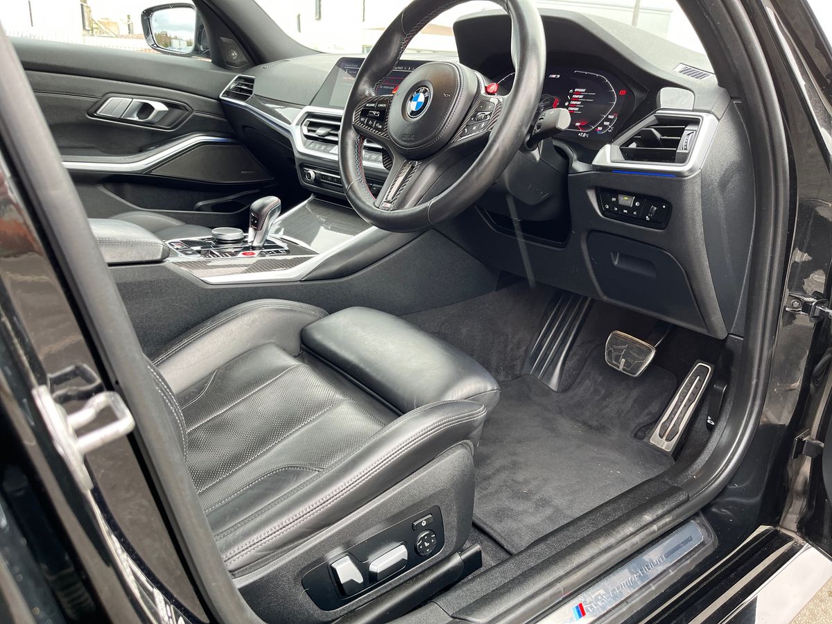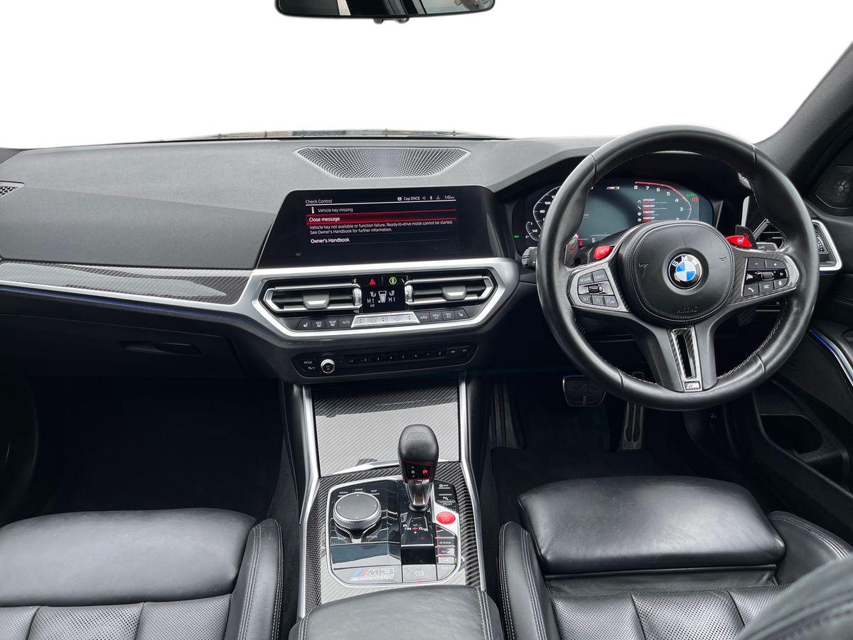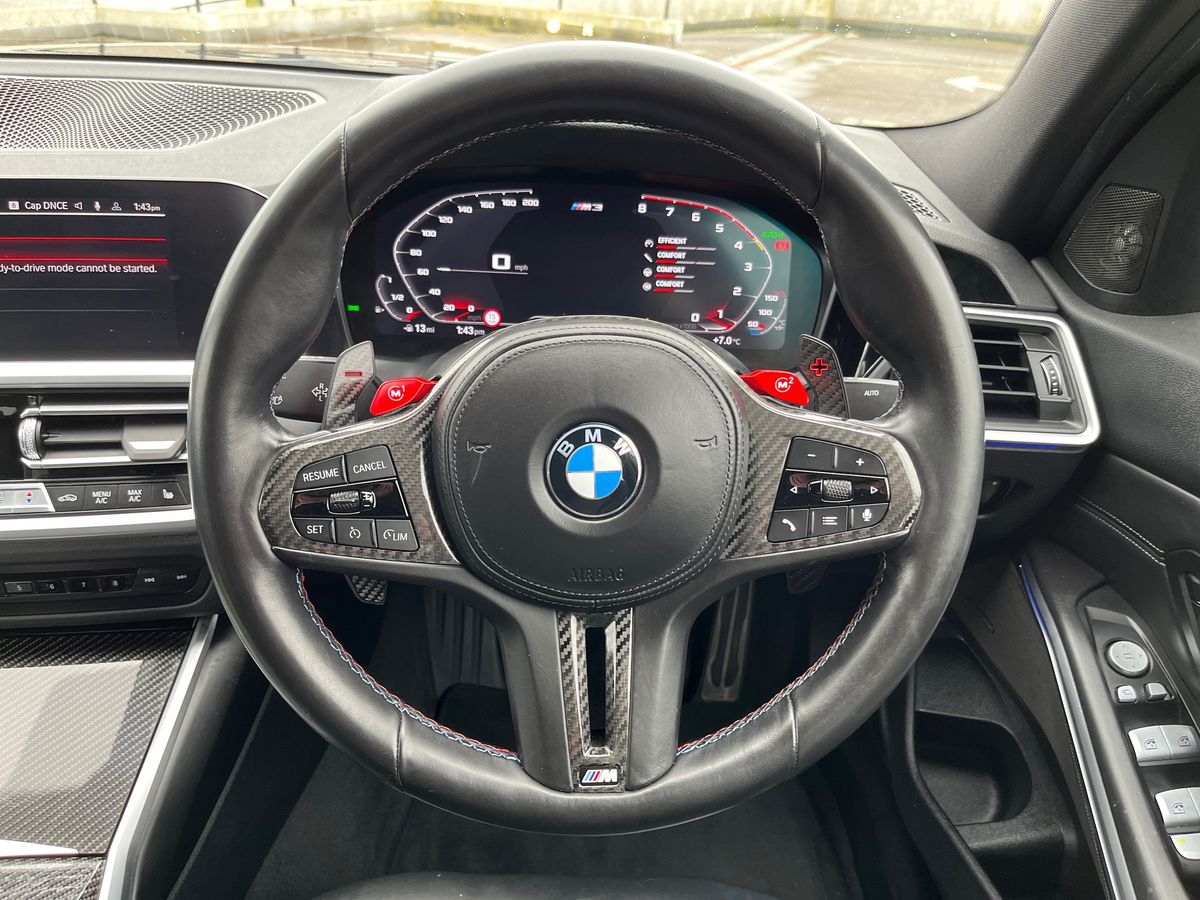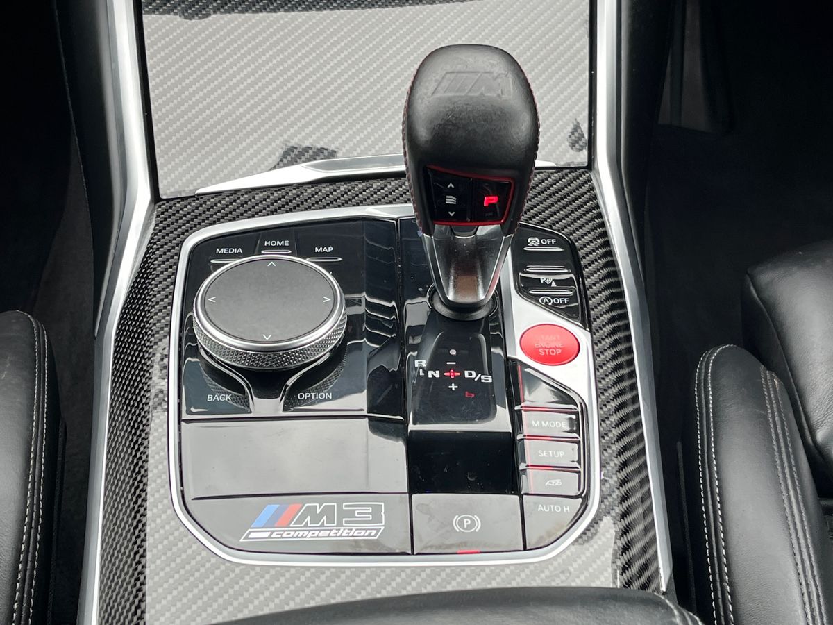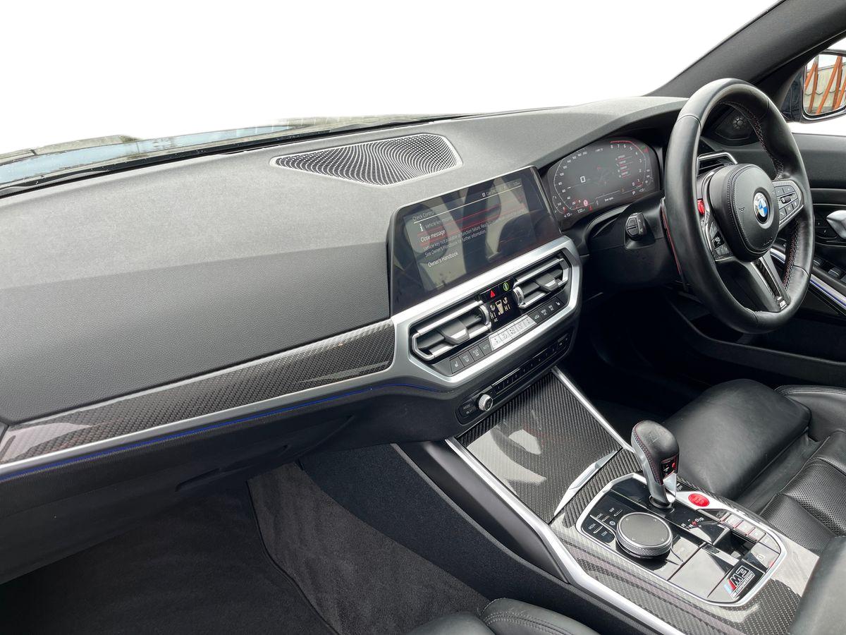 "features": "Active guard plus, Automatic start/stop system, Bluetooth functionality with Apple CarPlay/Android Auto, BMW iDrive controller on centre console, BMW legal emergency call, BMW Live Cockpit Professional sat nav system with 12.3\" instrument display and high resolution control display, BMW Online services, BMW Teleservices, Brake pad wear indicator warning light, Condition based service, Connected drive services, Door/boot open warning light, Driving experience switch, Electric Power Steering (EPS) with Servotronic, Instrument cluster with extended contents, Lights on warning, M drive buttons, Oil sensor for level and grade, warning by check control system, Oil temperature gauge, On board computer, On board diagnostics, Optimum shift indicator, Outside temperature display, Pull away assistant, Run flat indicator, Service interval indicator, Speed limiter, Widescreen display, Adaptive M Sport suspension, Double joint spring strut front axle, Electronic differential lock control (EDLC), M Drive Professional including track mode, laptimer, traction control & Drift analyser, M Sport differential, M steptronic sport transmission with drivelogic, Safety battery terminal clamp, 8 programmable favourite buttons, Auxiliary point for auxiliary devices, BMW professional radio/CD/MP3, DAB Digital radio, Harman/Kardon loudspeaker system, 3rd brake light, Acoustic glazing, Auto dimming driver's door mirror, Auto dimming rear view mirror, Automatic headlights + automatic windscreen wipers, Black chrome exhaust tailpipes, Black model designation badges, BMW emblem on engine compartment lid and tailgate, BMW high gloss shadow line with extended contents, BMW Individual shadowline lights, Body colour bumpers, Body colour door handles, Carbon fibre reinforced plastic (CFRP) roof, Day time running light, Door mirror integrated indicators, Door sill finishers with aluminium inserts, Dynamic brake lights, Electric adjustable heated door mirrors, Electric folding door mirrors, Electric front and rear windows with one touch/convenient open/close function, Follow me home headlights, Front and rear apron plastic in body colour, Front and rear bumper system, Headlight beam throw control, Heat protection, sun protection glazing, Heated rear window with automatic switch off, High beam assistant, High gloss black frameless kidney grille with M badge, LED number plate light, LED tail lights with 3D L-shaped LED light design, M designation, Mirror glass aspheric on driver's side, convex on passenger side, Rear boot, Rear fog lights, Rear reflectors, Rear right M3 competition inscription, Rear side wing doors, Reversing light, Shark fin roof aerial, Strakes in front side panel, black matt/black high-gloss, with model badge, Visible VIN plate, Welcome lighting, Windscreen wipers with integrated washing jets, 2 cupholders in front centre console, 2 x 12 V Power sockets (luggage compartment and front centre console), 2 x USB Type C ports for charging and data transmission in front centre console, 2 x USB Type C ports for charging in rear centre console, 3 folding rear headrests, 3 seat bench in 2nd row, Ambient lighting, Anthracite headlining, Battery in luggage compartment, Carbon fibre centre console incl. cover for cupholders, Carbon fibre decorative steering wheel finishers, Carbon fibre shift paddles, Carbon fibre strip in instrument panel on front passenger side, Centre console armrest with storage compartment, Compartment in front of cupholder, Driver/passenger sunvisors with illuminated vanity mirrors + covers, Electric front seats + driver memory, English handbook, Floor mats in velour, Footwell lighting, Front and rear door exit lights, Front door storage bins with bottle holder, Front interior light, Front isofix attachment + airbag deactivation, Front seat backrest width adjustment, Front seats lumbar support, Front/rear door armrests, Gearshift lever with embossed M badge, Heated front seats, Height adjustable front headrests, Interior mirror lighting, Isofix on 2nd row outer seats, Lockable/illuminated glovebox, Luggage compartment lighting, Manual 40:20:40 split folding rear seat with two tilt positions for backrest, Rake/reach adjustable steering wheel, Single front passenger seat, Storage compartment in rear doors, Storage tray and compartment with cover in centre console, Three zone automatic air conditioning, Through loading system, Toolkit located in luggage compartment, Wireless charging tray, Additional storage compartment pack - M3, Connected package professional - M3, High gloss shadowline exterior trim pack - M3, 3 point seatbelts on all seats, ABS/EBD, Automatic Stability Control (ASC), Brake energy regeneration, Brake fade compensation, Compound structure brake discs, Cornering brake control (CBC), Crash sensor, Driver/Front Passenger airbags, Dry braking, Dynamic brake control, Dynamic Stability Control with M Dynamic mode, Dynamic Traction Control - DTC, Electromechanical parking brake, Front and rear head airbags, Front seat side impact airbags, Front seatbelt pretensioners + load limiters, Hill start assist, M Sport seat belts, Rear child proof door locks, Seatbelt warning, Side impact protection, Two tone horn, Tyre pressure sensor, Warning triangle and first aid kit, Digital key, Electronic immobiliser, Remote central locking, Thatcham cat 1 remote alarm, Vehicle Key with 4 buttons including the integrated key, Galvanic finish to control surrounds, High gloss black interior trim, Tyre repair kit, ",