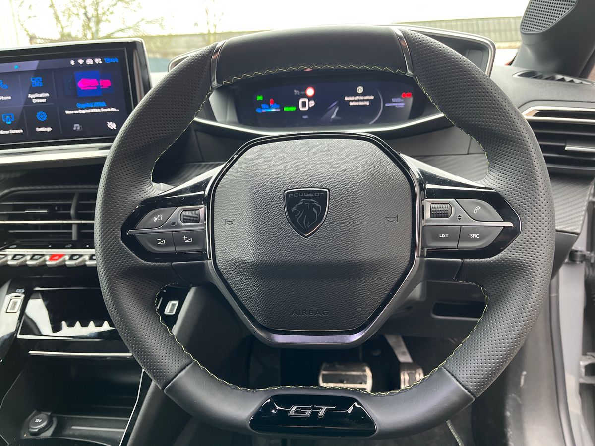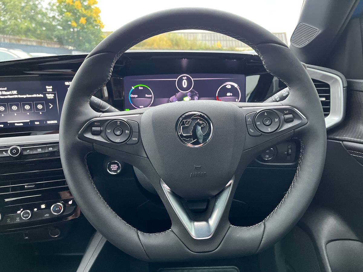 "Leather wrapped steering wheel with telescopic and tilt adjustment",