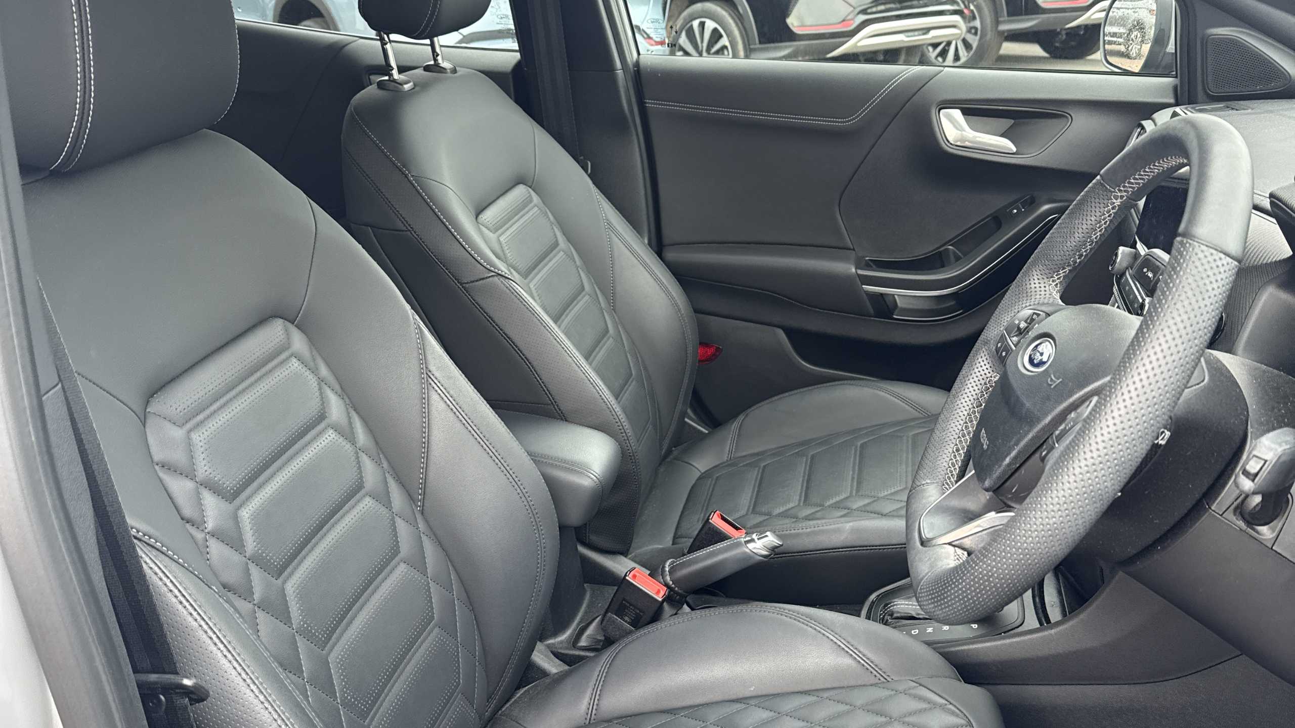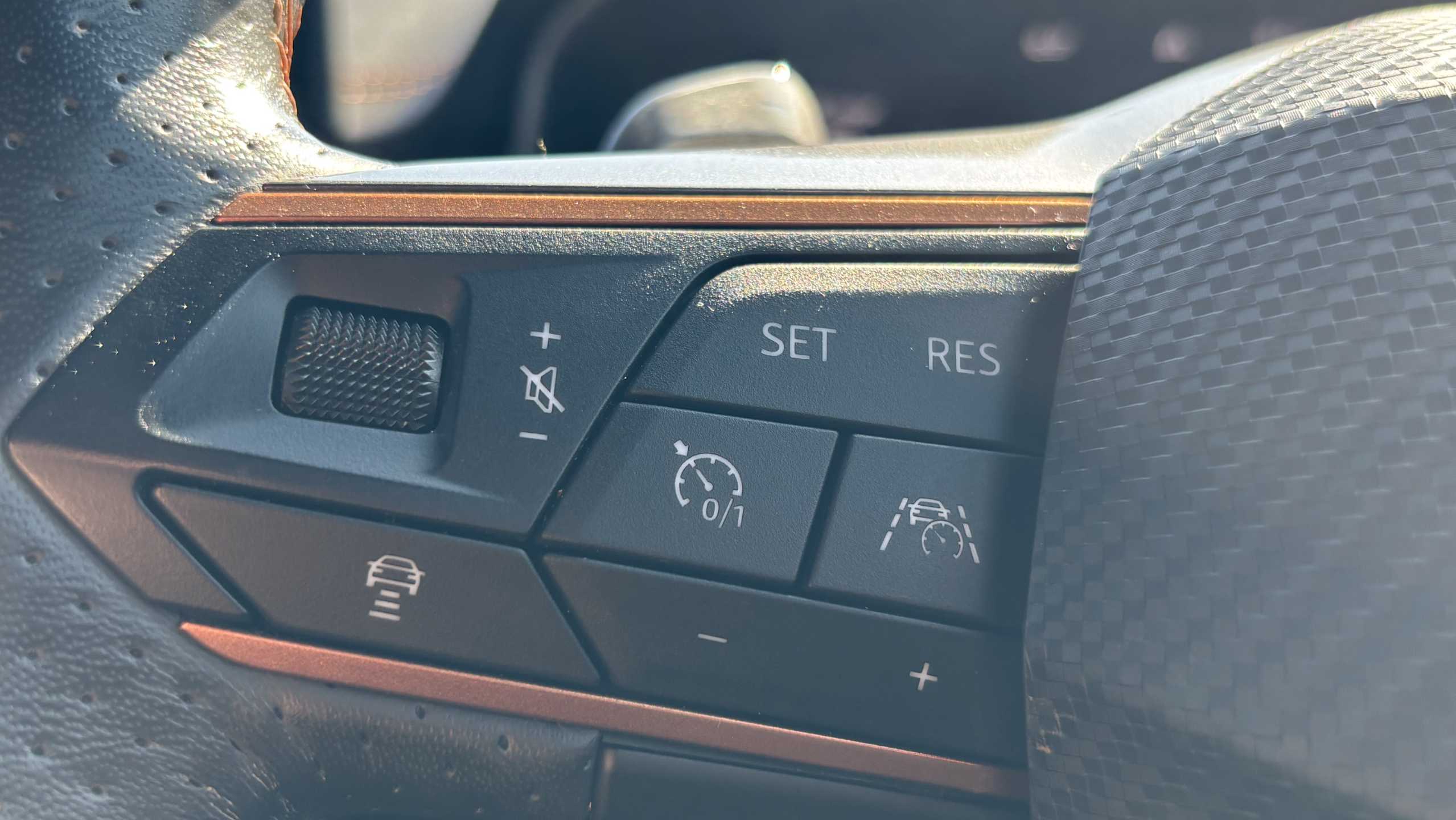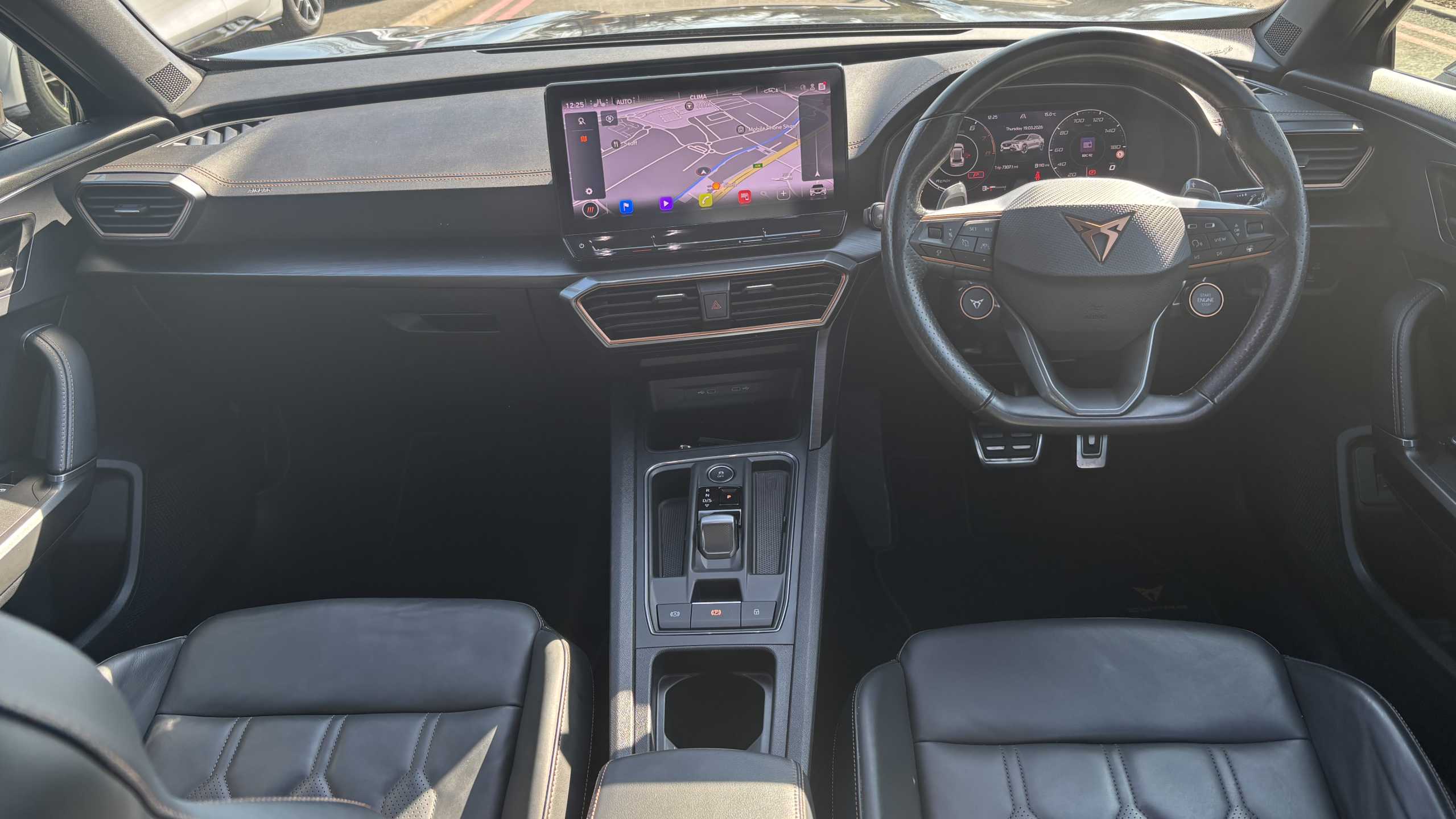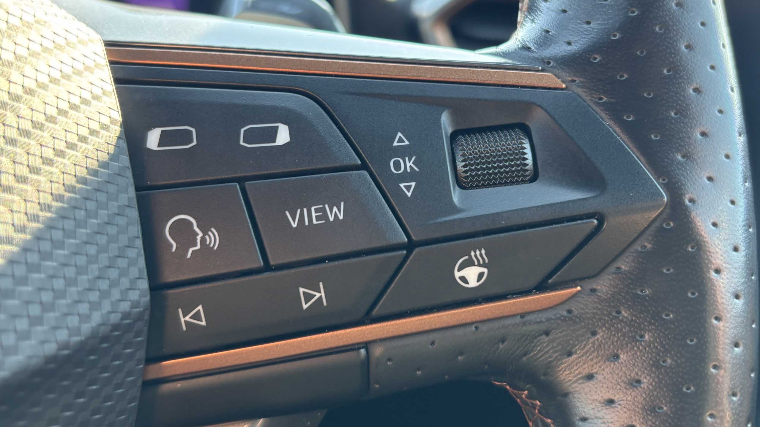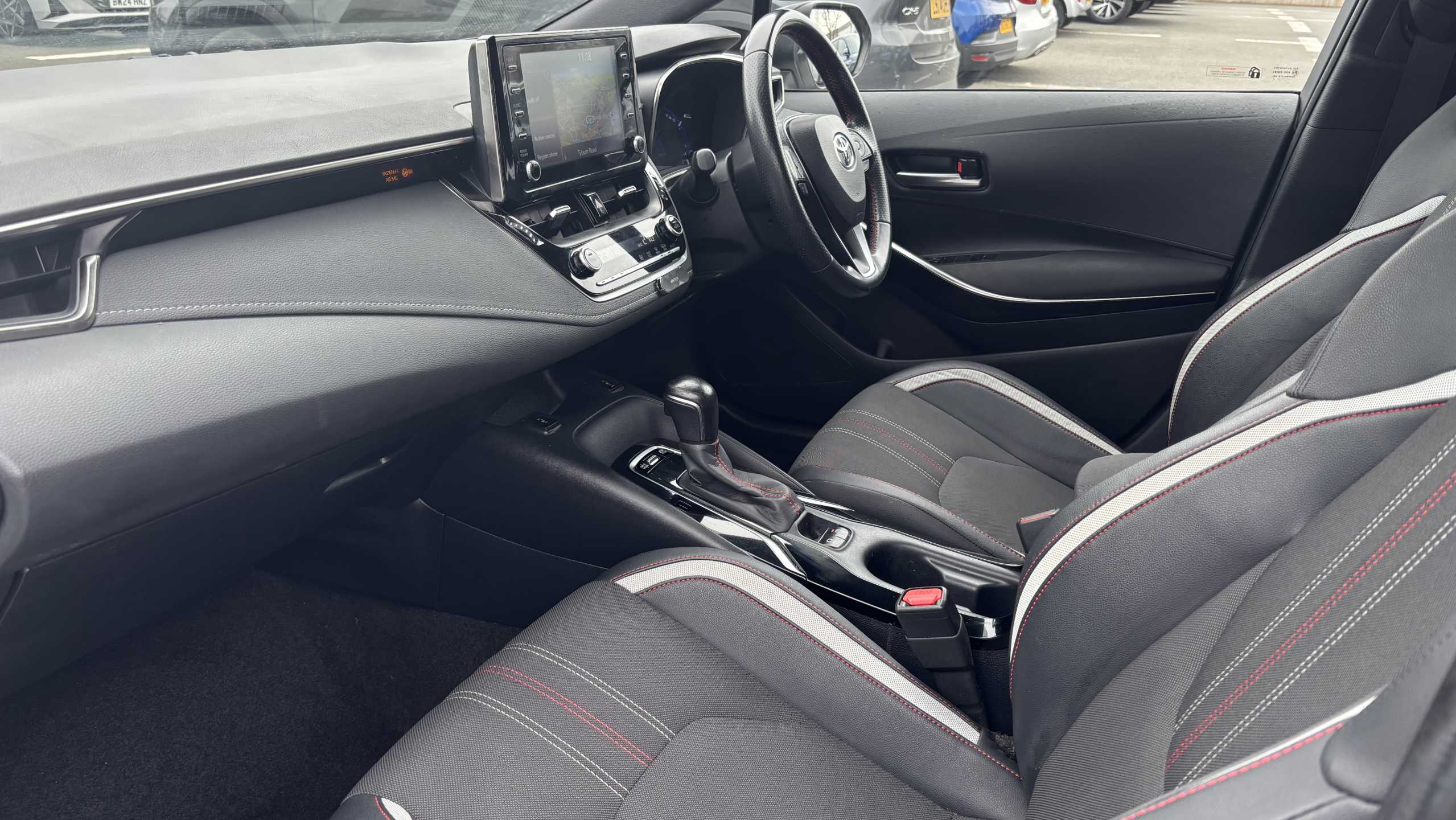 "D-cut steering wheel with red stitching",
