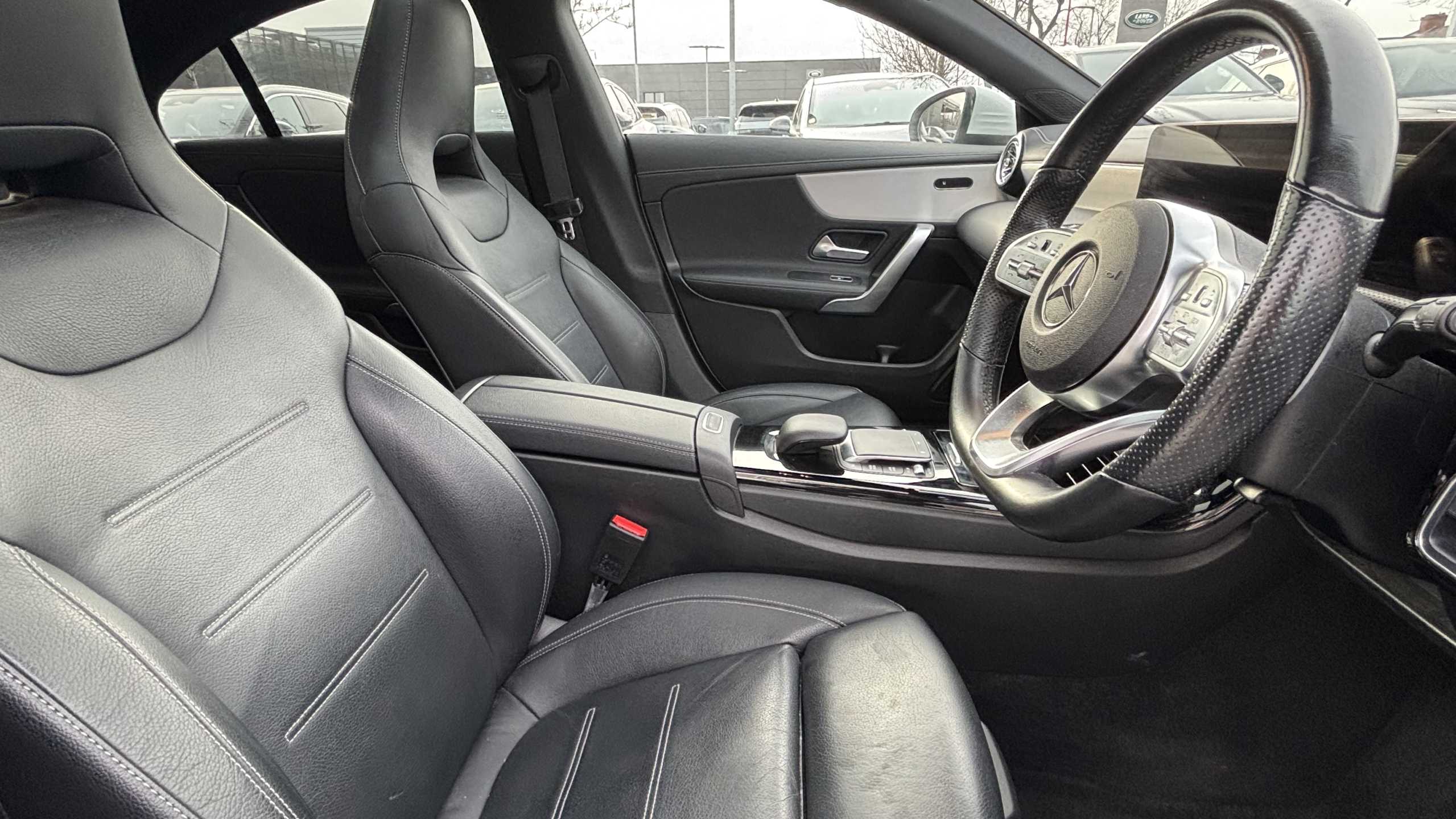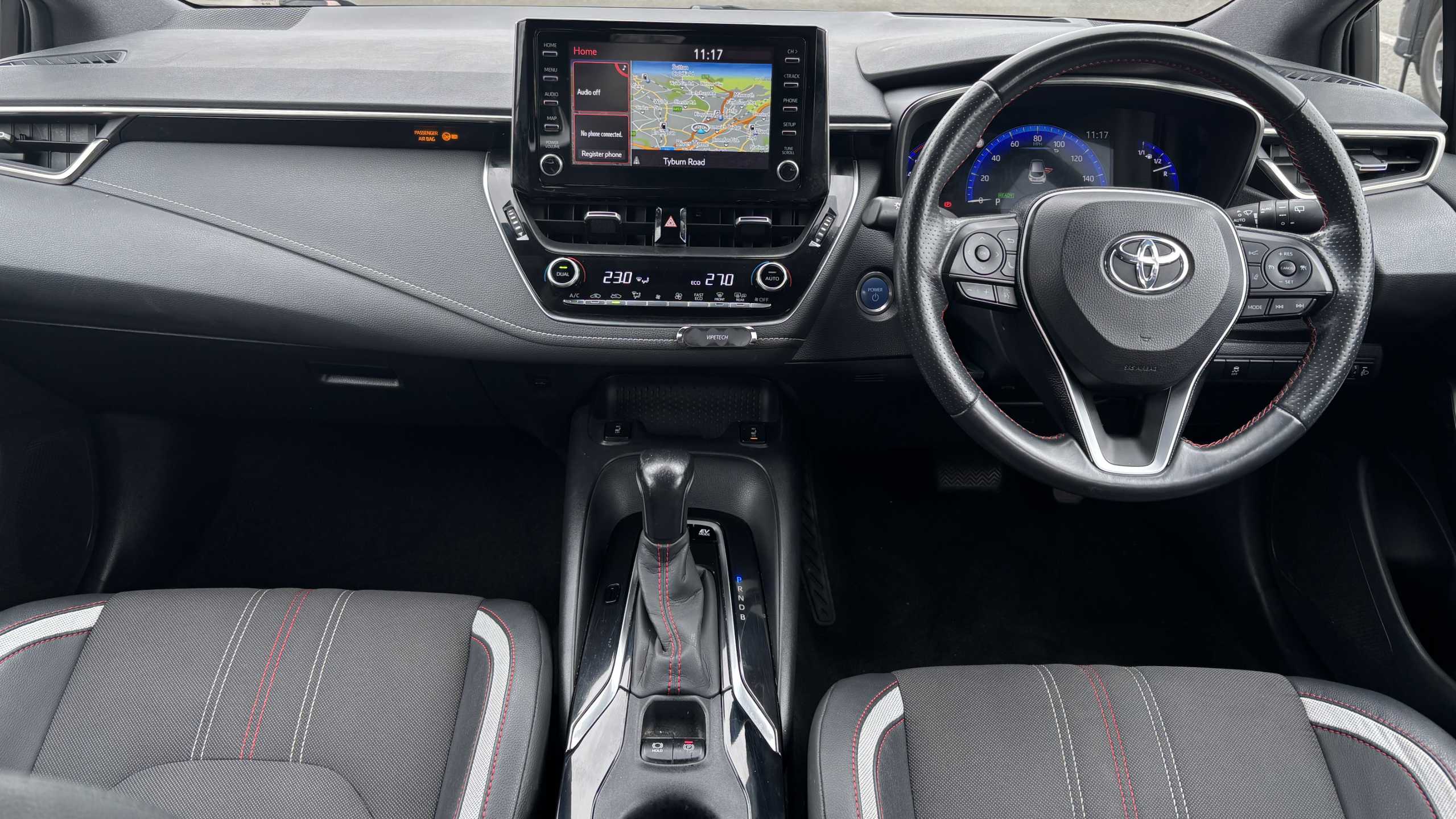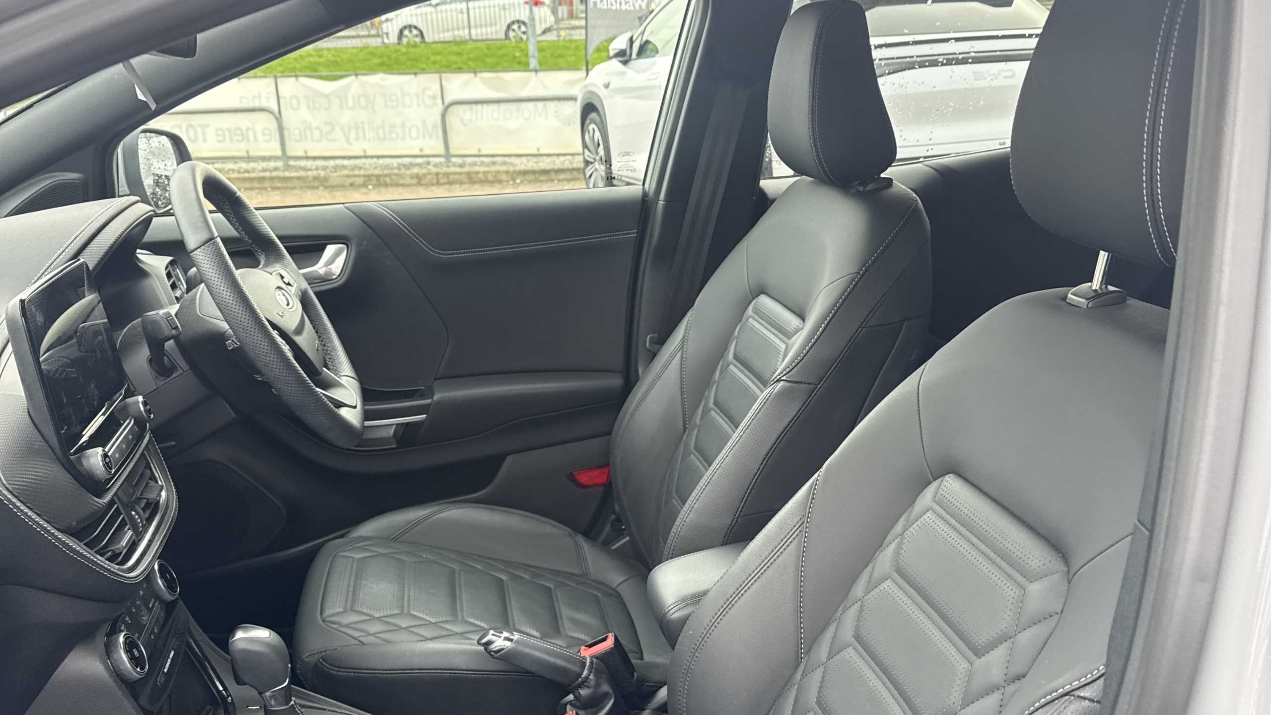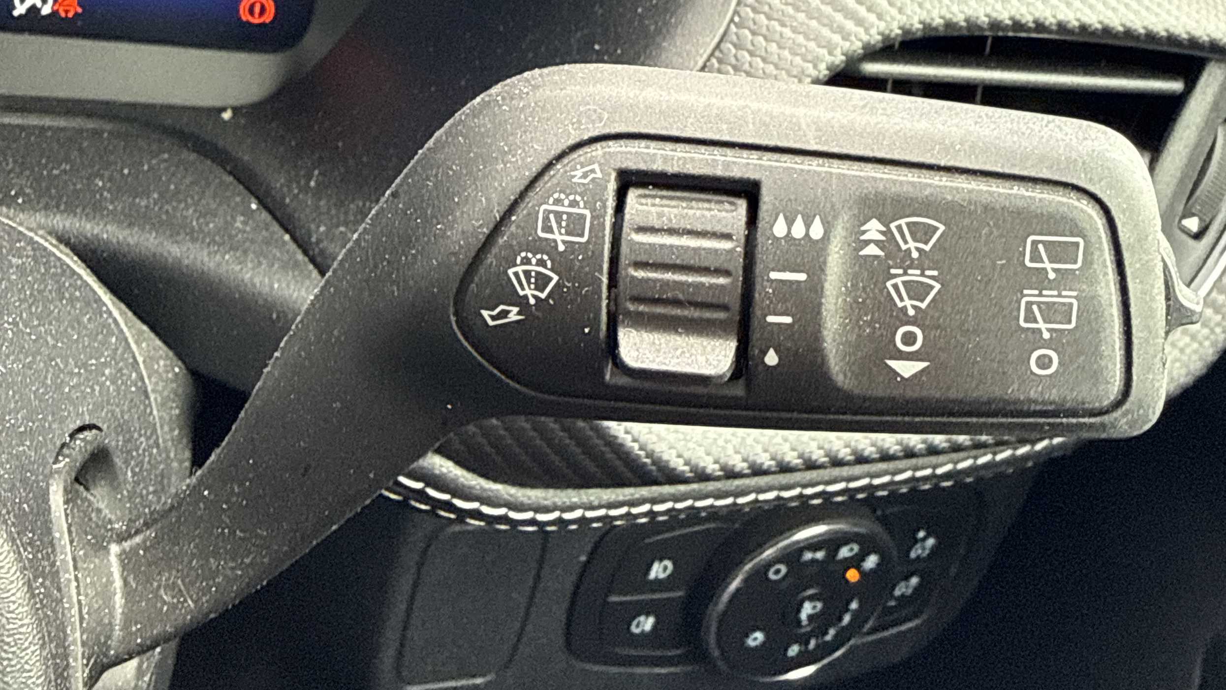 "D-cut steering wheel with red stitching",