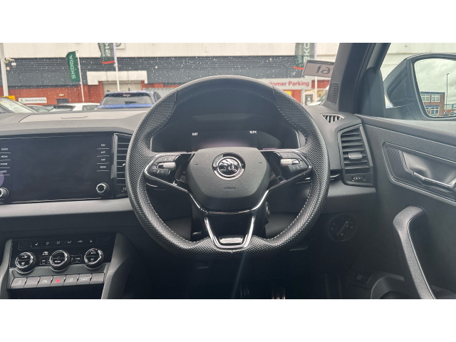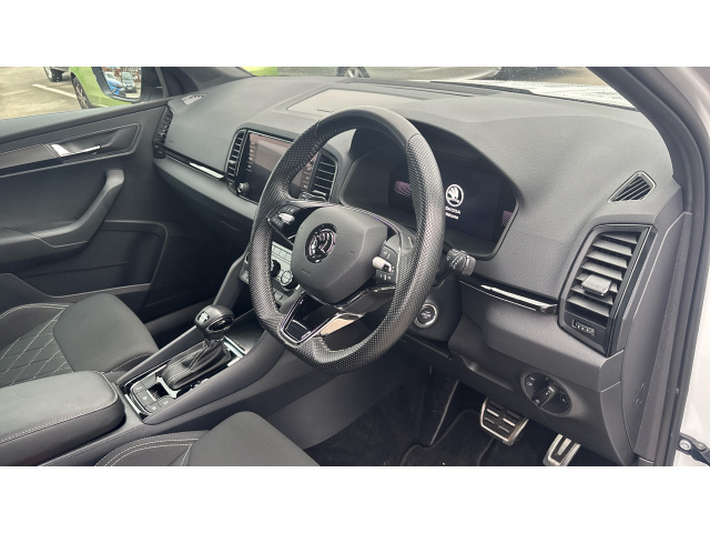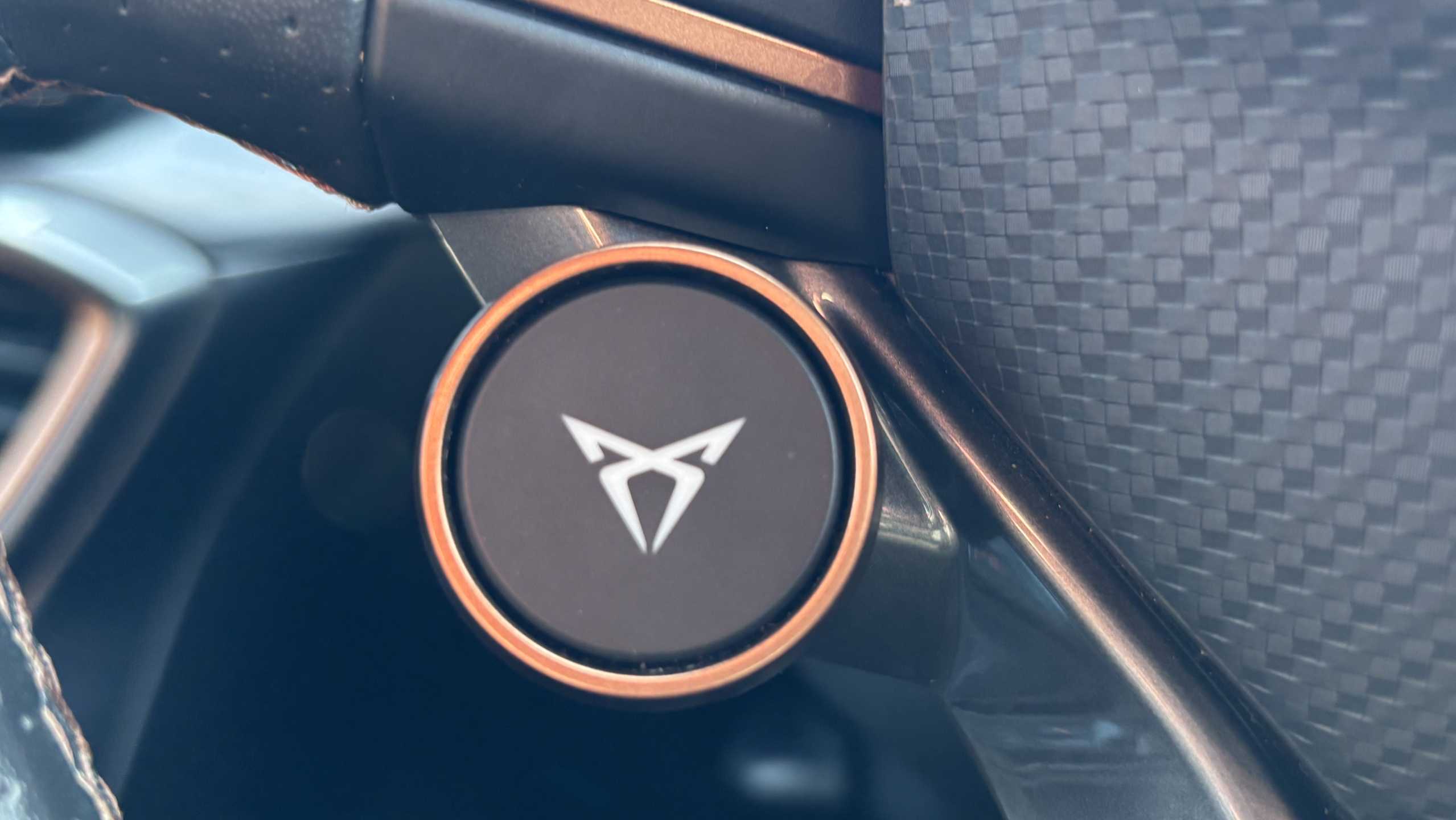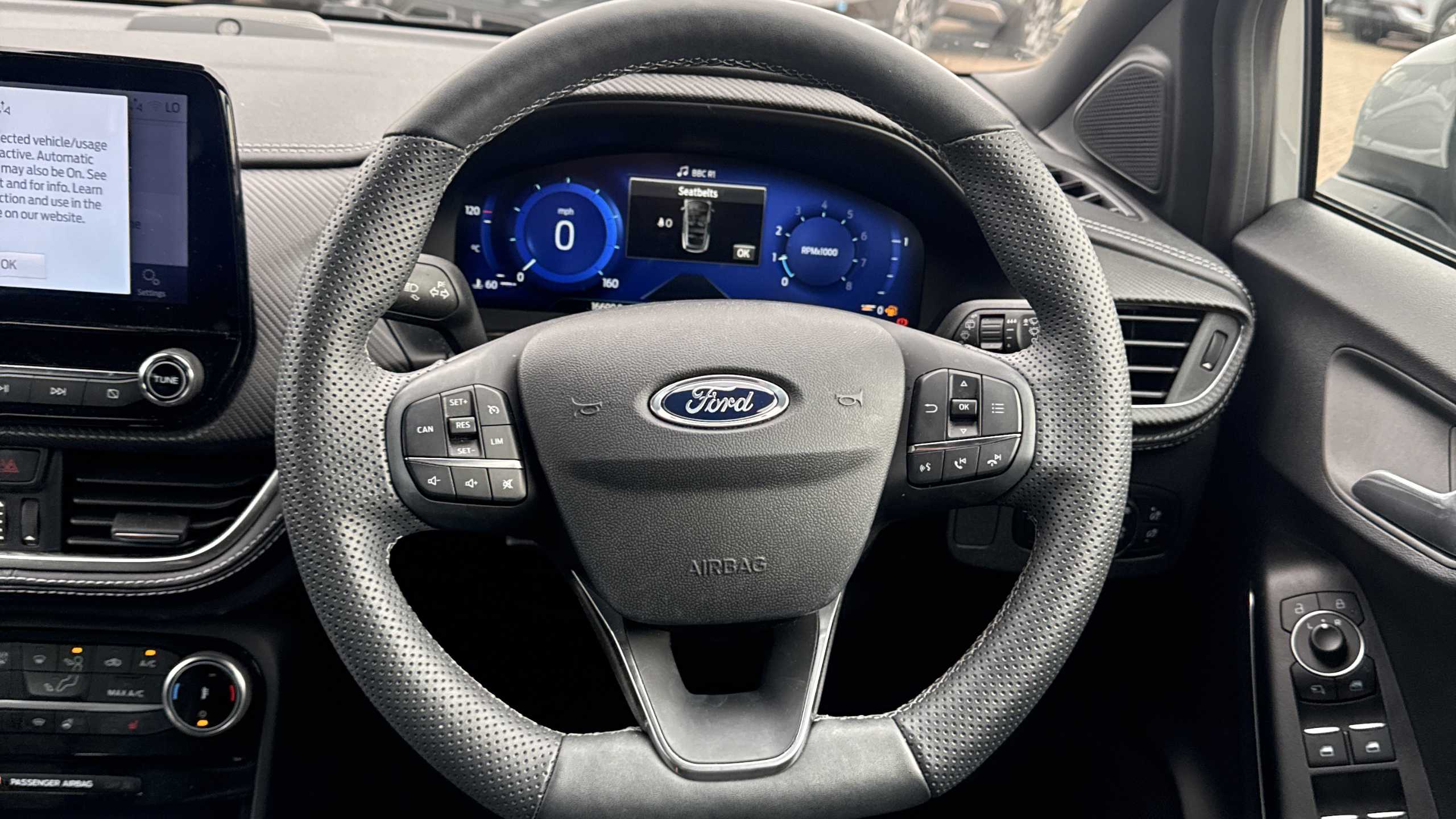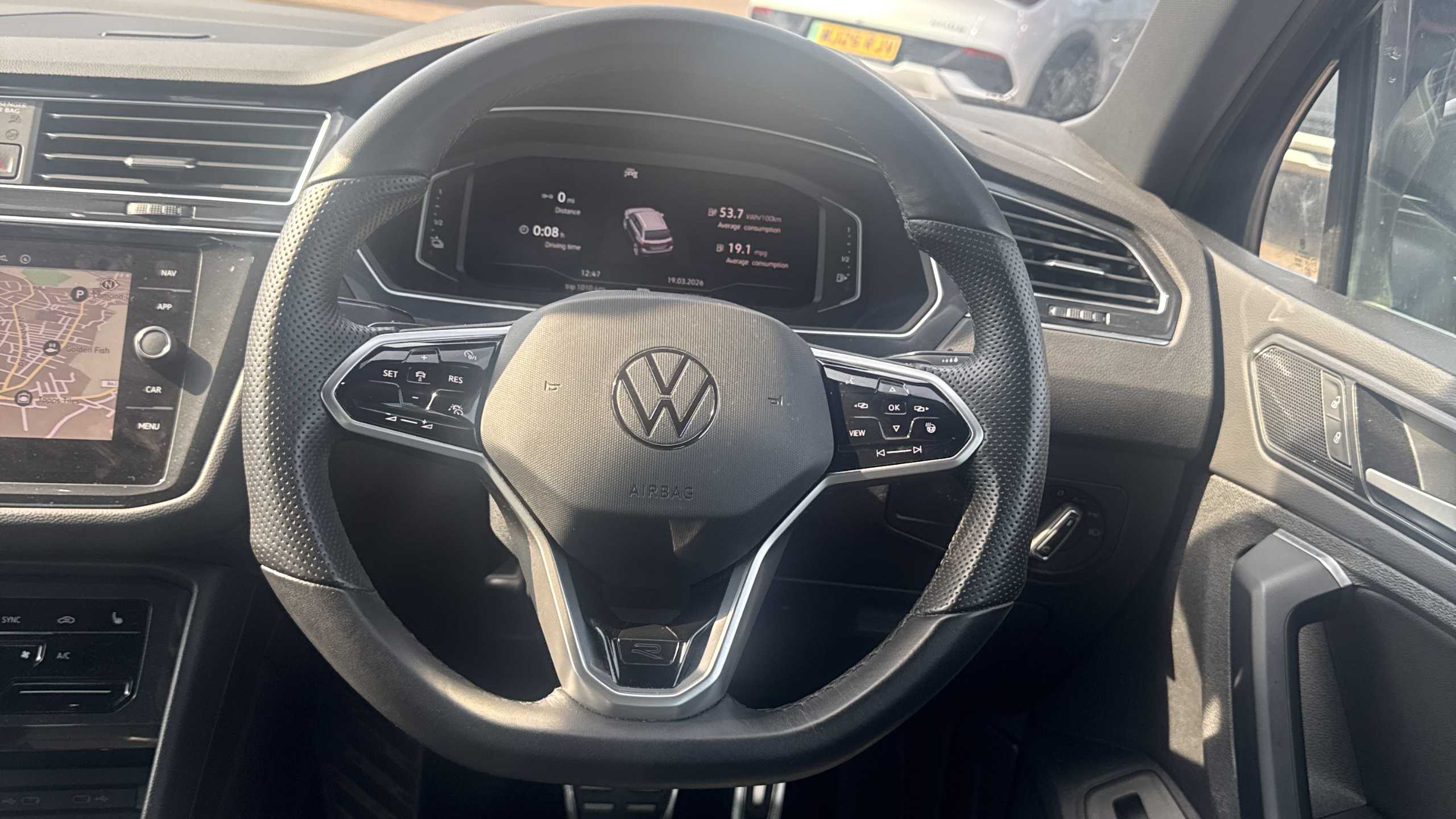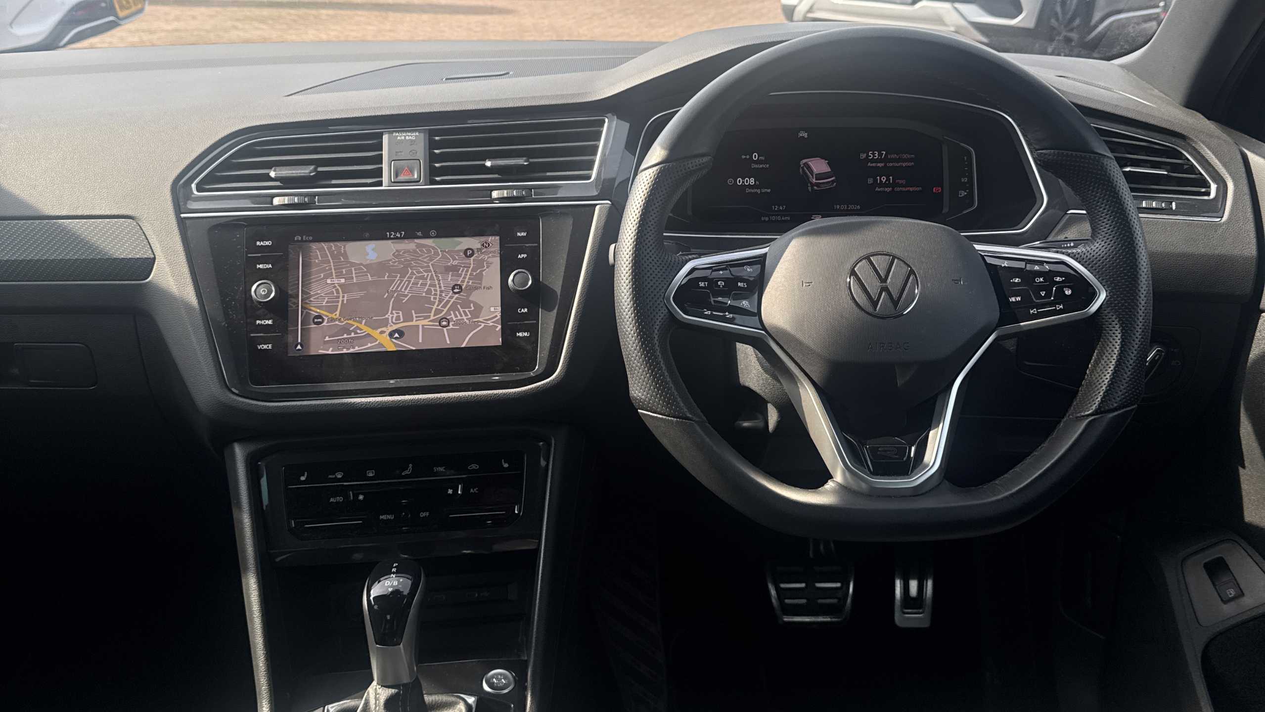 "D-cut steering wheel with red stitching",