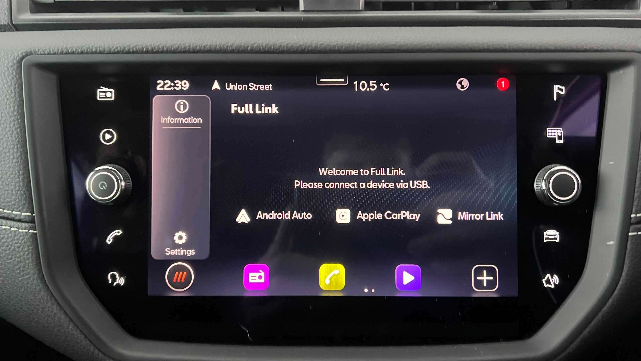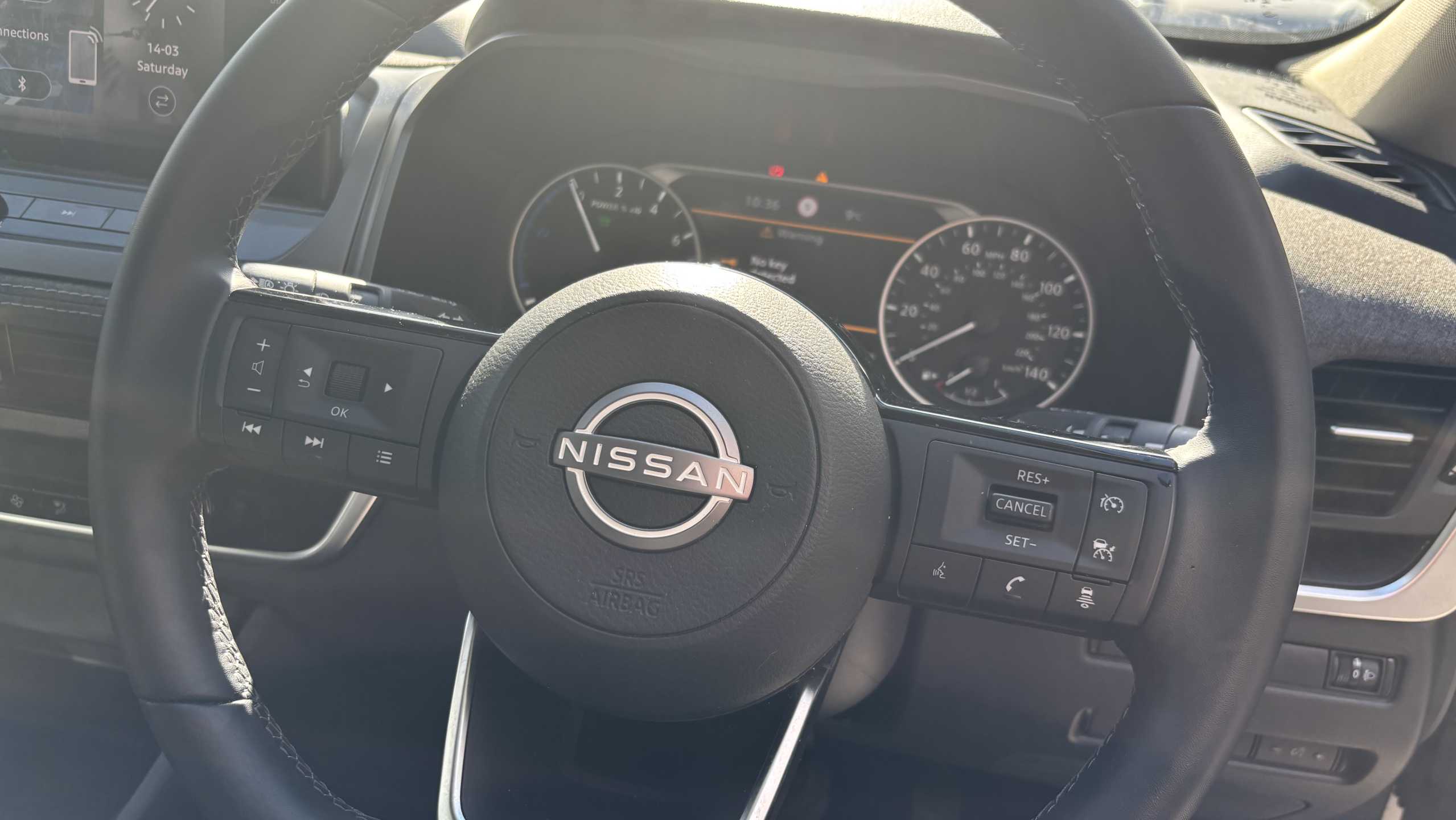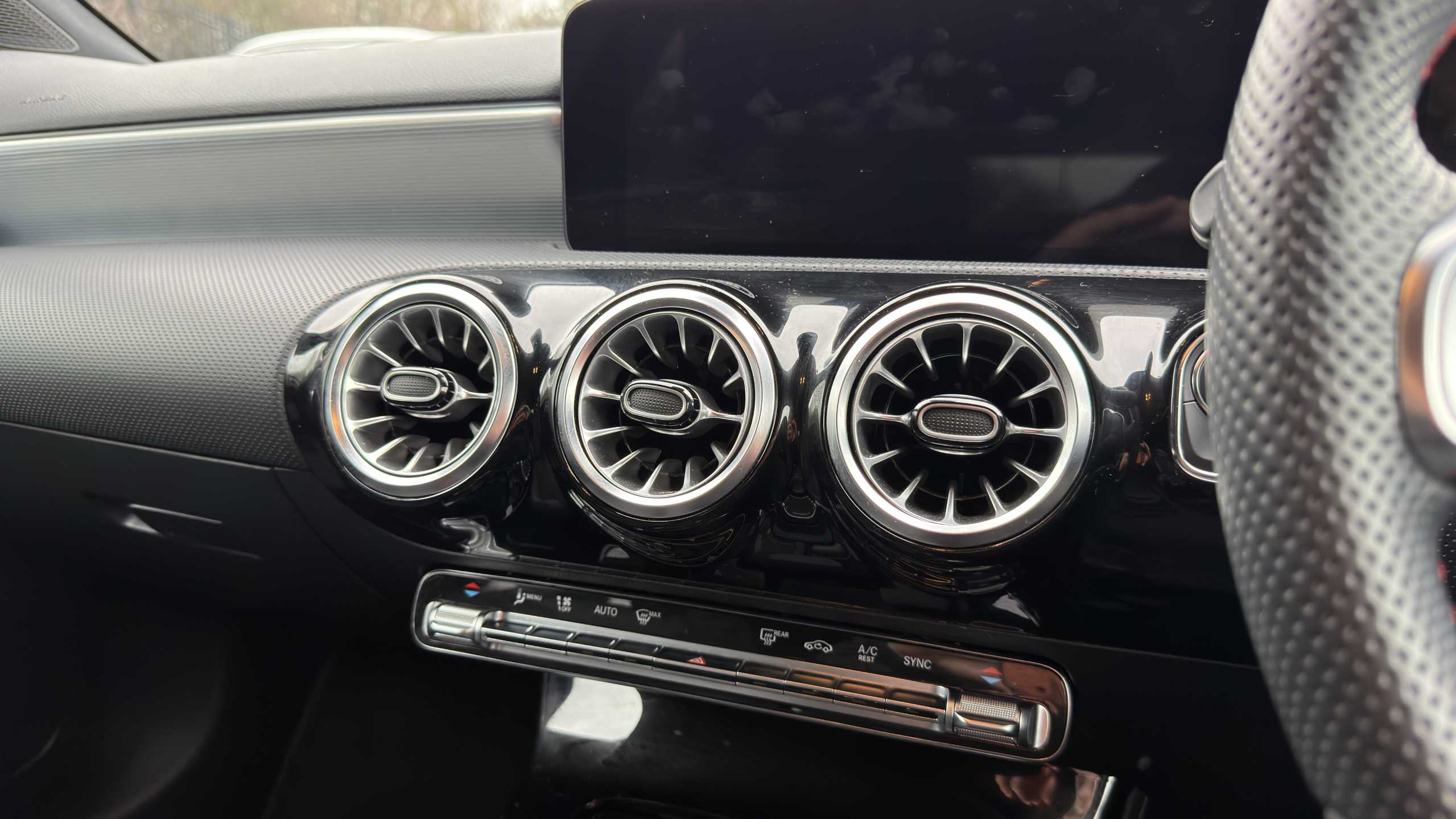 "3 spoke heated flat bottom leather effect steering wheel with satin chrome effect bezel",