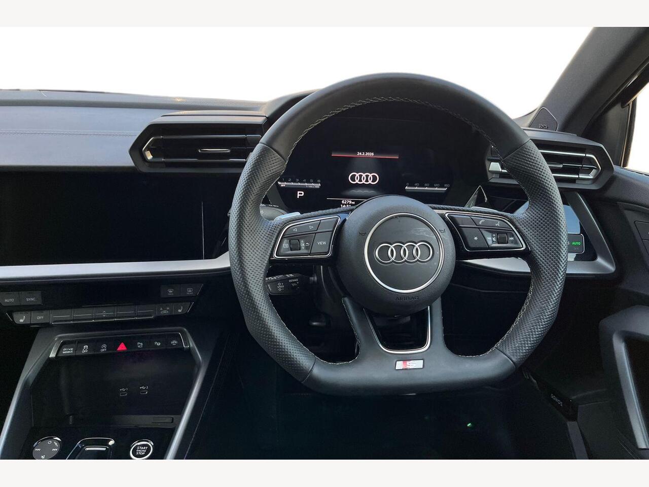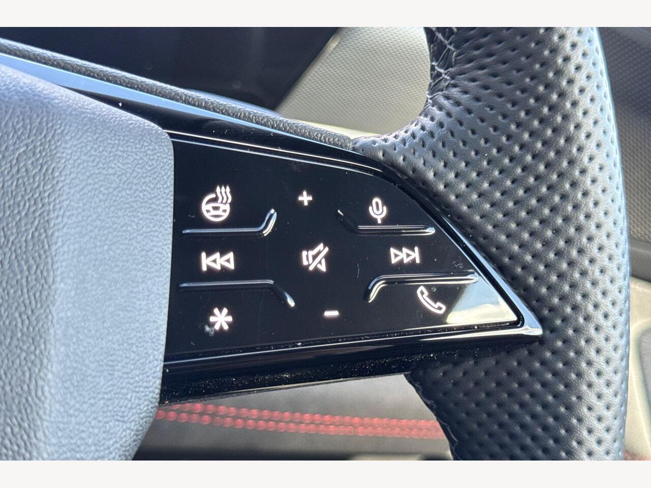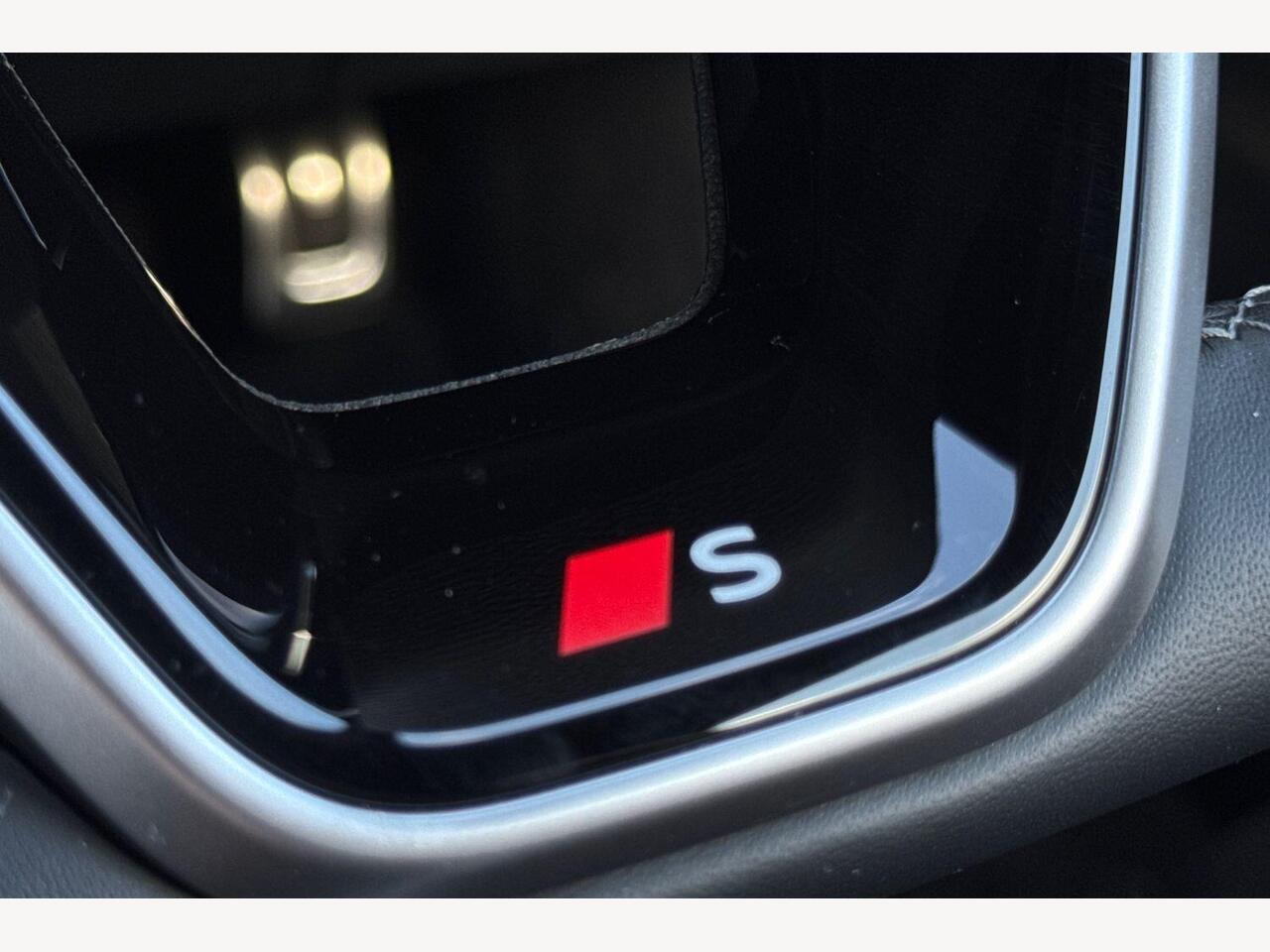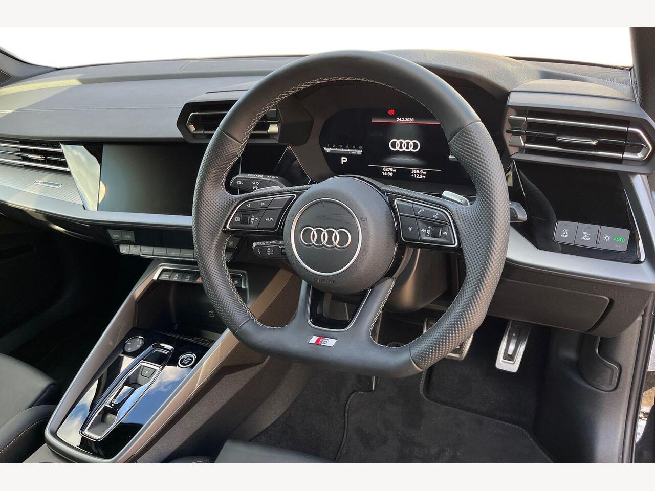 "3 spoke multifunction heated leather steering wheel with touch control, flat on top and bottom, with 'S' badge,contrast stitch",