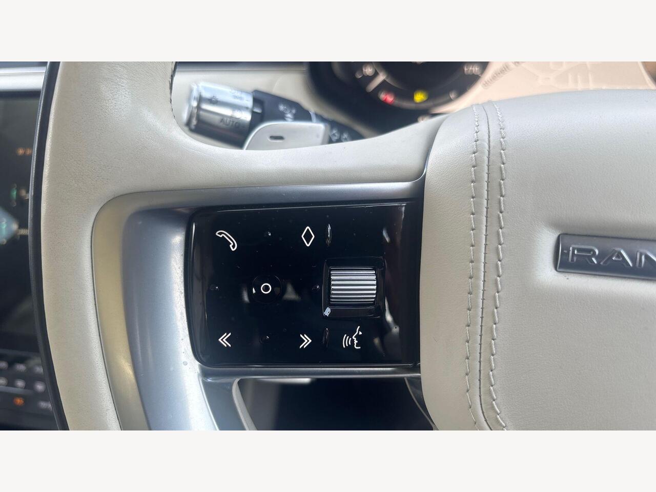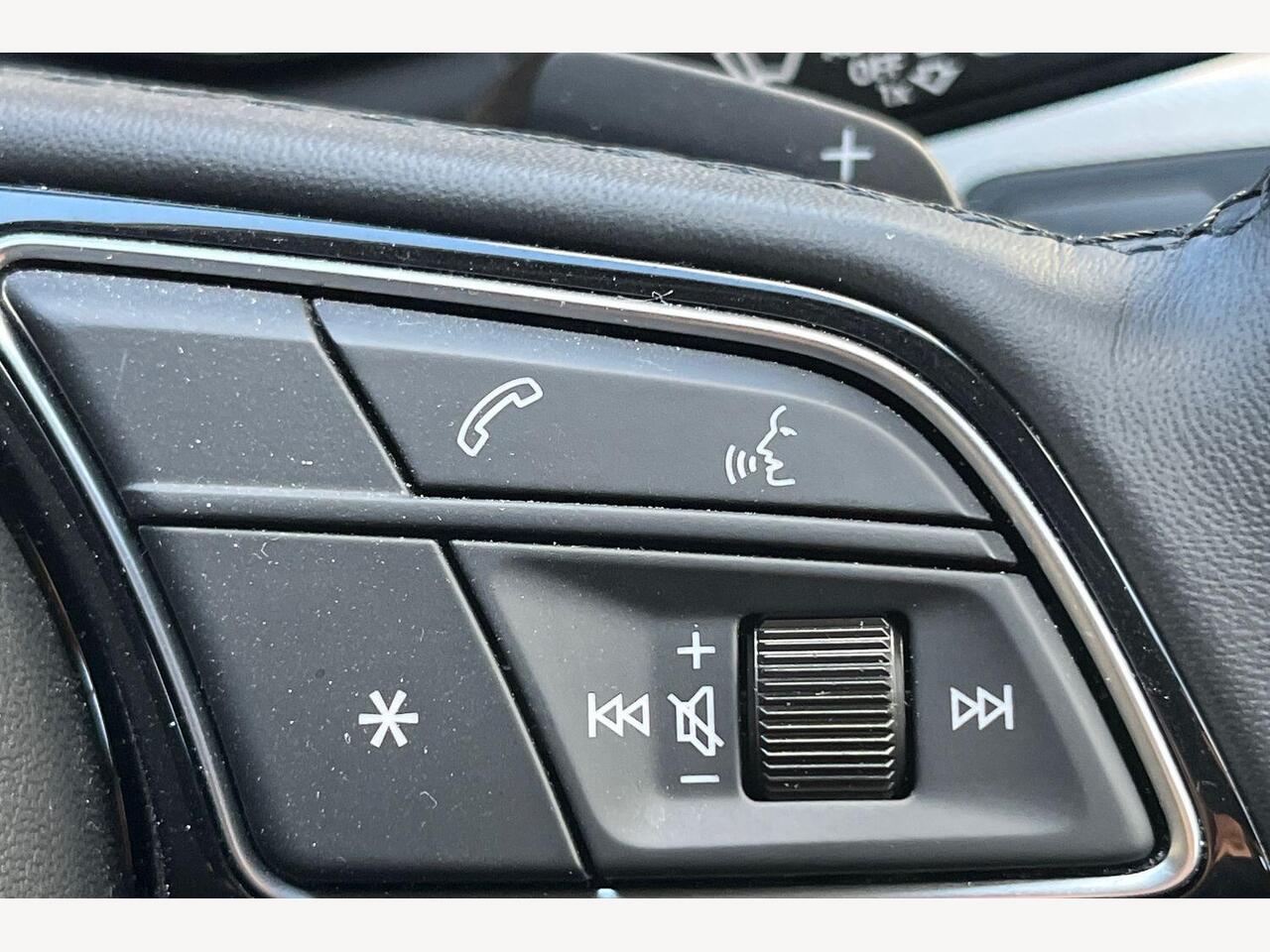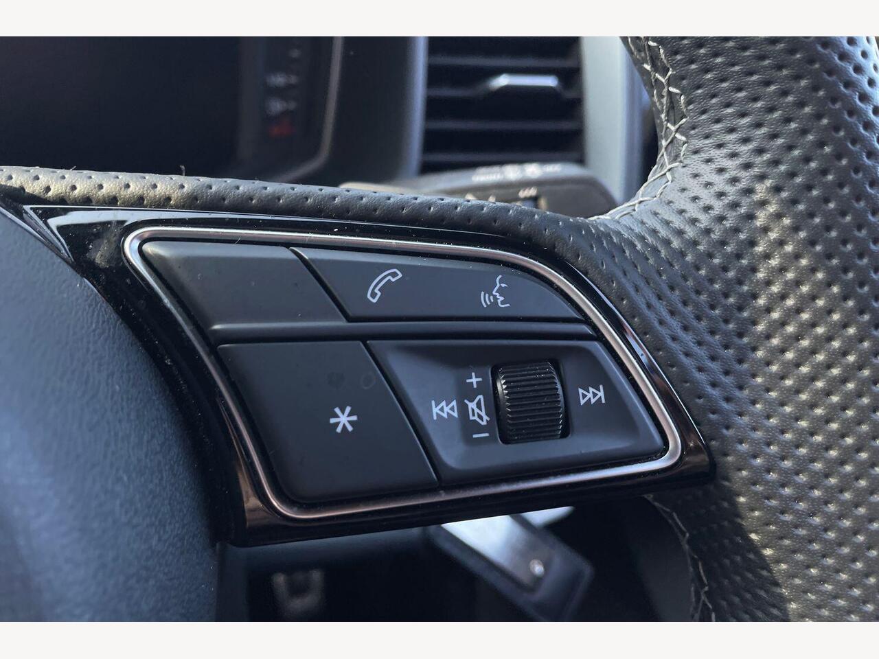 "3 spoke multifunction heated leather steering wheel with touch control, flat on top and bottom, with 'S' badge,contrast stitch",