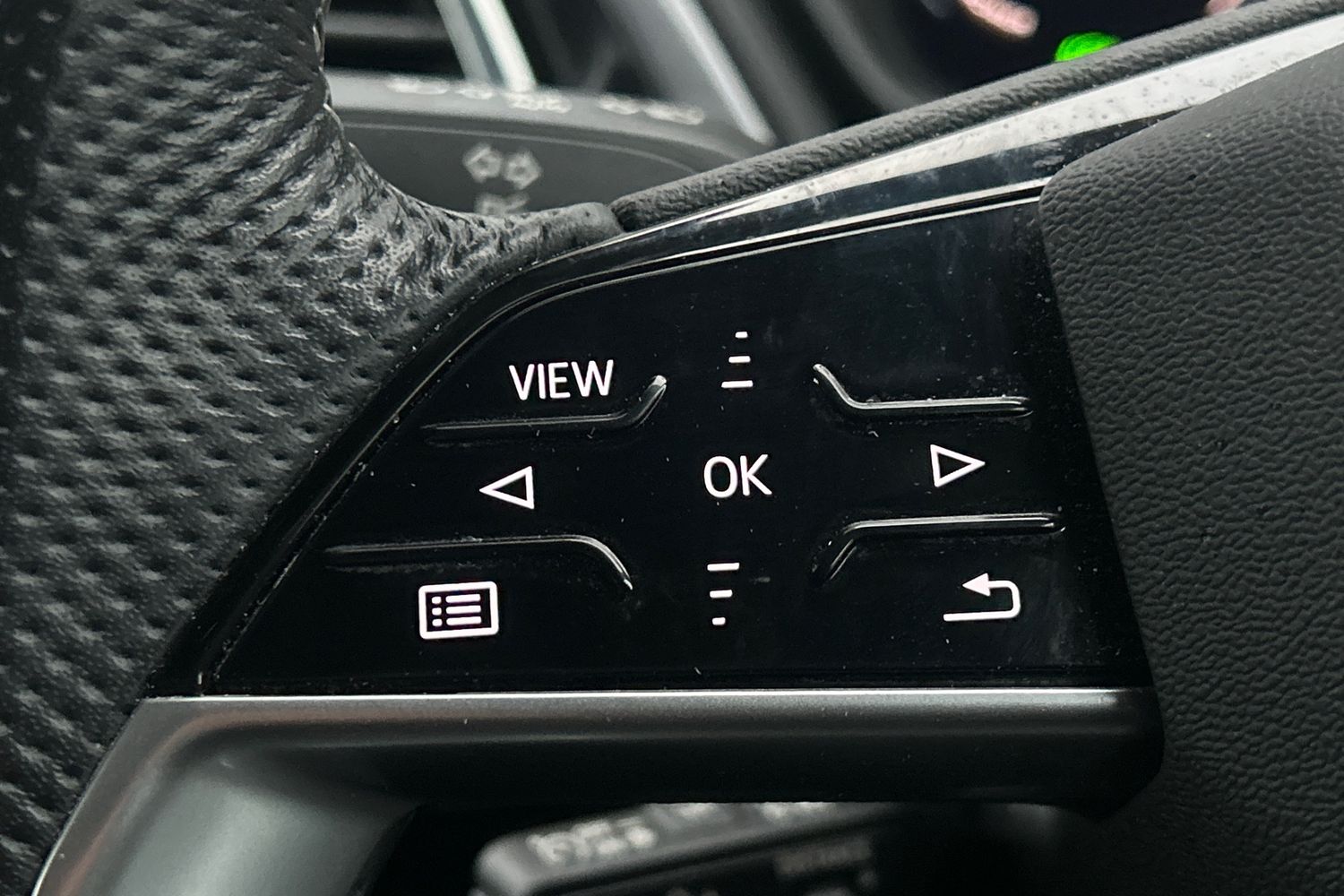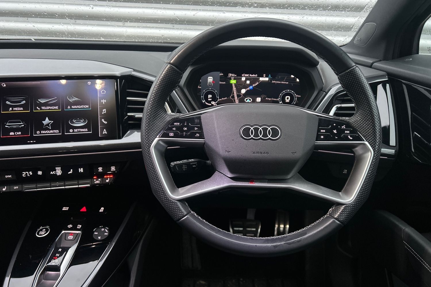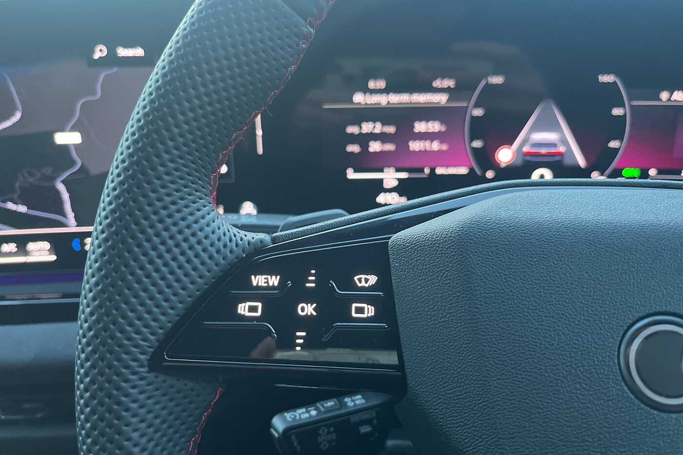 "3 spoke leather steering wheel with multi-function buttons with touch control, flattened on top and bottom, with S badging and contrast stitching",