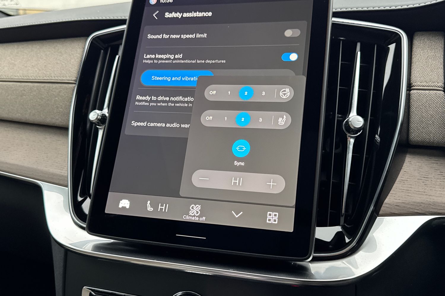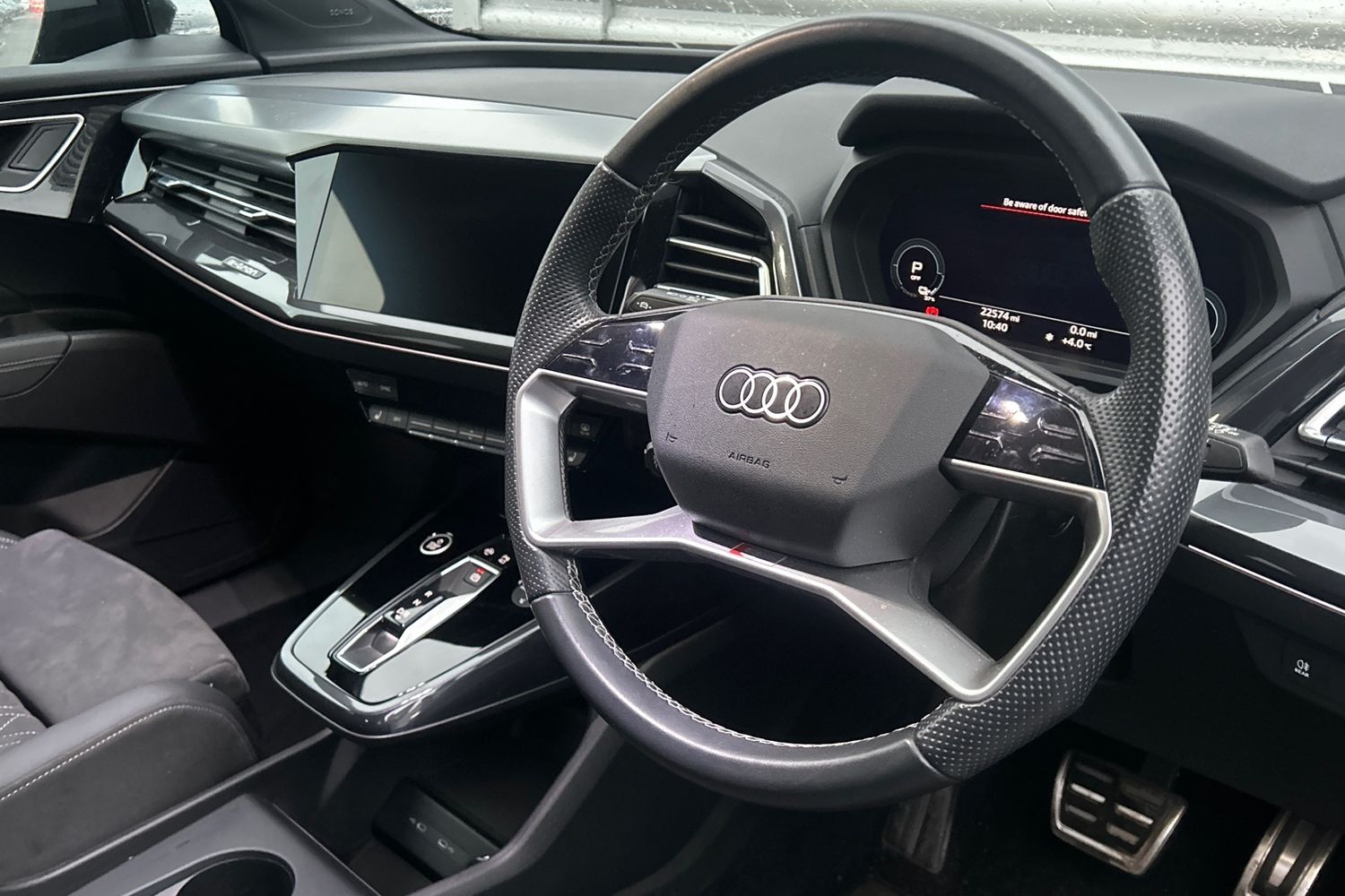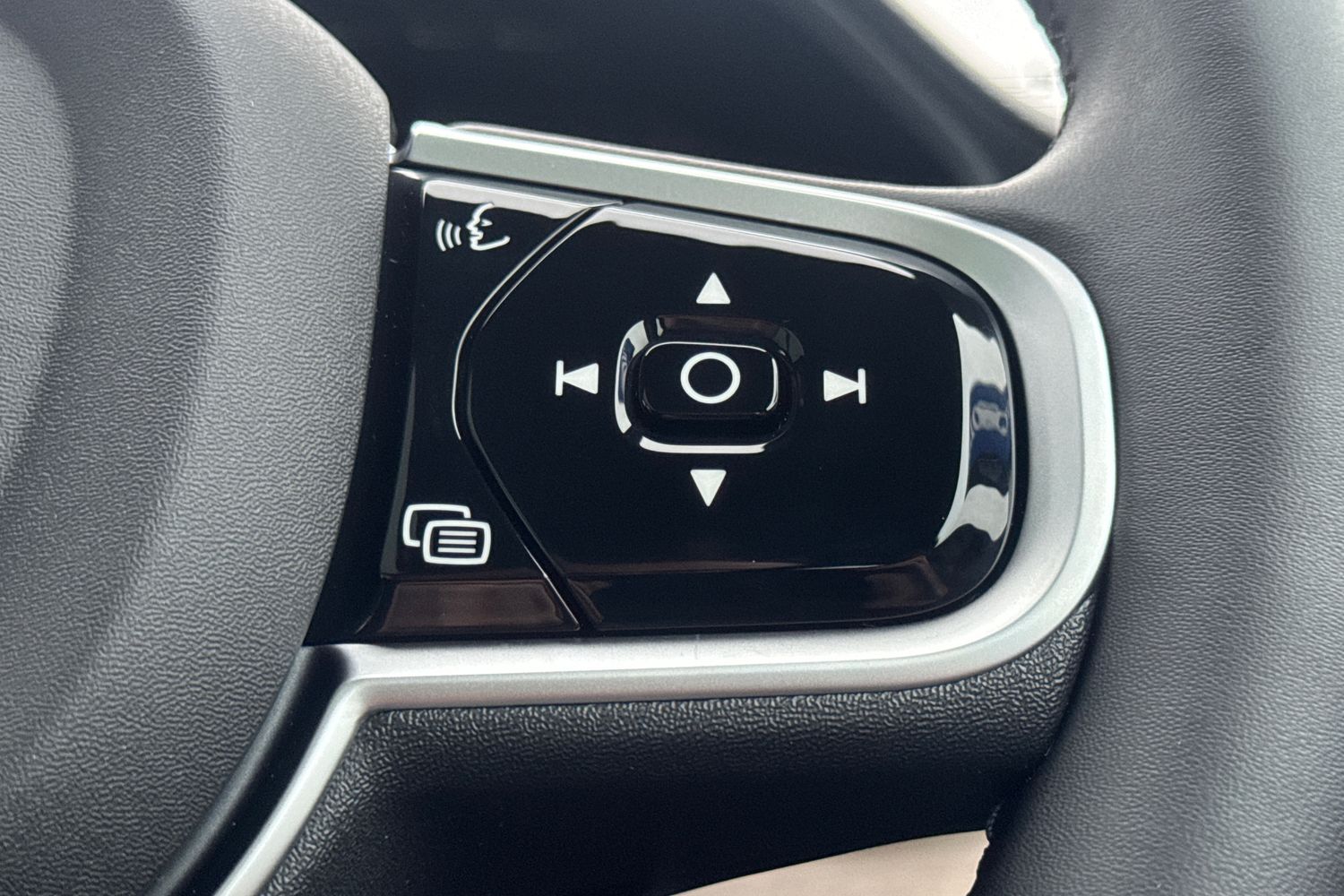 "3 spoke leather steering wheel with multi-function buttons with touch control, flattened on top and bottom, with S badging and contrast stitching",