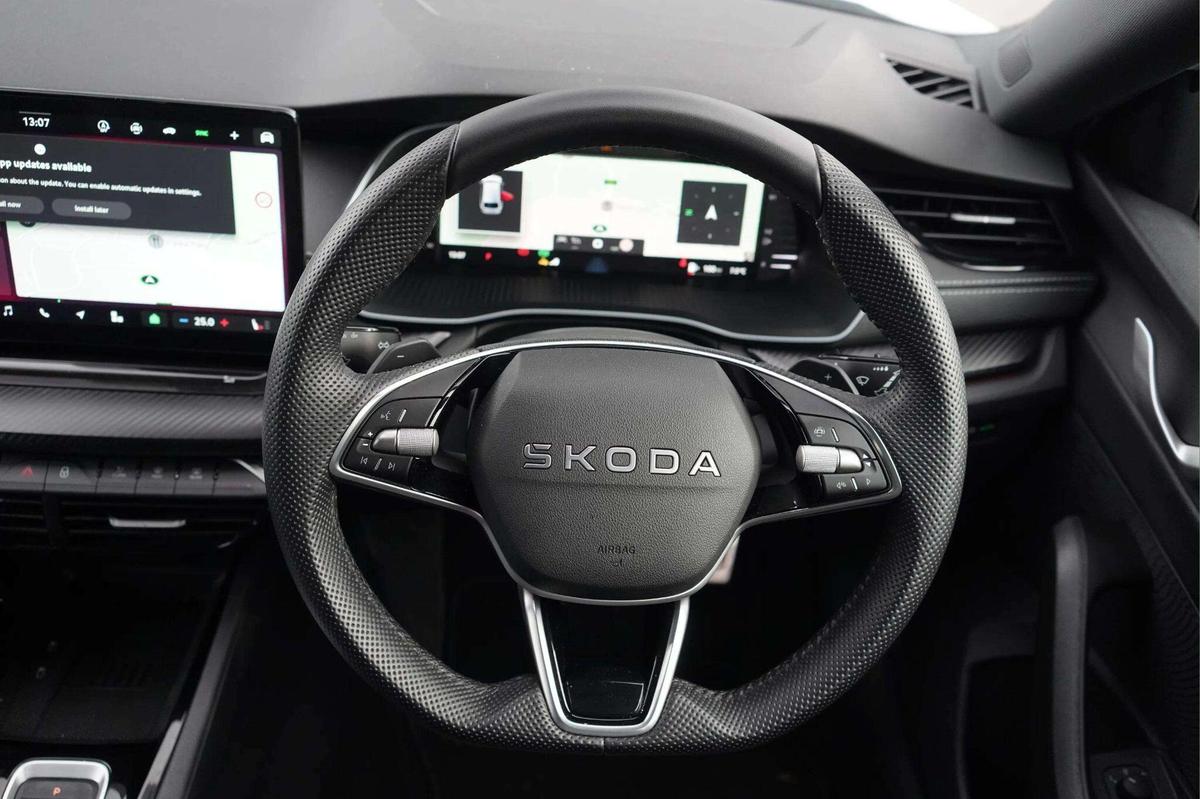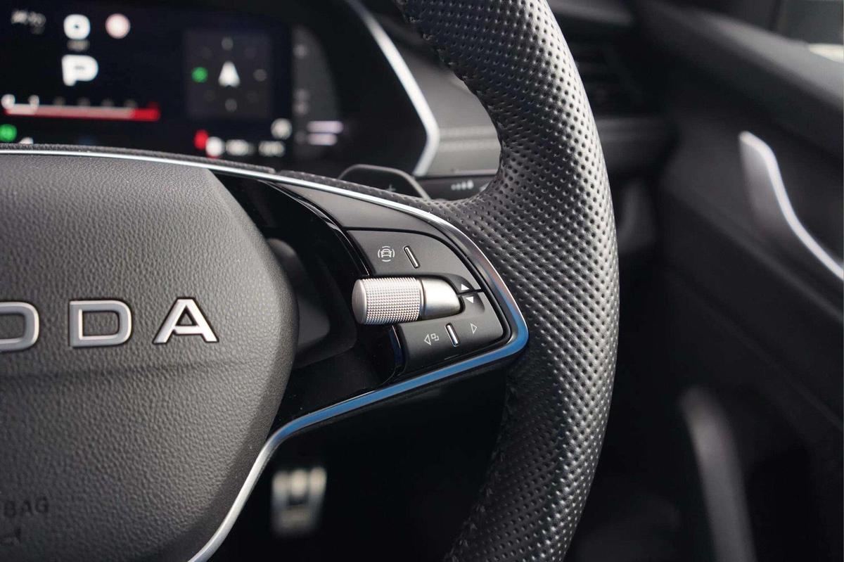 "Mistral full-grain perforated leather steering wheel with Lime Green stitch detail and satin chrome 'GT' emblem",