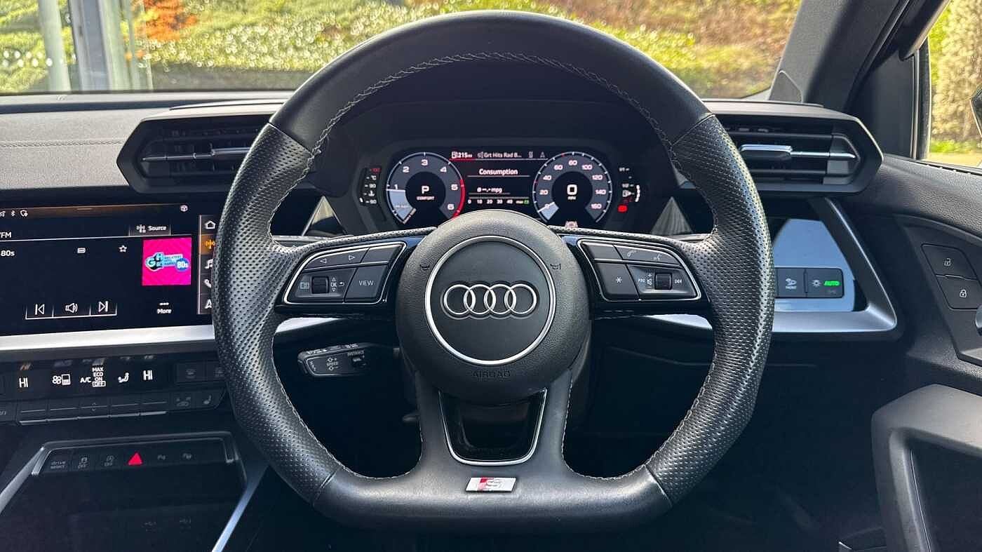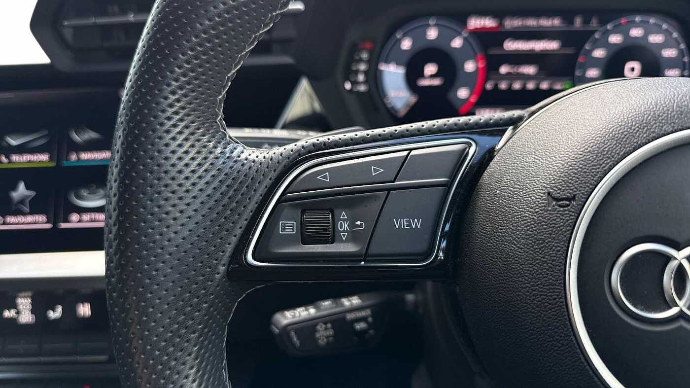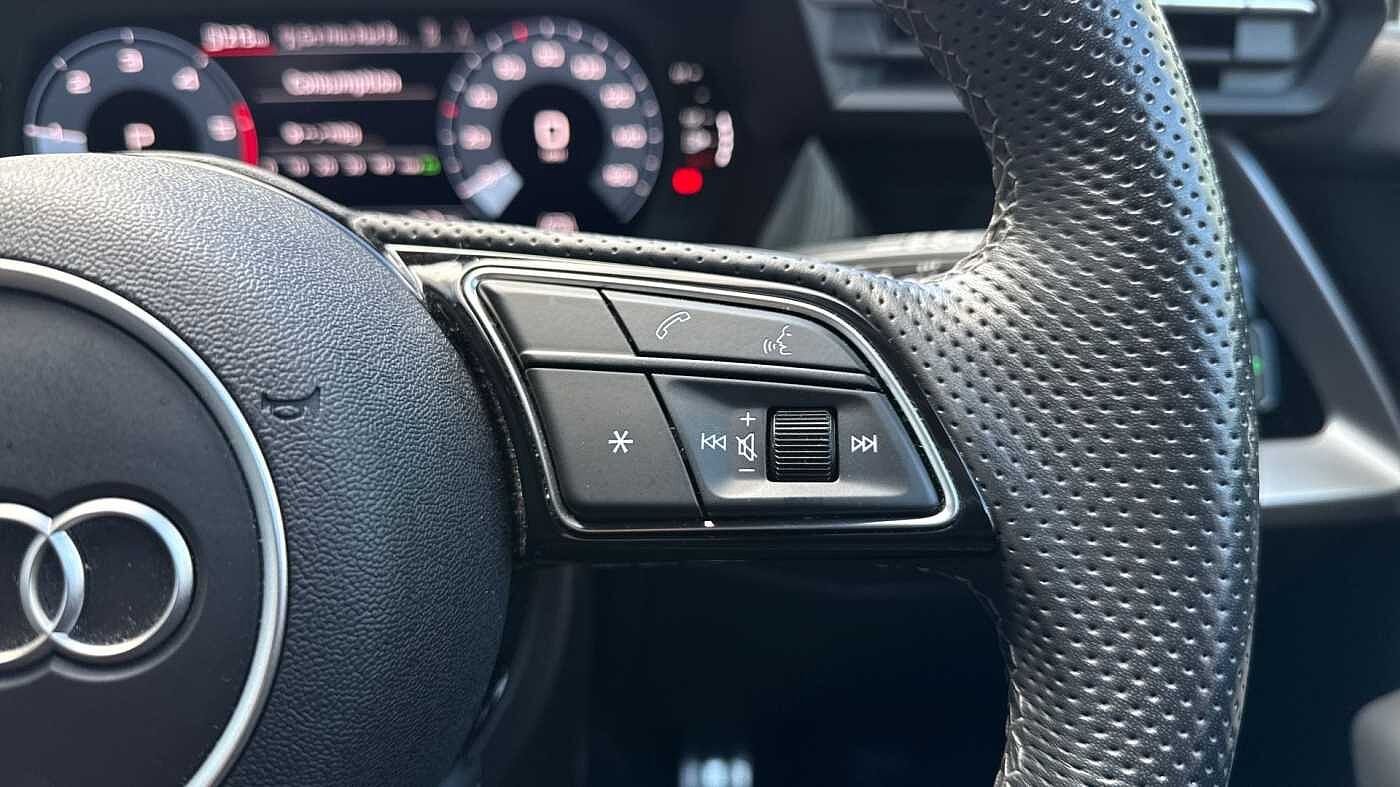 "3 spoke tailored steering wheel with deco and infotainment/vehicle controls",