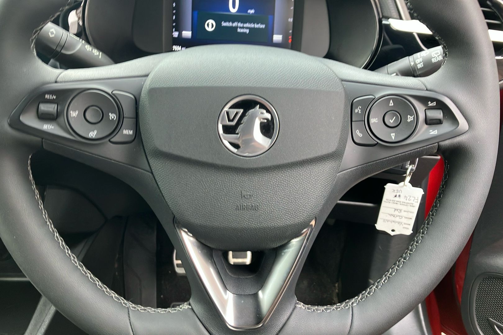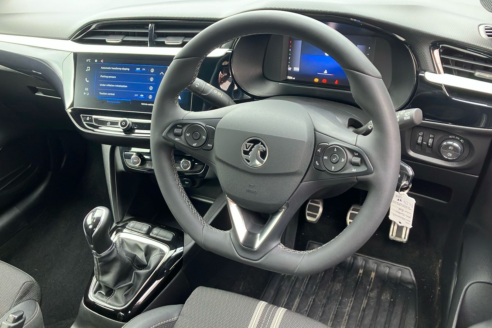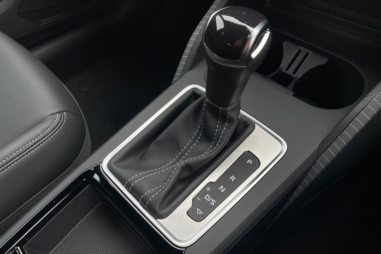 "Steering wheel in black leather with black stitching",