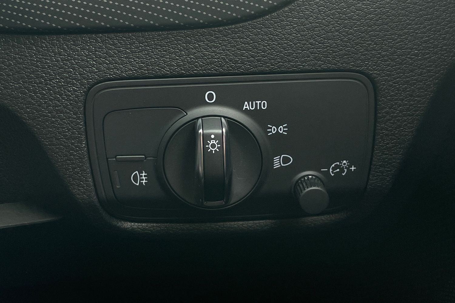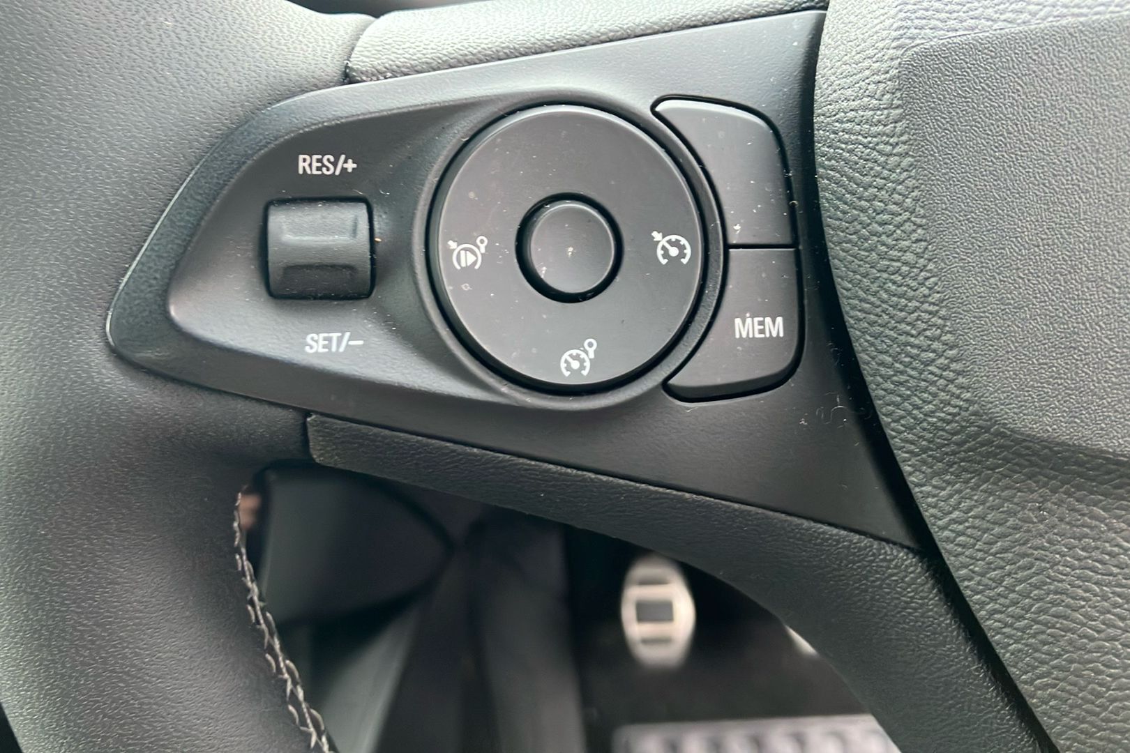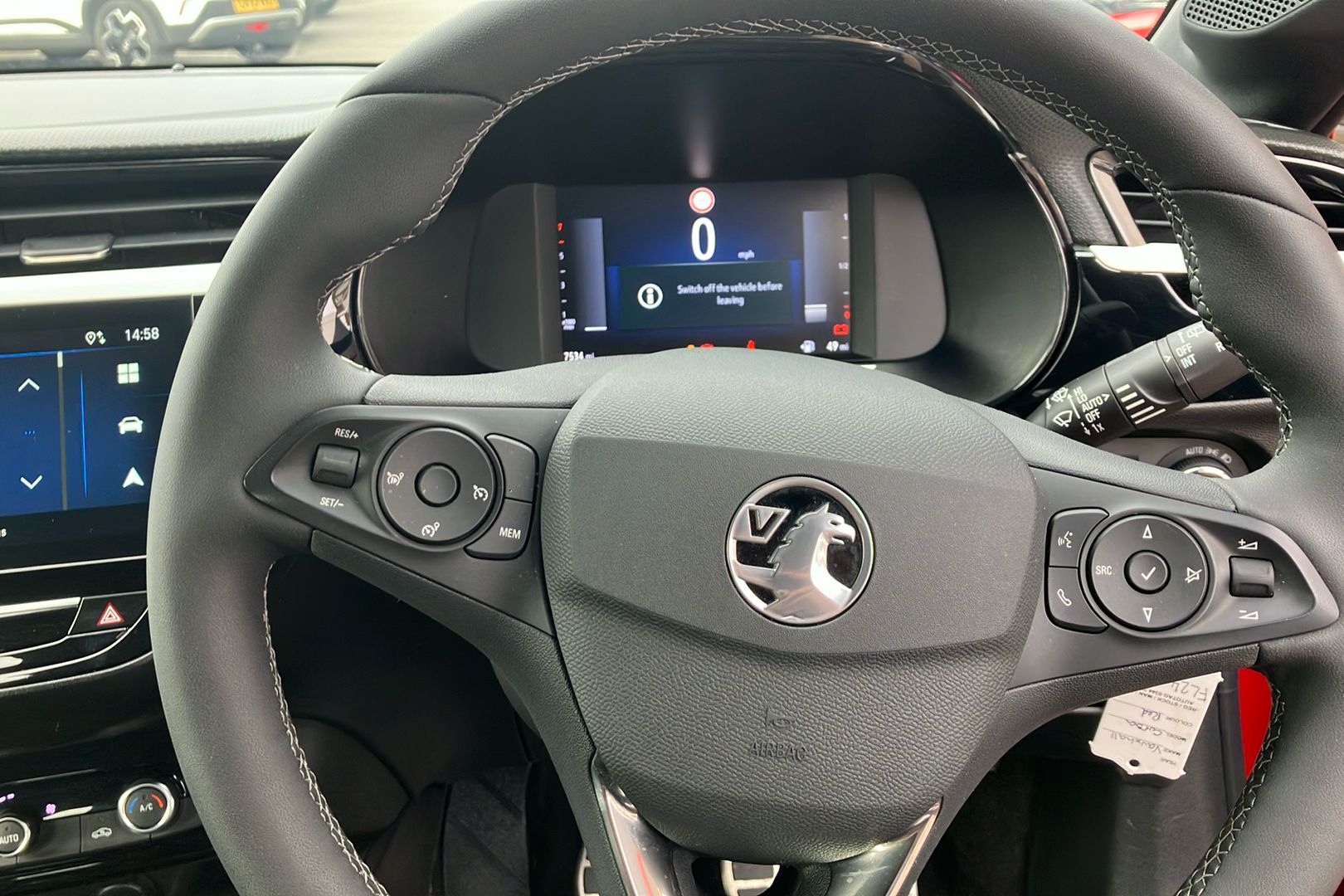 "Steering wheel in black leather with black stitching",