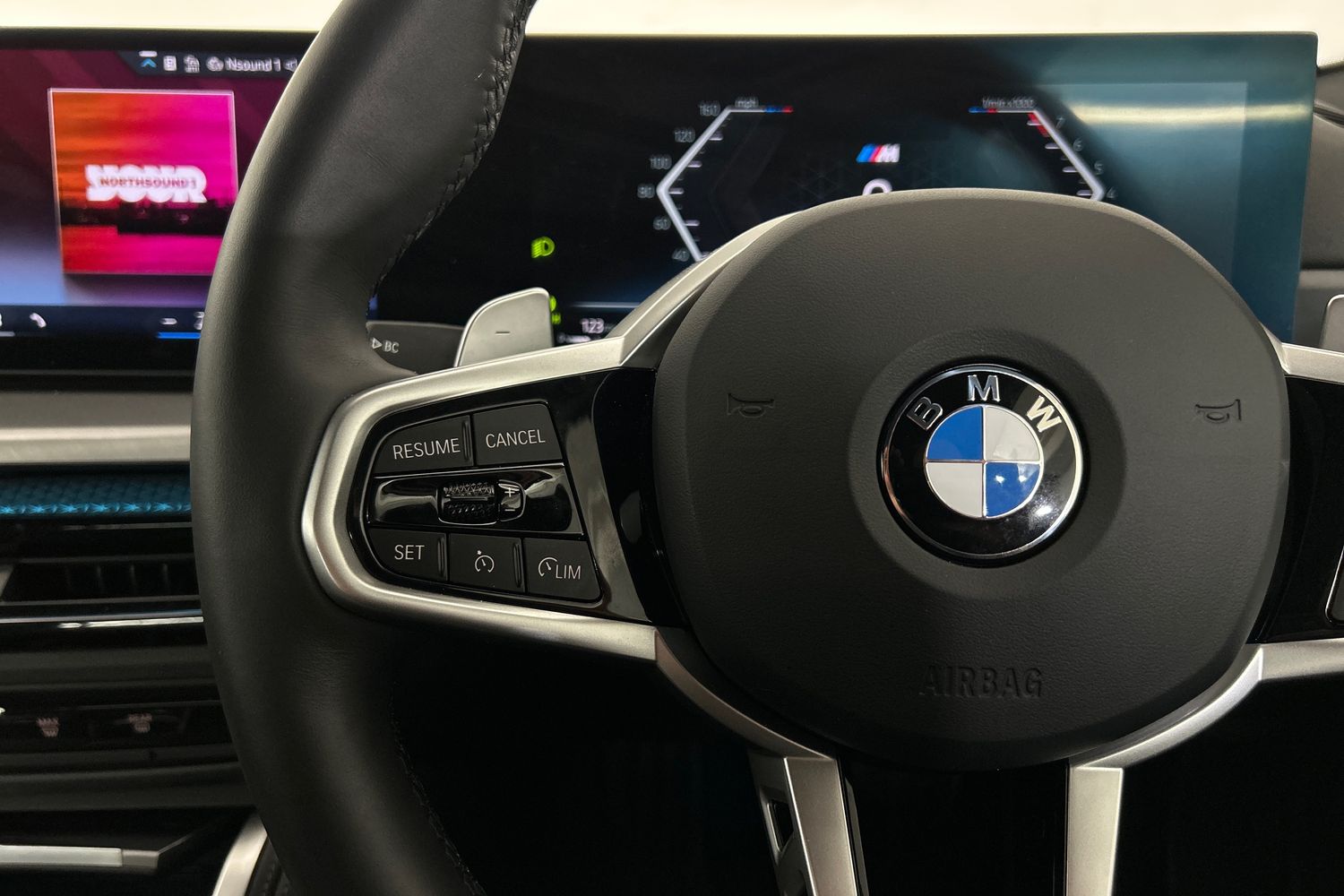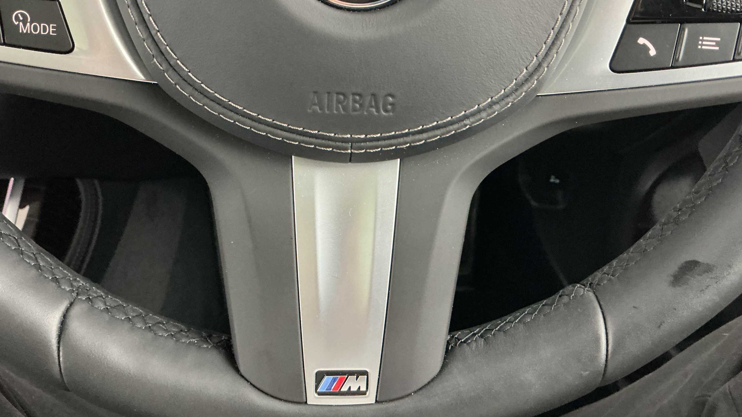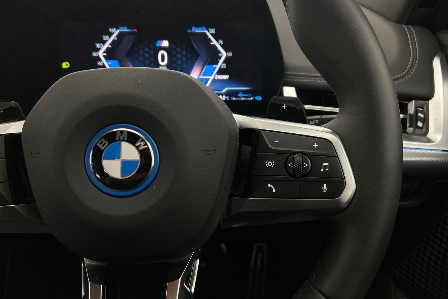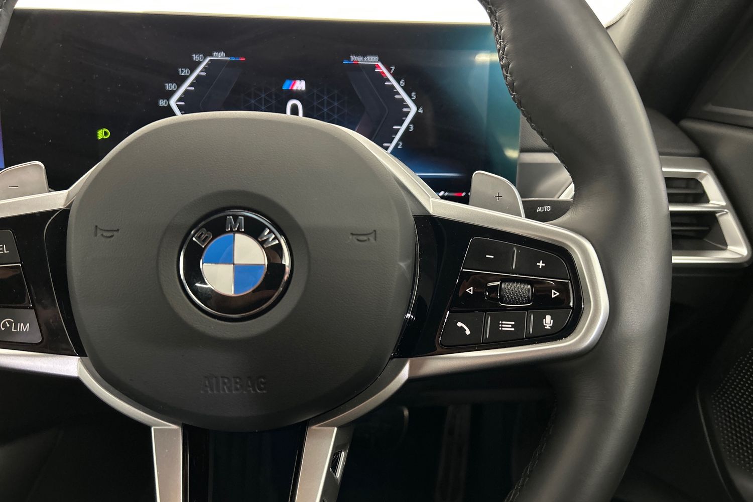 "Three spoke leather wrapped multifunction steering wheel with shifting paddles"