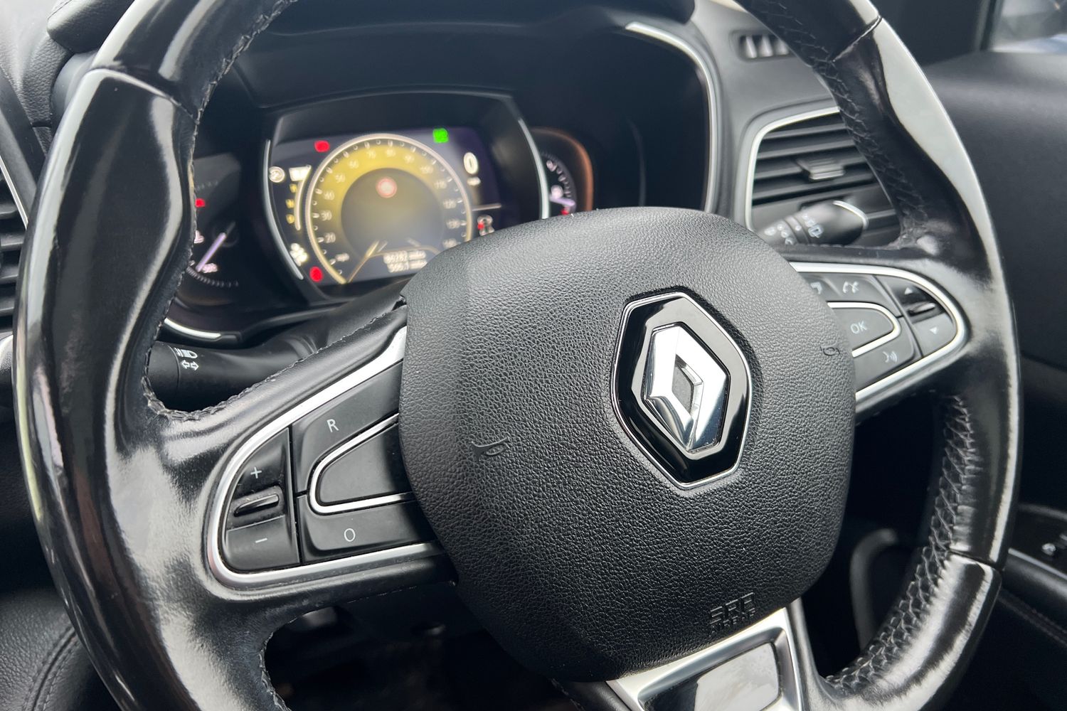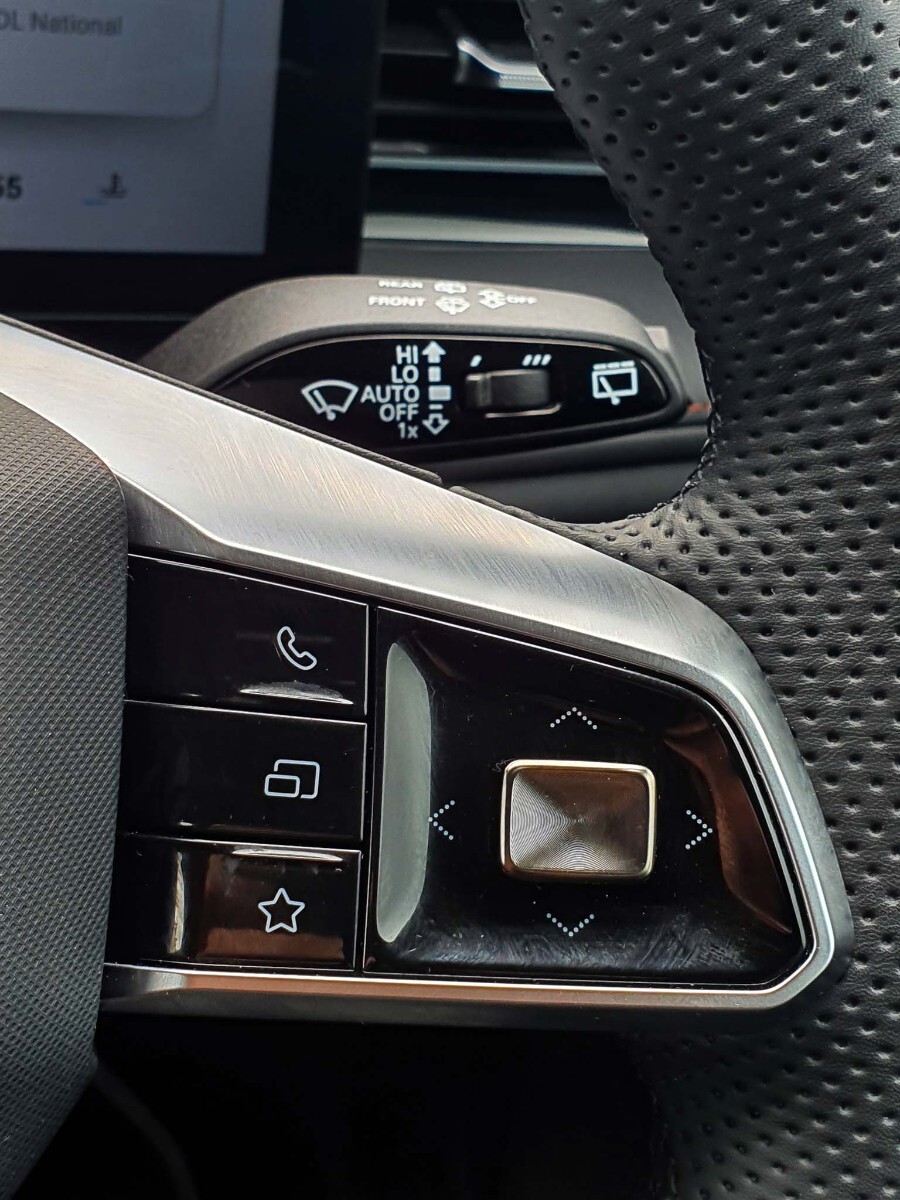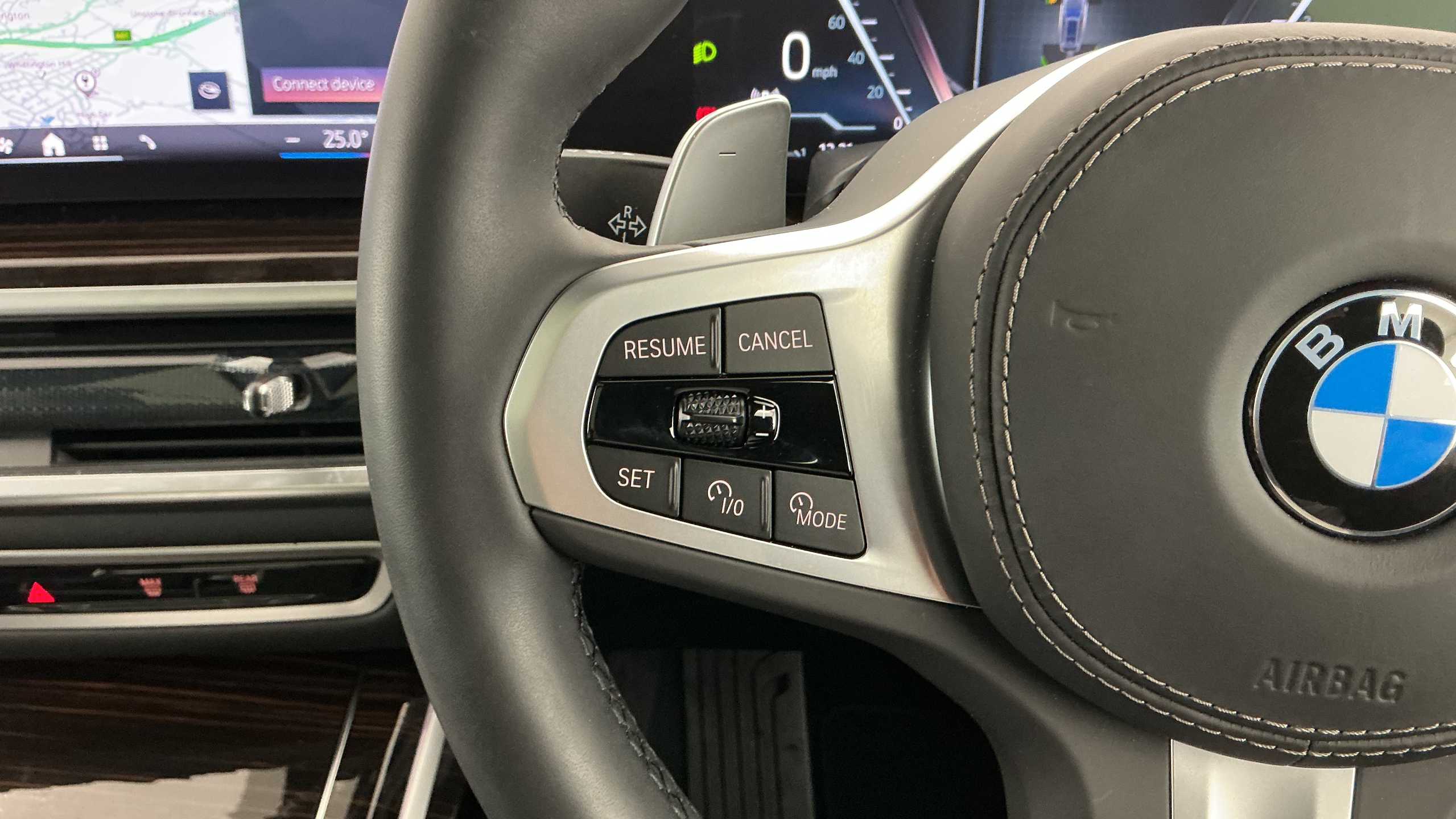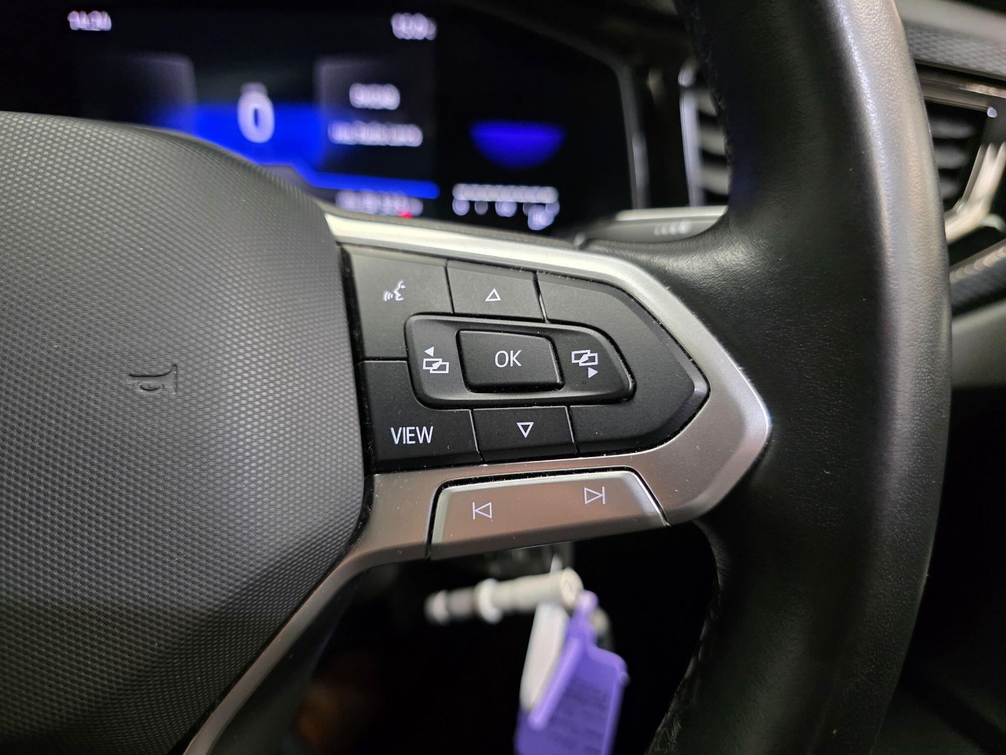 "Three spoke leather wrapped multifunction steering wheel with shifting paddles"