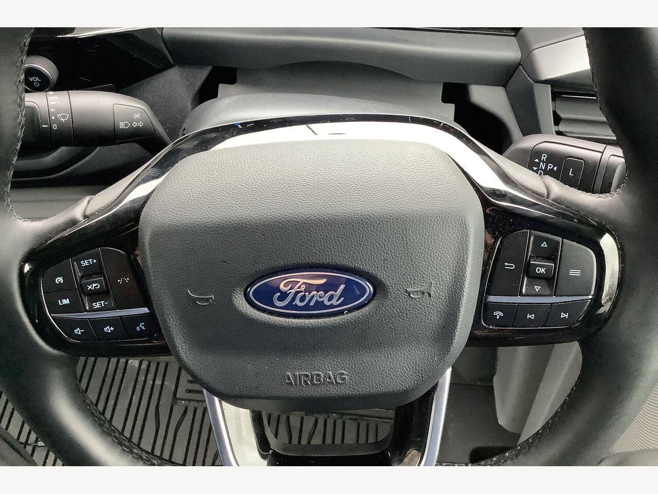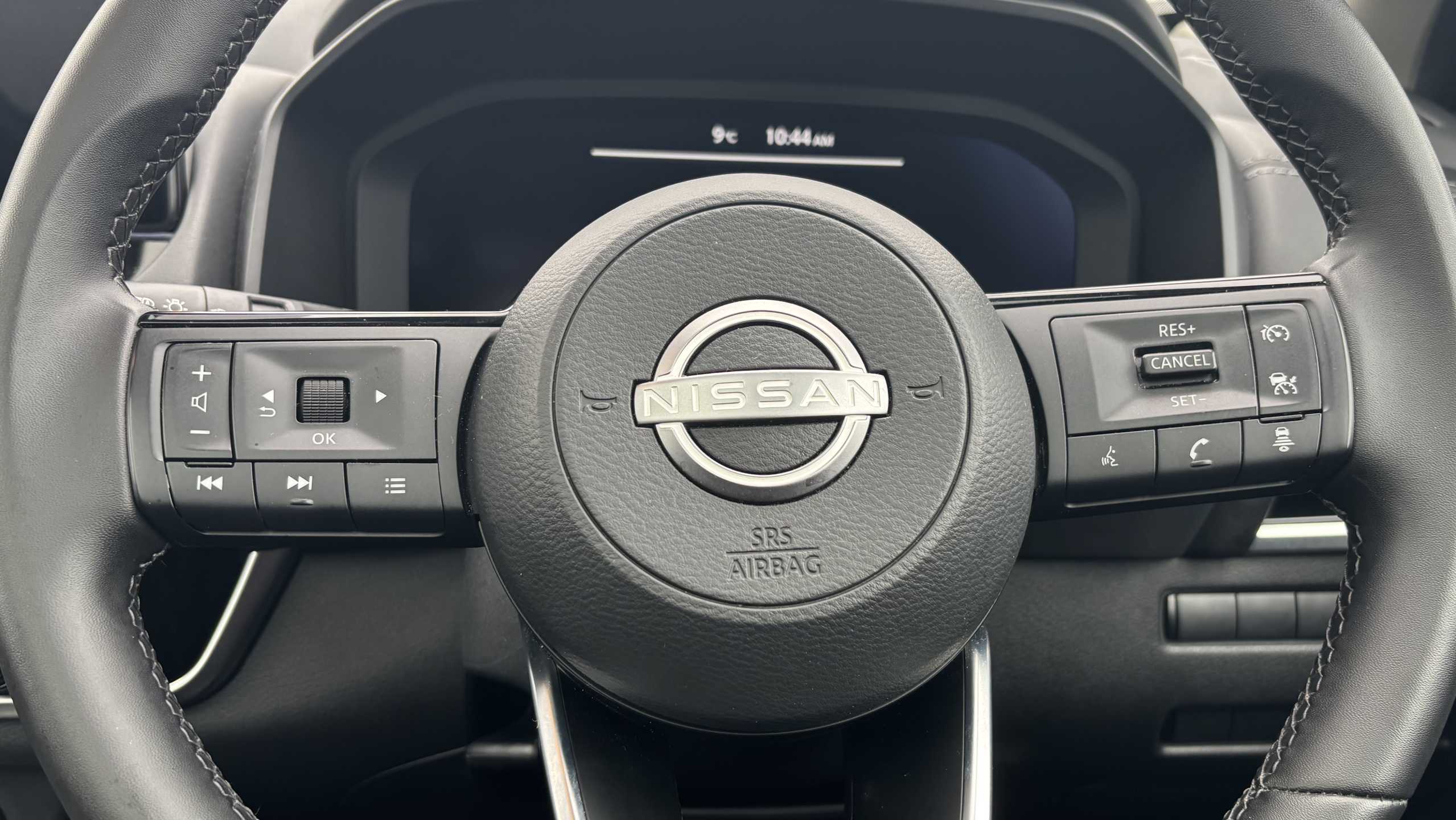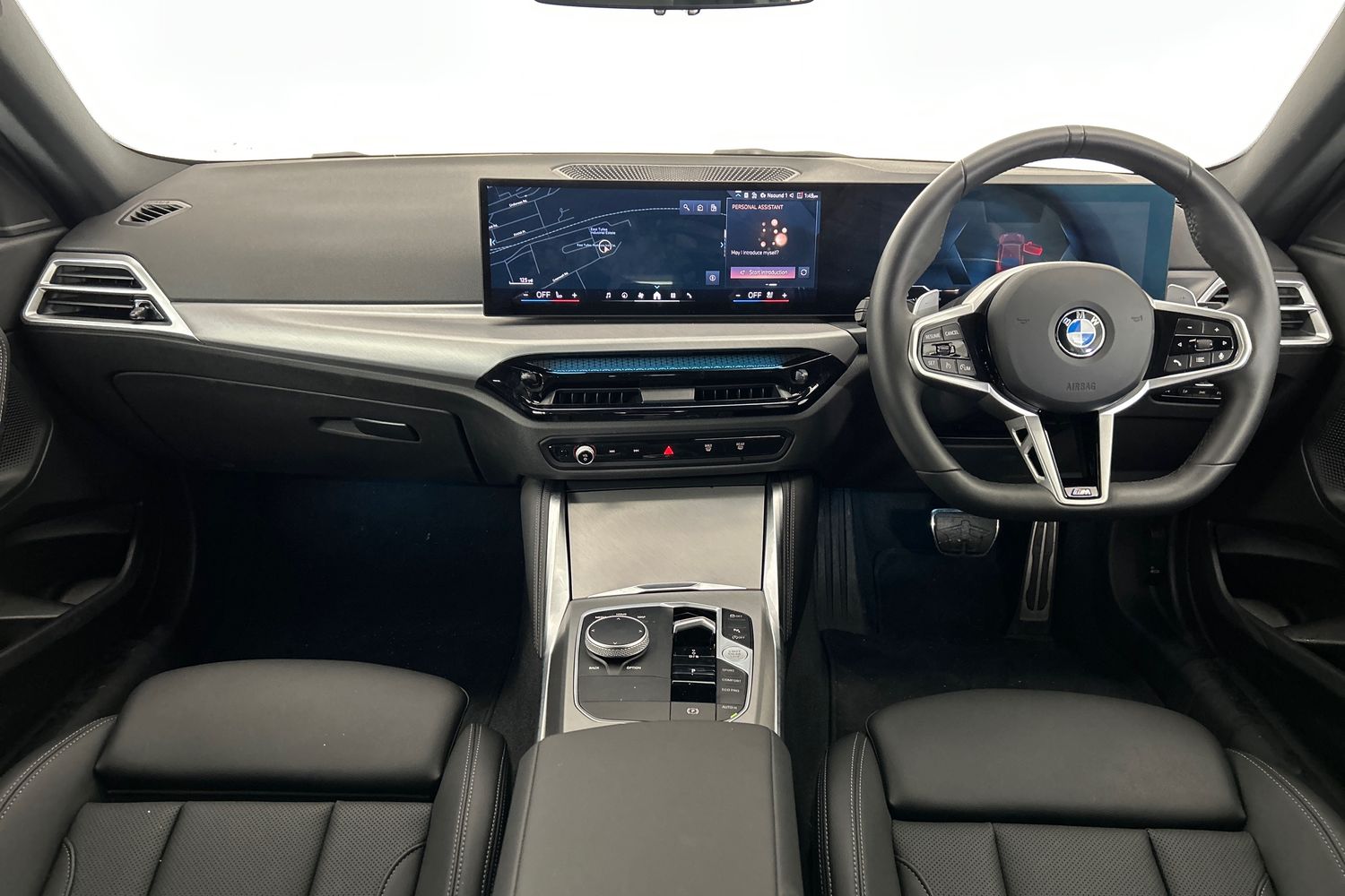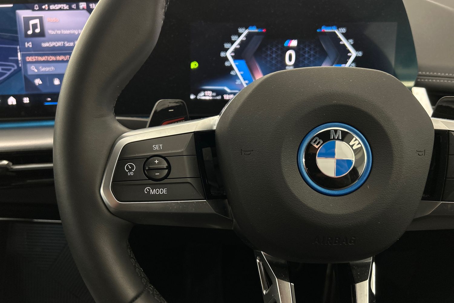 "Three spoke leather wrapped multifunction steering wheel with shifting paddles"