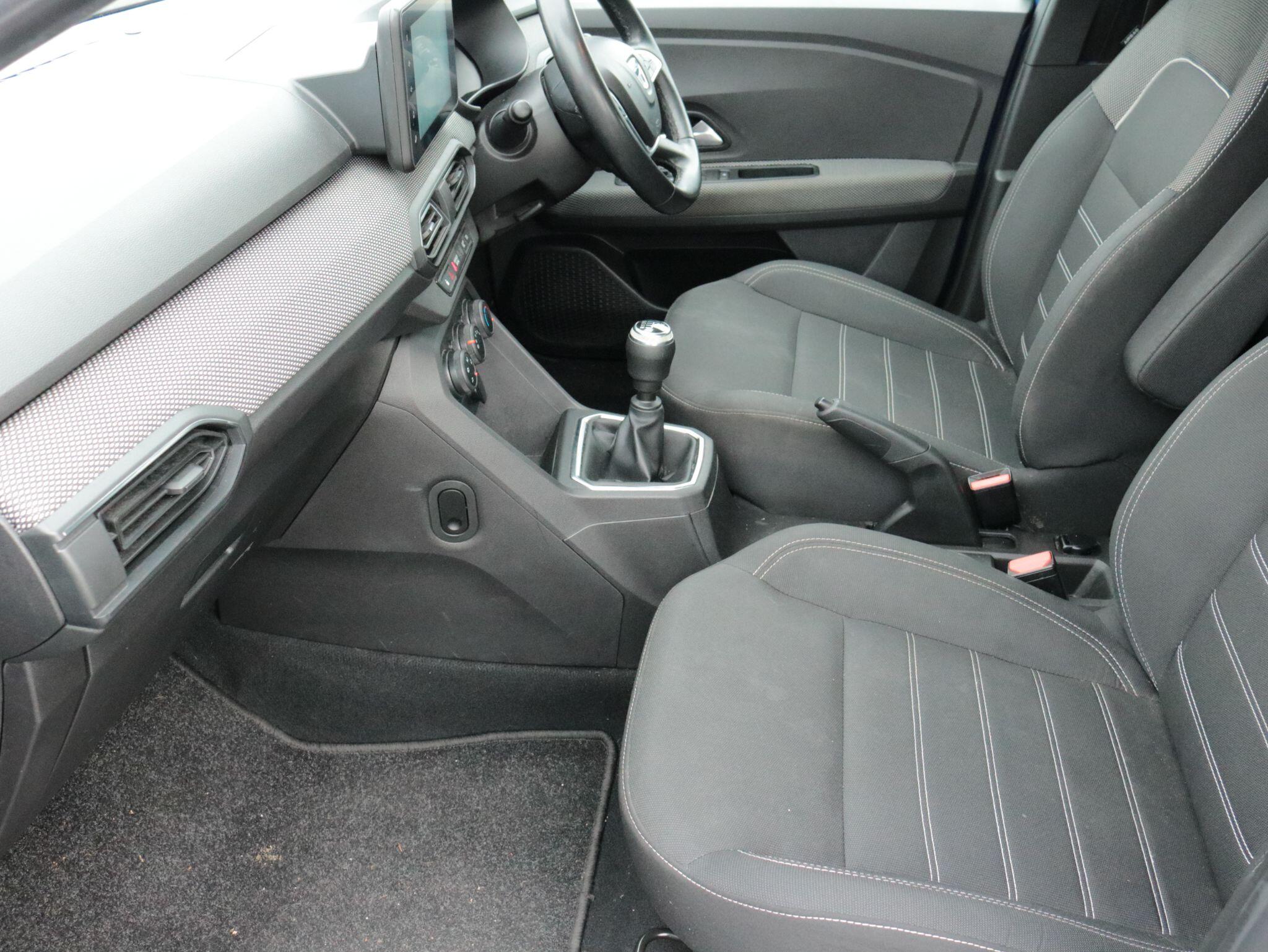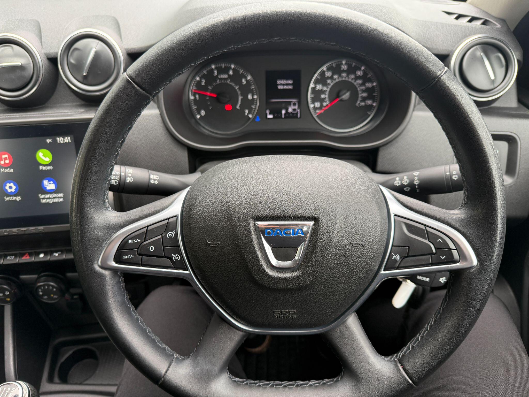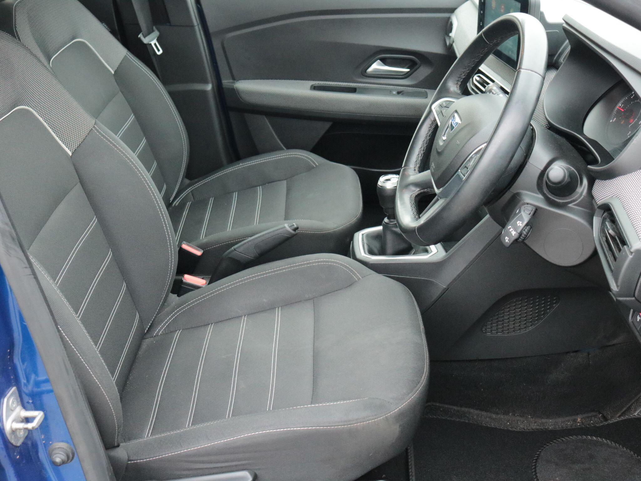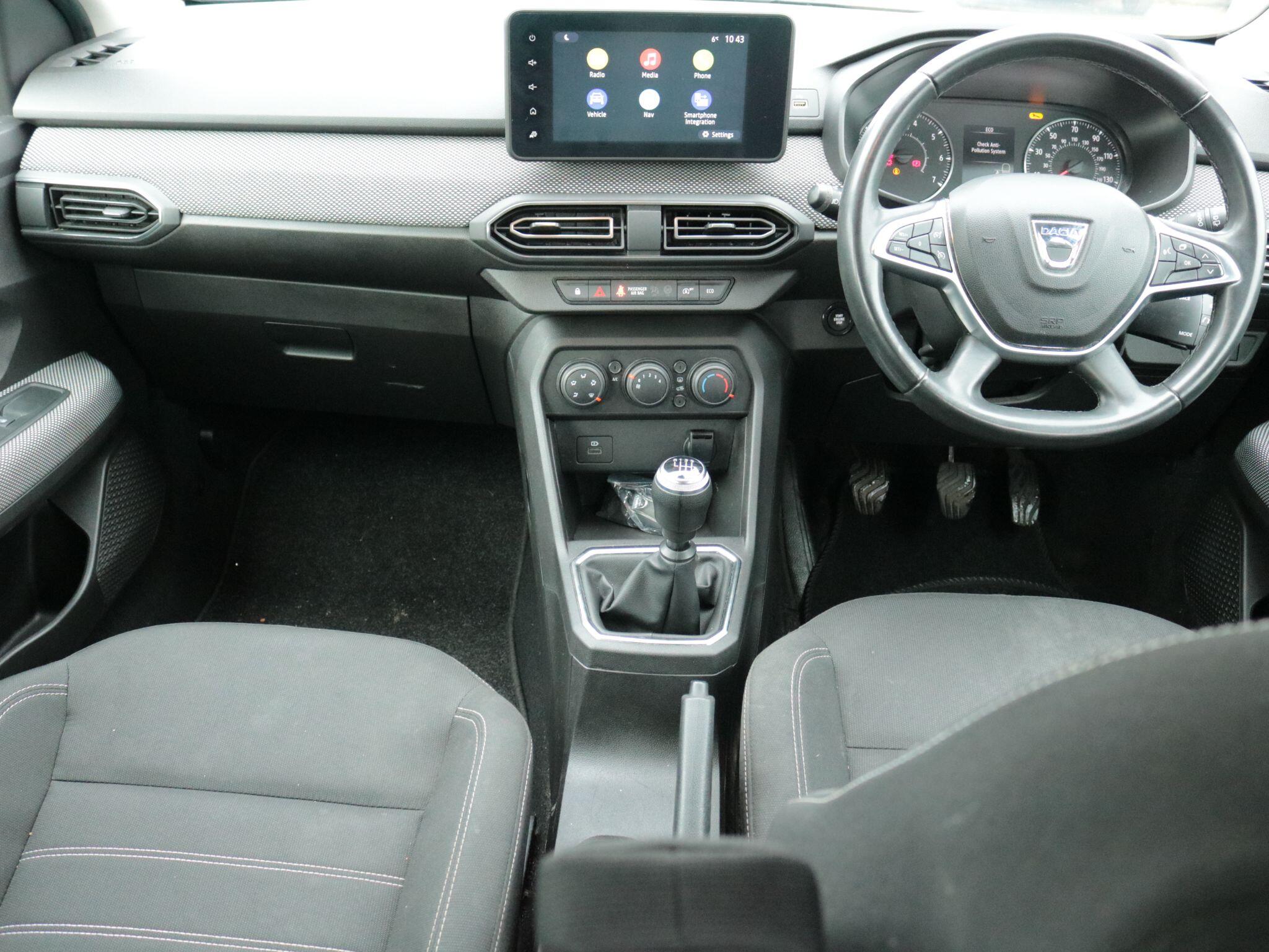 "features": "3.5\" TFT instrument panel with on-board computer, Cruise control with speed limiter, eCall emergency call system, Eco mode, Electric power assisted steering, Rear parking sensors, Rev counter, Reversing camera, Stop/start system, 8\" Media display - DAB radio, smartphone replication, bluetooth, 4 speakers, Apple CarPlay and Android Auto, Pre-wiring for radio and speakers, USB connection for data transfer and charging, USB socket, 3 speed windscreen wipers, Auto lighting, Automatic wipers, Black radiator grille, Body colour door handles, Body colour door mirrors, Body coloured bumpers, Electrically adjustable and heated door mirrors, Front fog lights, Heated rear window, High level third brake light, LED automatic daytime running lights, LED Y shape Dacia signature lighting, One touch electric front windows, Rear electric windows, Rear wash/wipe, Tinted windows, 1/3 to 2/3 split folding rear seats, 12 volt front socket, 12 volt rear socket, 3 height adjustable rear headrests, Double satin chrome air vents, Driver + passenger vanity mirrors, Fabric upholstery, Fixed smartphone holder on dashboard, Front armrest, Gear shift indicator, Height adjustable driver seat, Height adjustable front headrests, Height/depth adjustable steering wheel, Isofix points for child seats in both outer rear seats, Manual air conditioning, Satin chrome interior door handles, Soft feel steering wheel, Steering wheel controls, 3x3 point rear seatbelts, ABS and Emergency brake assist, Automatic emergency braking system, Child locks on rear doors, Door open warning, Driver airbag, ESC (Electronic Stability Control), ESP (Electronic Stability Program) + Hill Start Assist, Front curtain airbags, Front seatbelt pretensioners, Front side airbags, Height adjustable front seatbelts, Passenger airbag, Seatbelt reminder for driver and front passenger, Tyre pressure monitor, Automatic central locking, Immobiliser, Keyless entry, Remote central locking, Decopart on instrument panel and door with textile, 15\" Flex wheels with full wheel cap, ",
