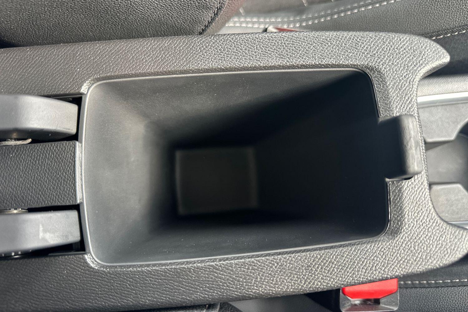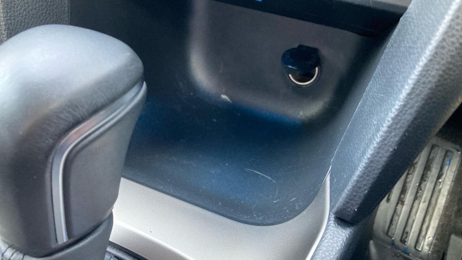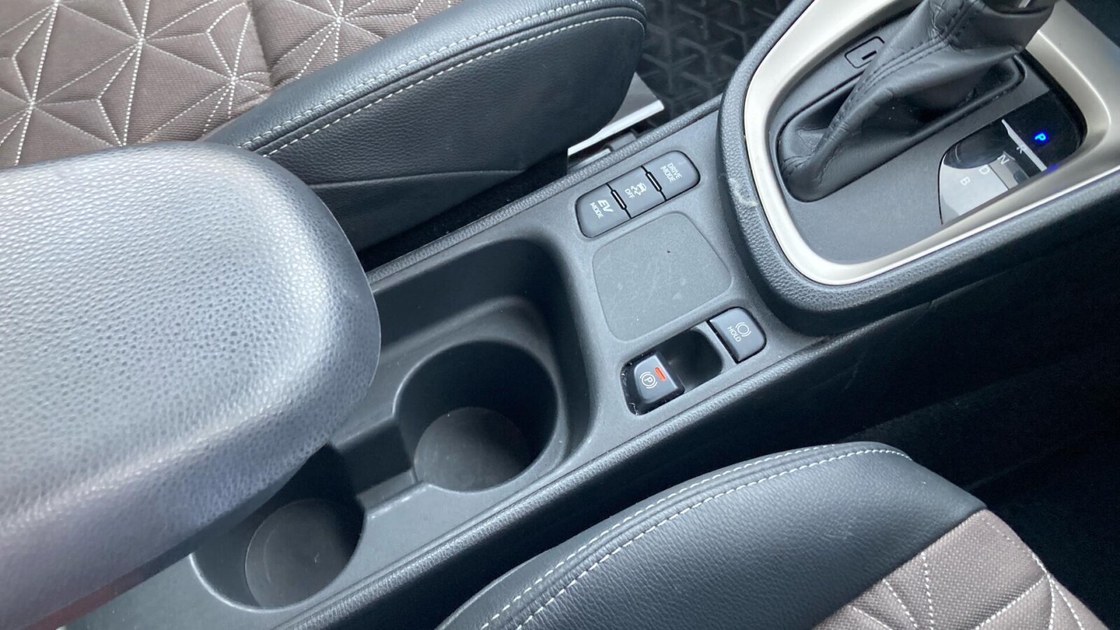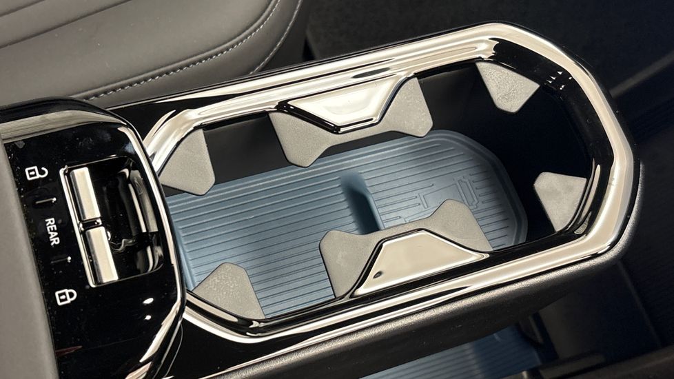 "Blue ambient lighting on front cup holders",