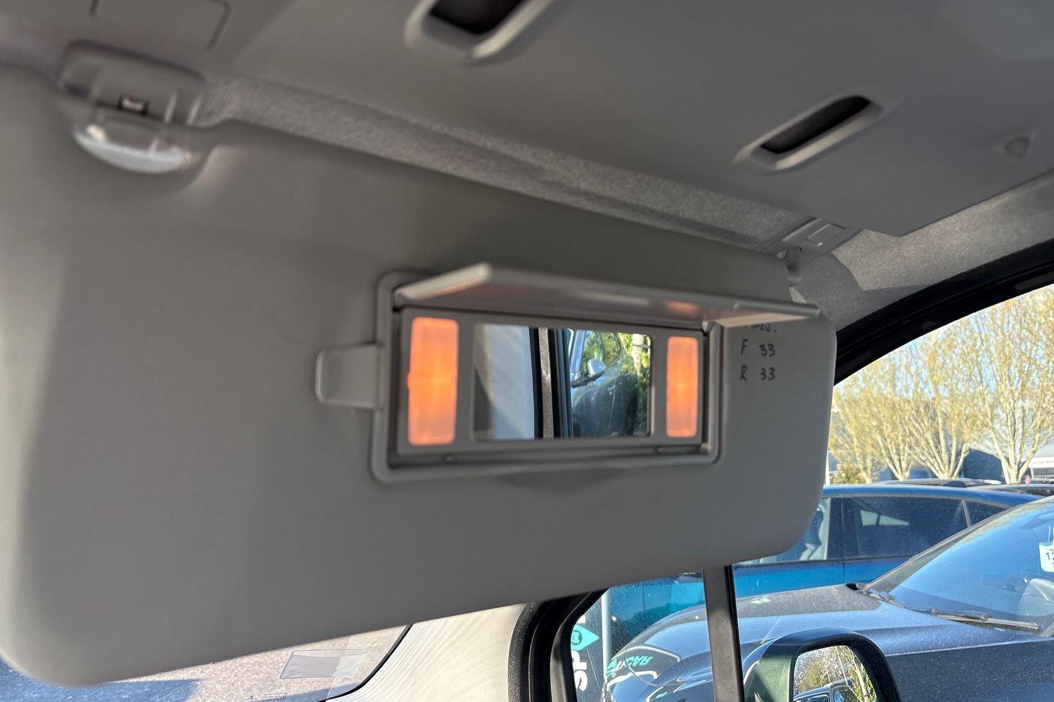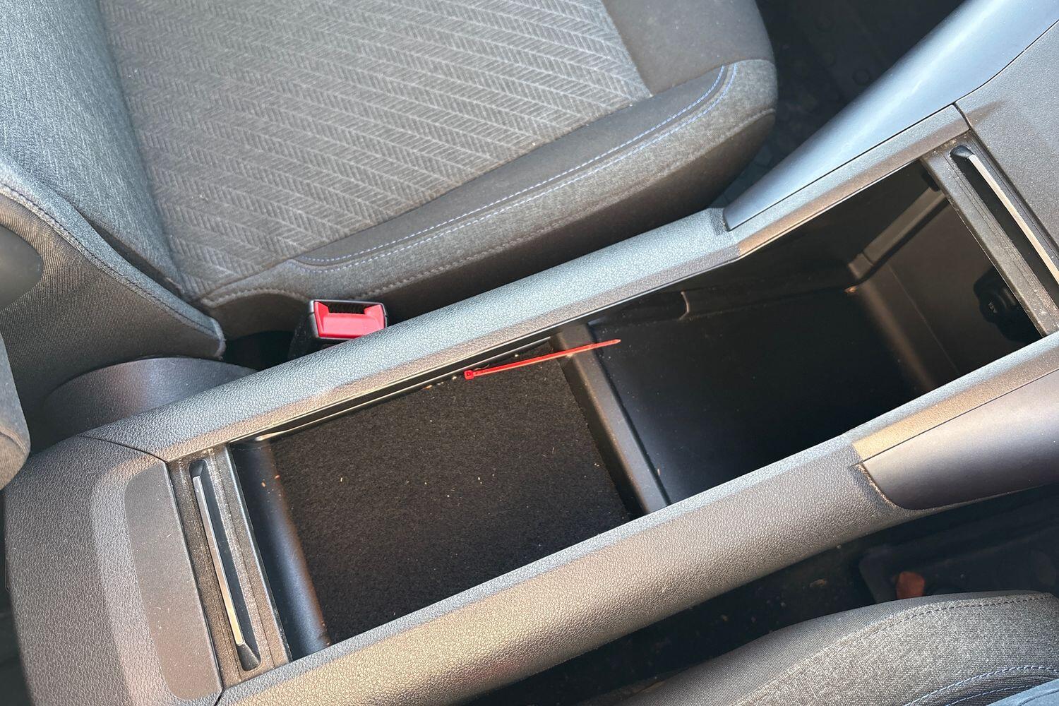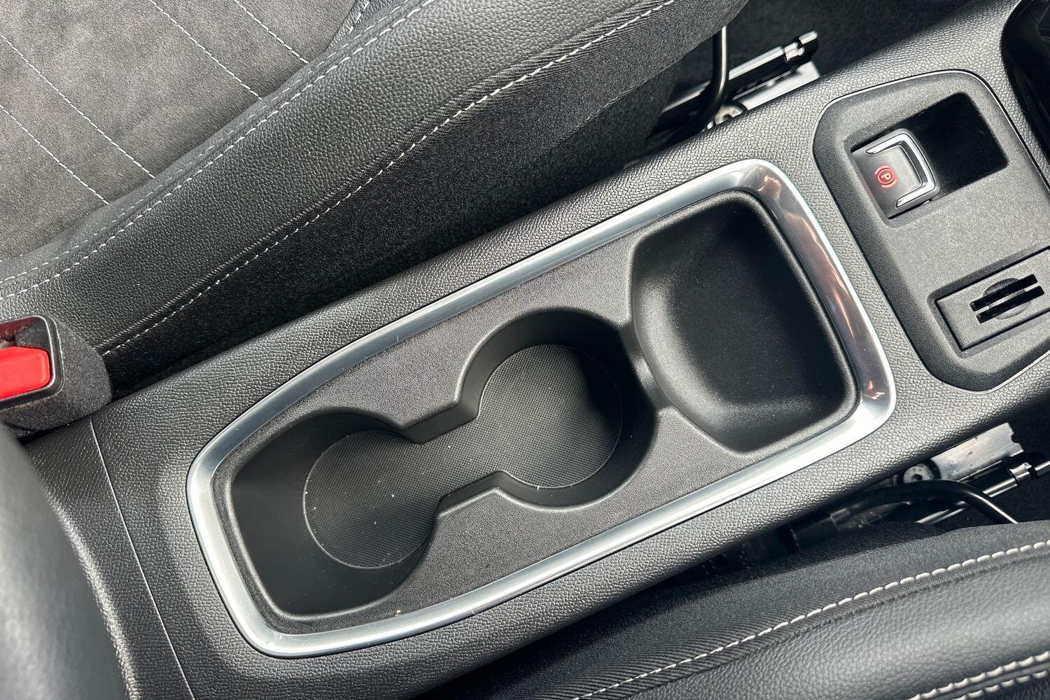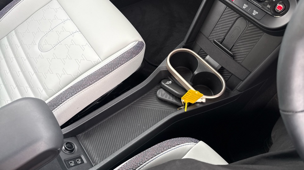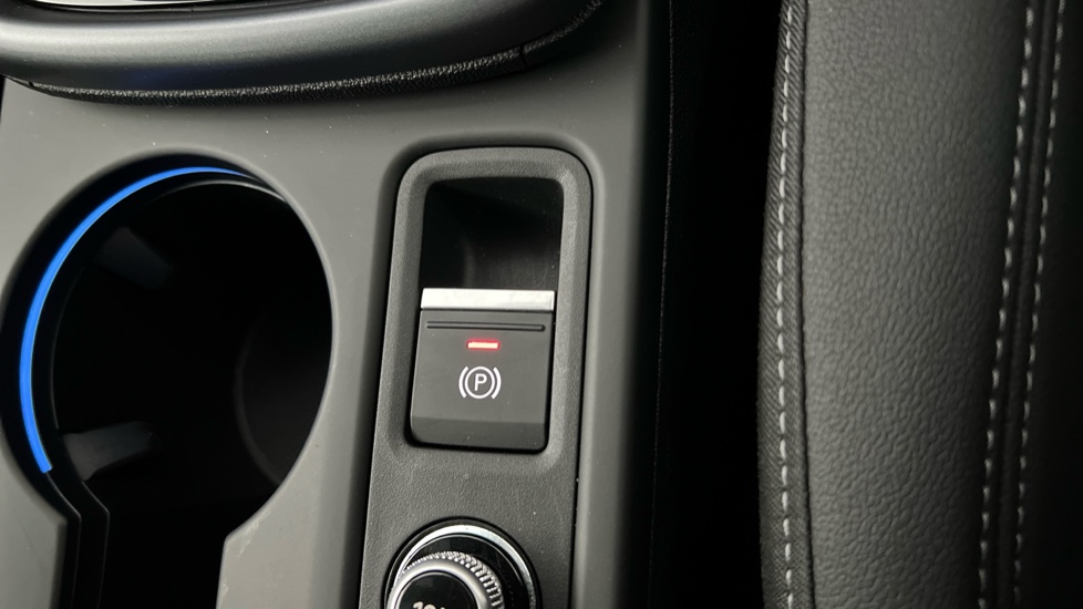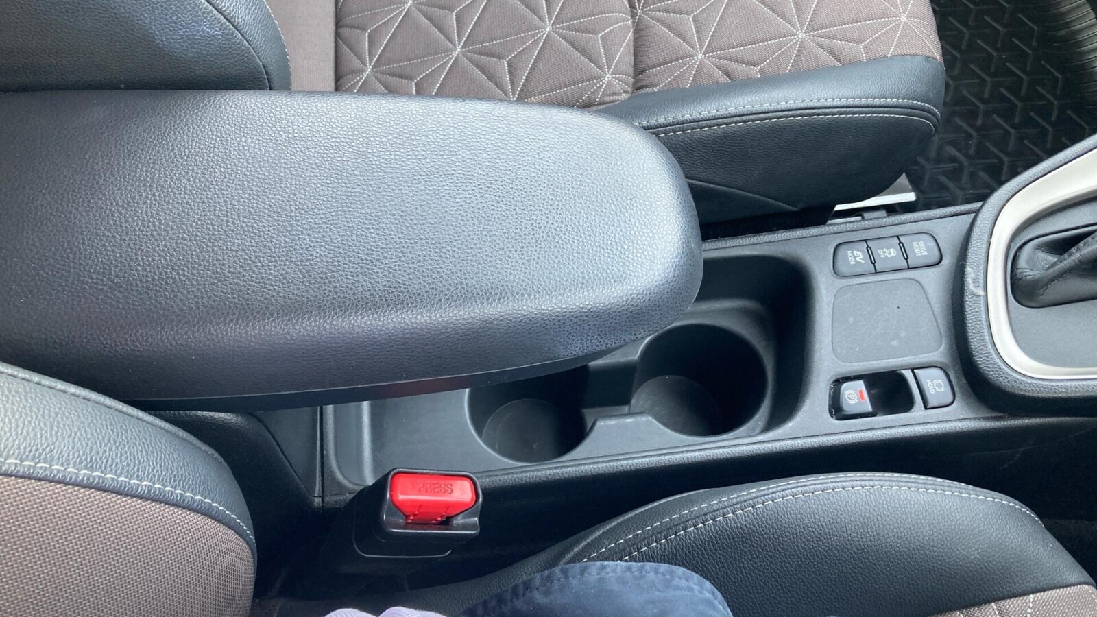 "Blue ambient lighting on front cup holders",
