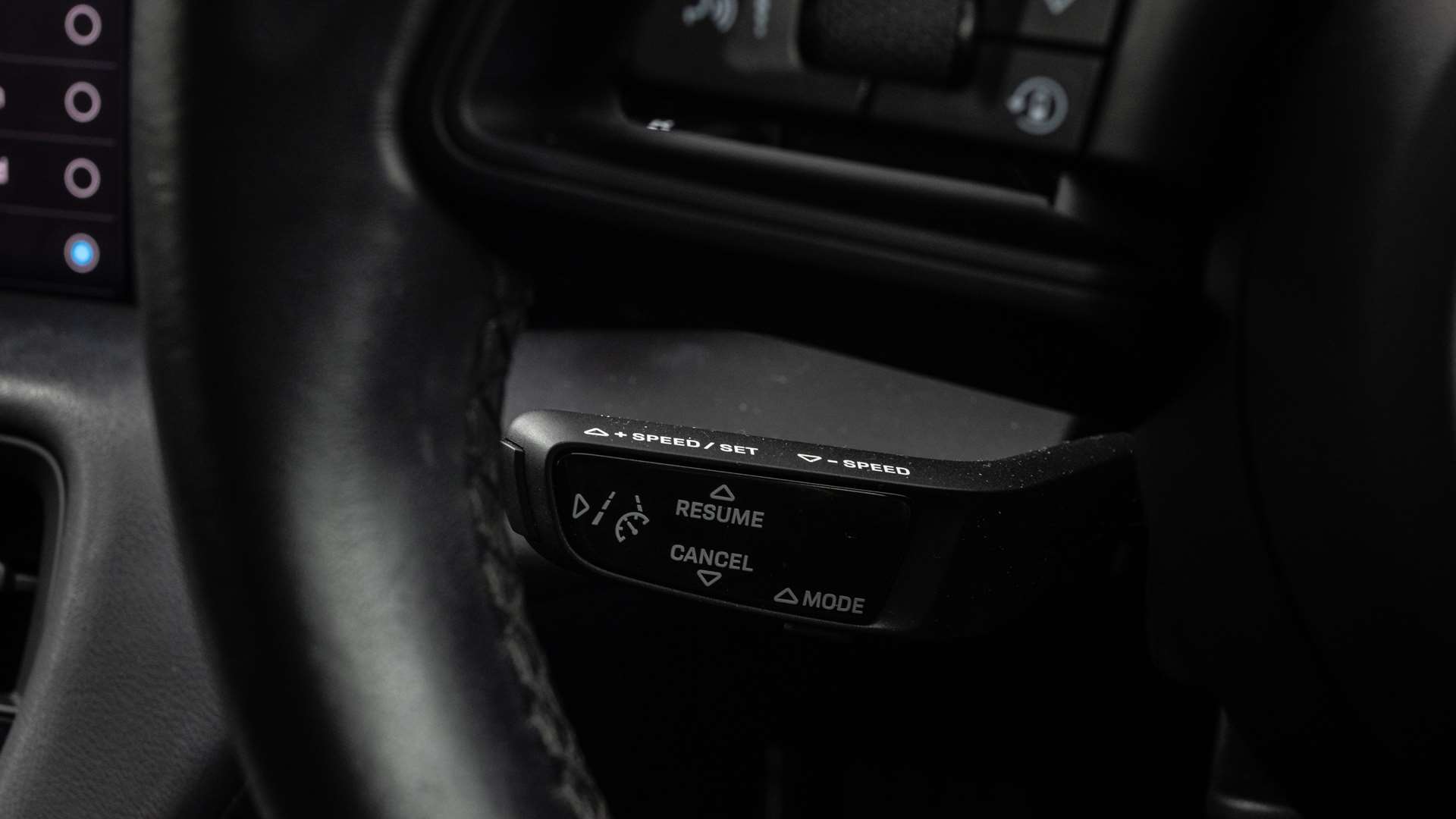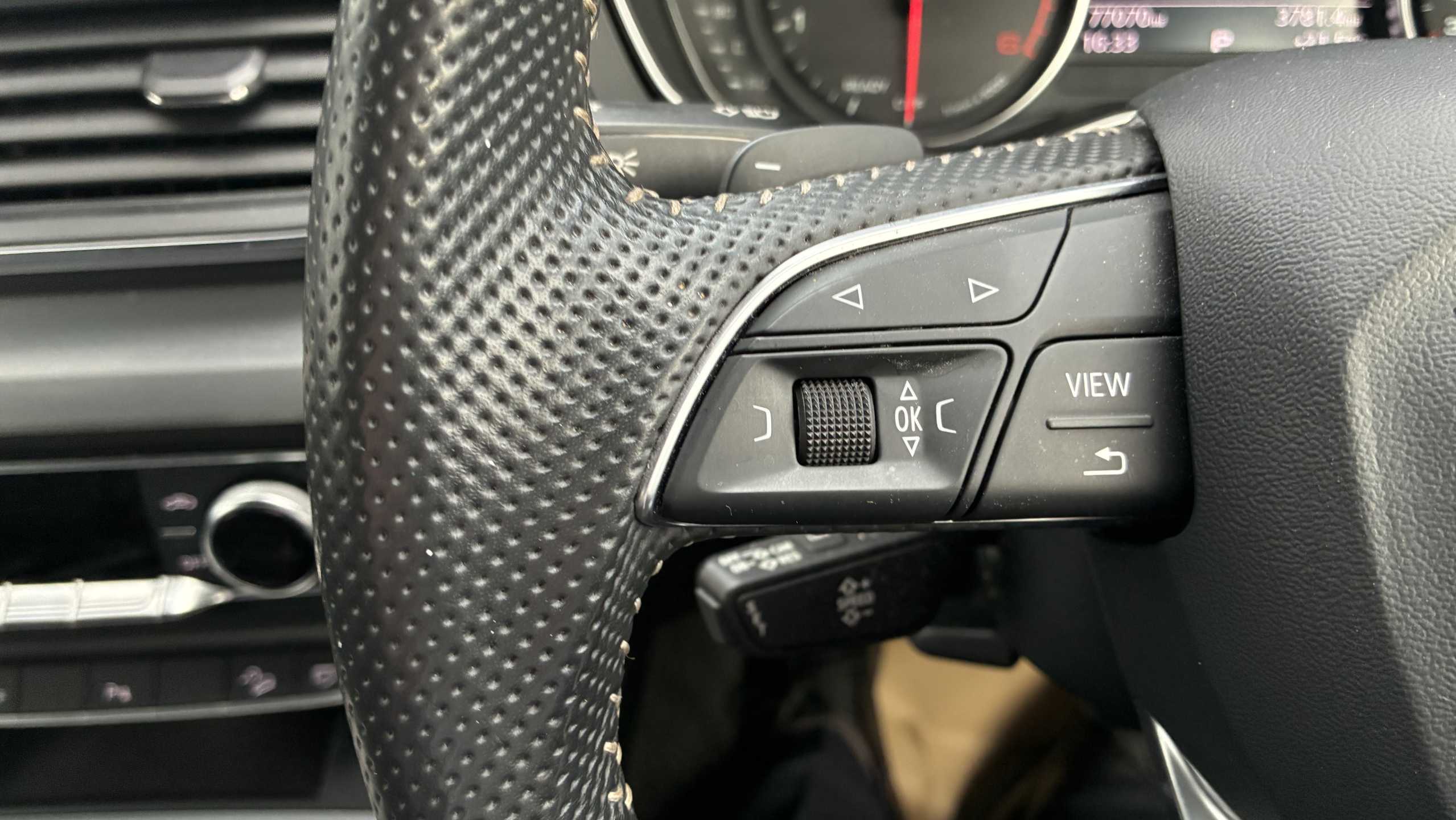 "Mistral full-grain perforated leather steering wheel with Lime Green stitch detail and satin chrome 'GT' emblem",