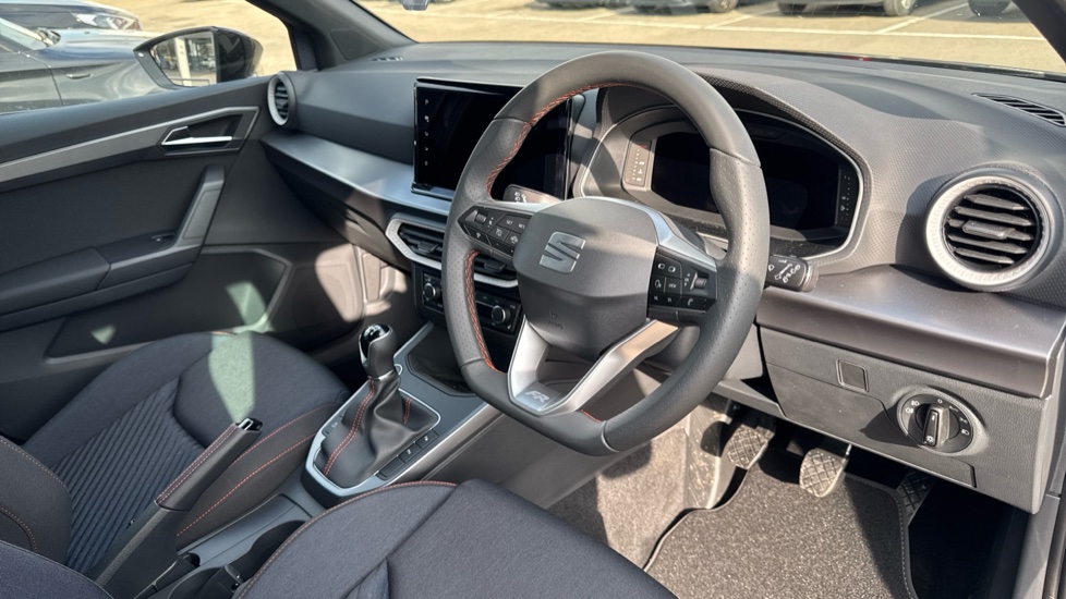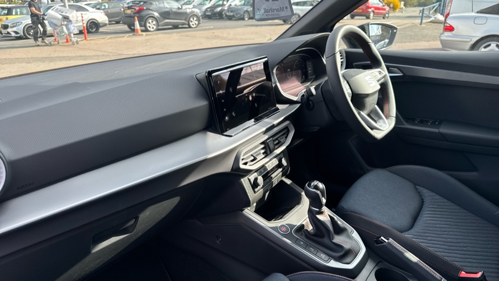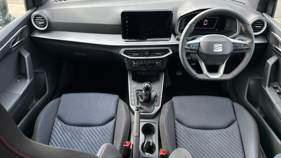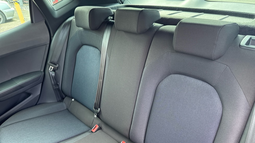 "Ebony console door armrests and seatbelts",