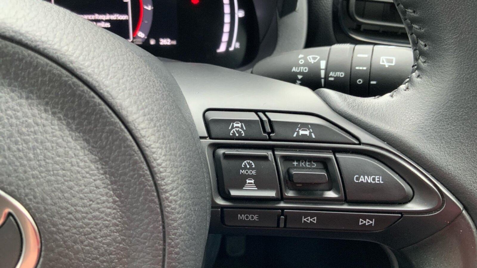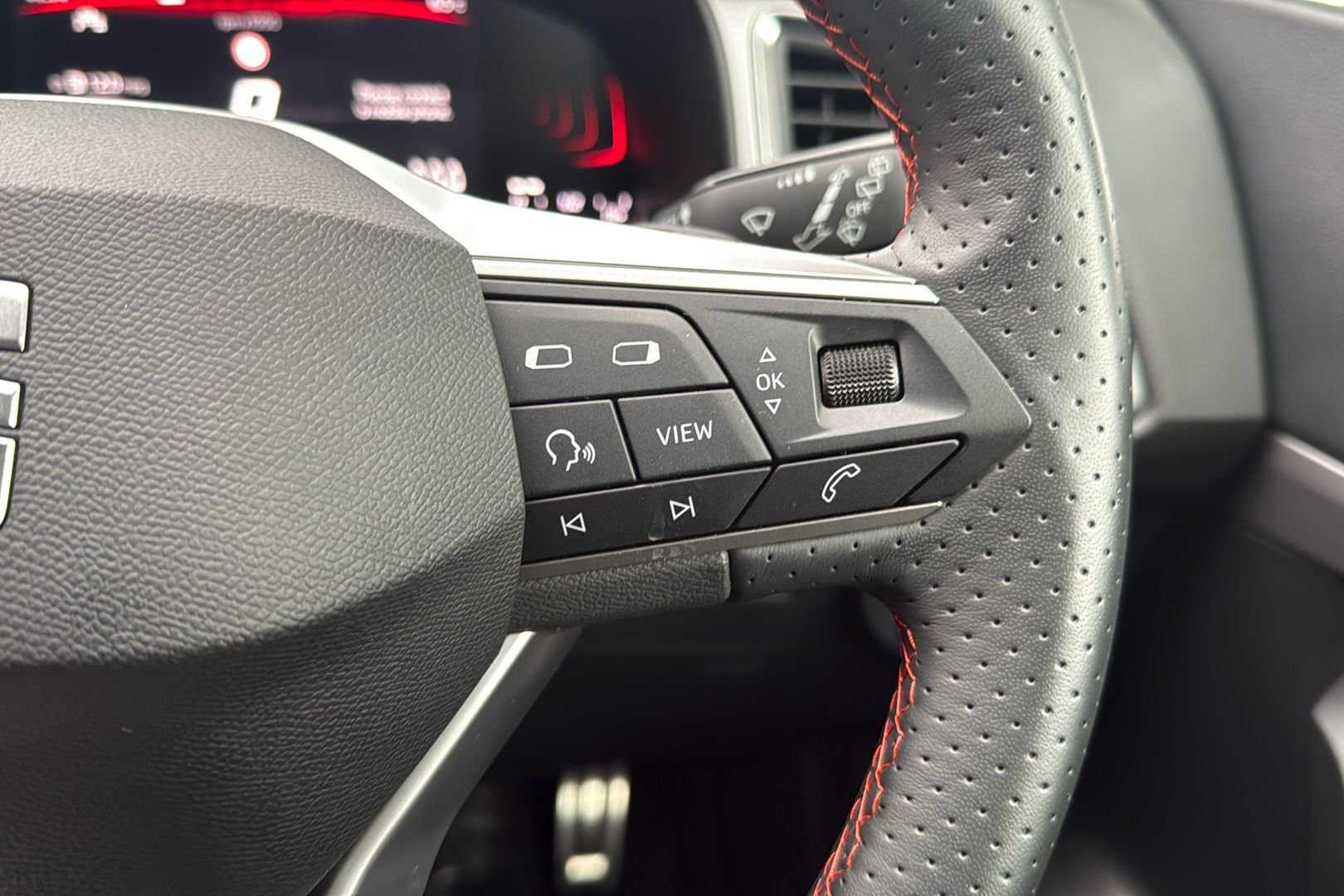 "Compact heated multifunction steering wheel with full grain leather Iced Clay stitching, gloss black and satin chrome detailing and GT badge",