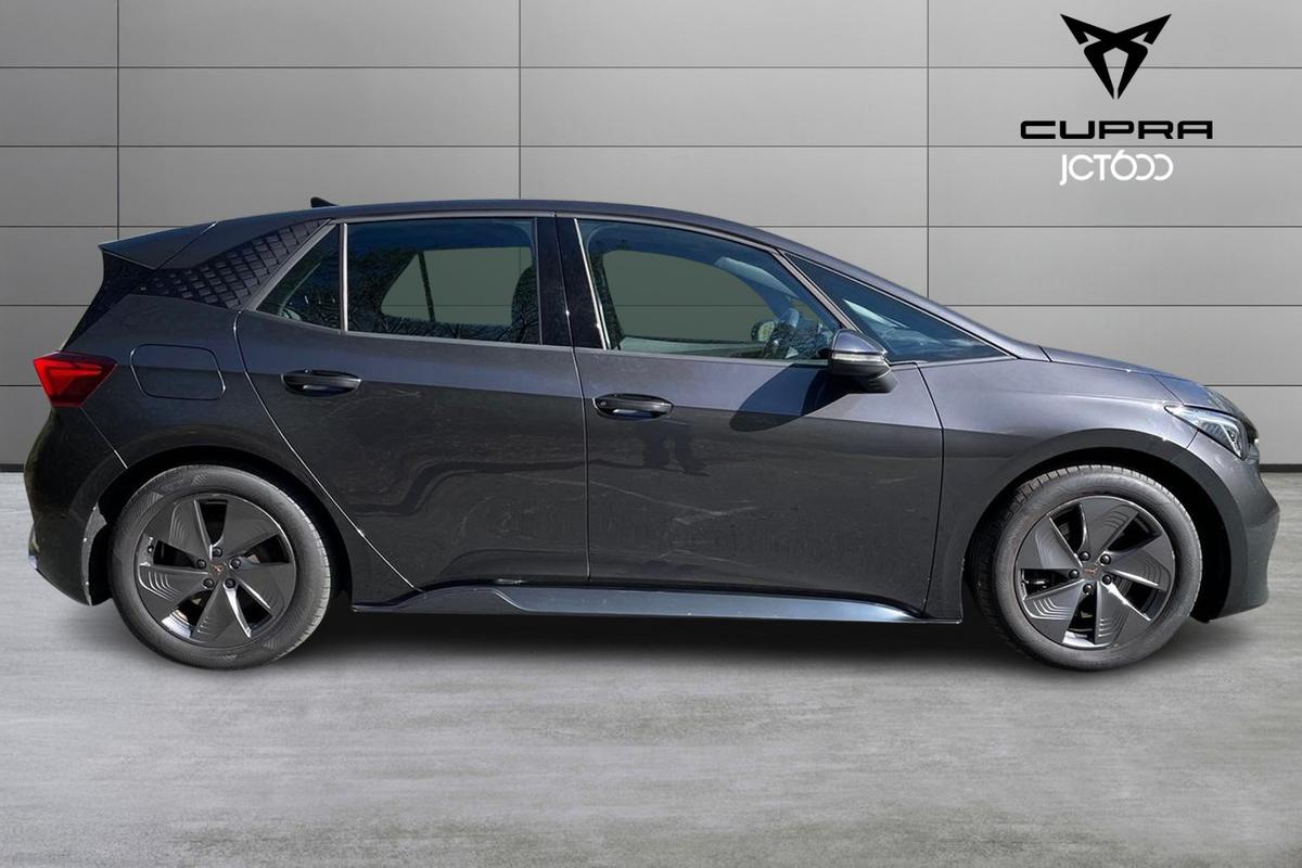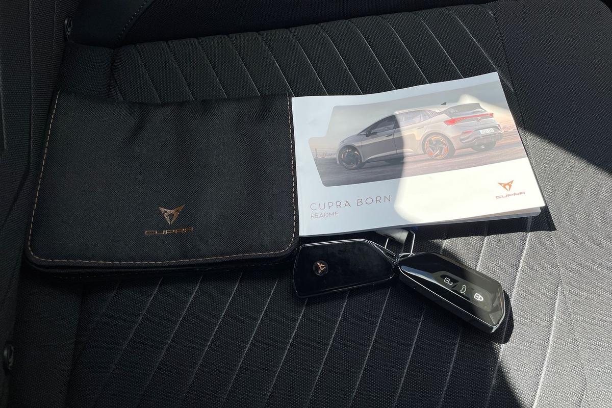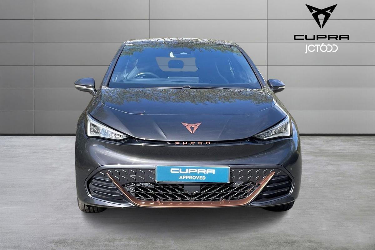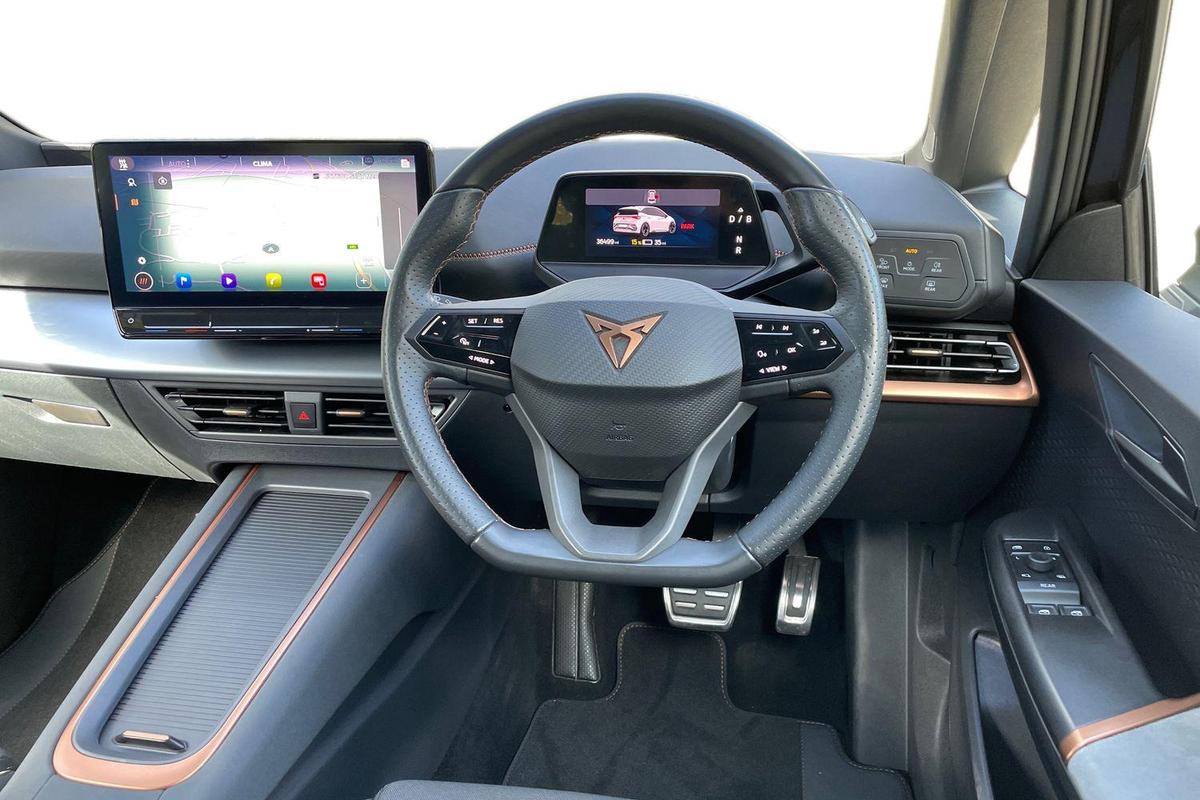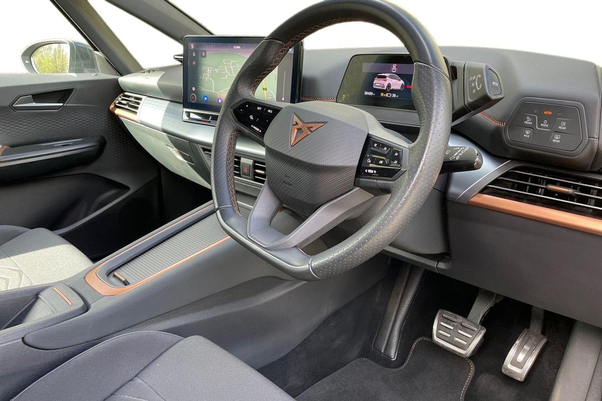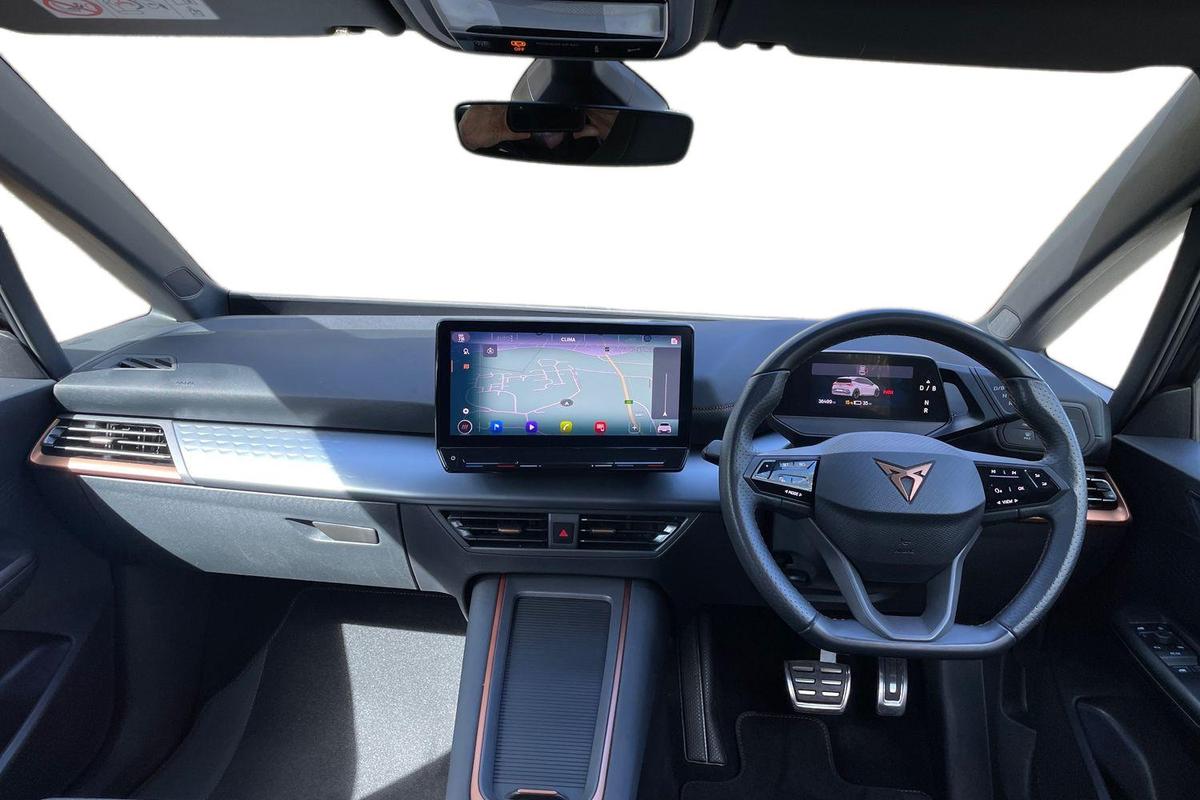 "features": "5.3\" digital cockpit with 12\" central display infotainment system, Bluetooth without wireless charger, Driving profile selection - Range, Comfort, Performance, Individual, Dynamic steering, e-call service, Emergency steering support with turn assist, Forward collision warning with automatic braking, Front/rear park distance control, Lane assist, Tailgate, Voice assistant, Wireless full link smartphone integration, Shock absorption in front, Sports rear shock absorption, 2x USB sockets in front, 2x USB sockets in rear, charge only, DAB (Digital Audio Broadcasting) and AM/FM radio, Acoustic windshield, Auto dimming rear view mirror, Daytime running lights, Electric adjustable/heated/folding door mirrors, Full LED headlights, Grey exterior mirrors, Heat insulated glass, LED 3rd brake light, LED rear lights, Rear side wing doors, Rear wiper, Transport protection film, Variable intermittent wiper, Welcome home function and adverse weather function, Windshield wiper with light/rain sensor, 3 seat bench in 2nd row, Aluminium pedals, CUPRA emblem on steering wheel, Dual zone climate control, Electric auxiliary air heater, Heated leather wrapped multi function steering wheel, Integrated front head restraints, ISOFIX points in outer rear seats with top tether anchorage points, Manual height adjustable front seats, Multi-colour ambient interior lighting, Rear headrests, SEAQUAL Yarn cloth upholstery, Single front passenger seat, Sunvisors with illuminated mirror, Unsplit rear seat bench, split folding backrest, without centre armrest, Pilot M pack - Born, 3 point seatbelts on all rear seats, Driver and front passenger airbags with front passenger airbag deactivation, side airbag in front with curtain airbag and front interaction airbag, Extended safety system with proactive passenger protection system, Manual child lock in rear doors, Tiredness recognition system, driver alert system, Tyre pressure monitoring system, Visual and acoustic seat belt reminder, Anti theft alarm system with interior monitoring in cab, backup horn and towing protection, Anti theft wheel bolts, Keyless go central locking system, 18\" Cyclone alloy wheels, Tool kit, Tyre repair kit, ",
