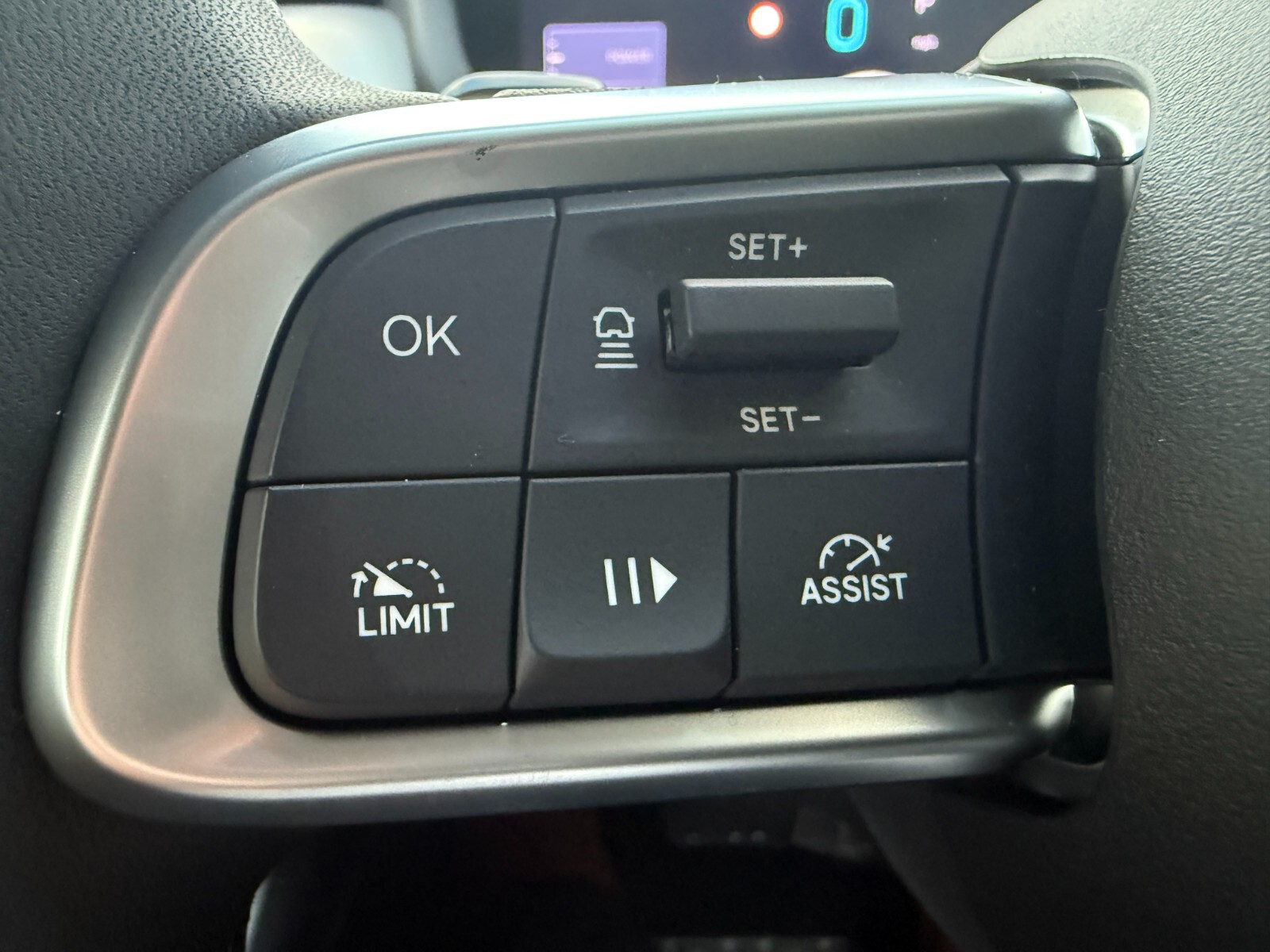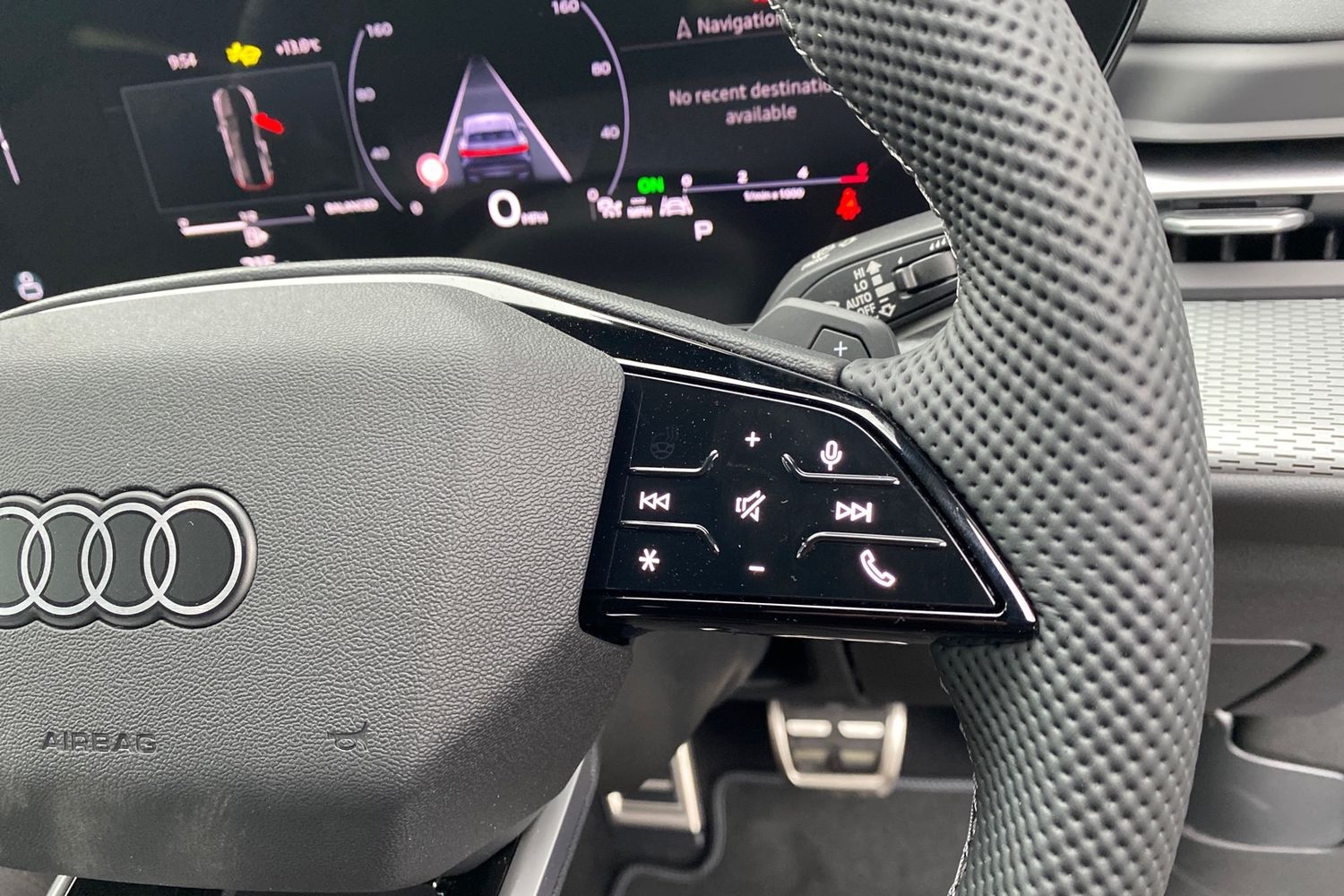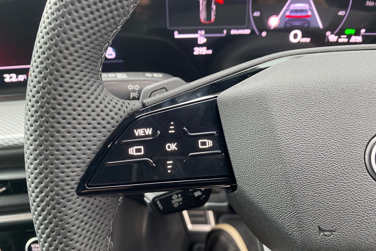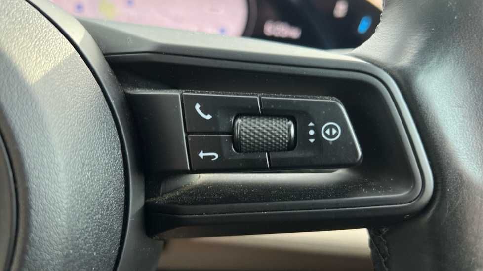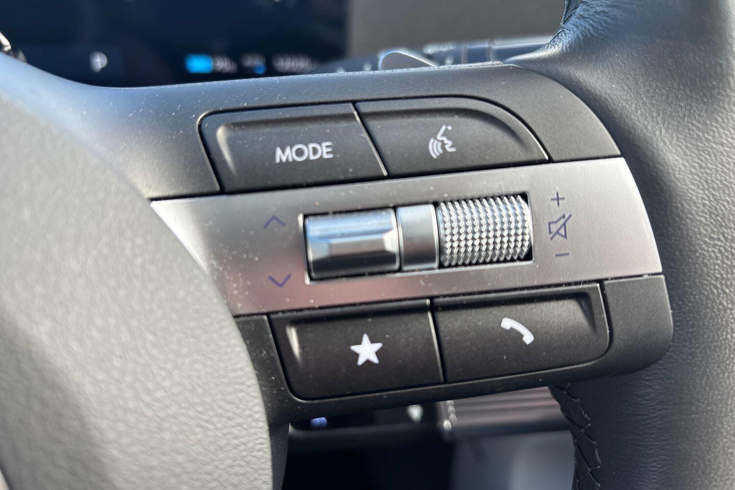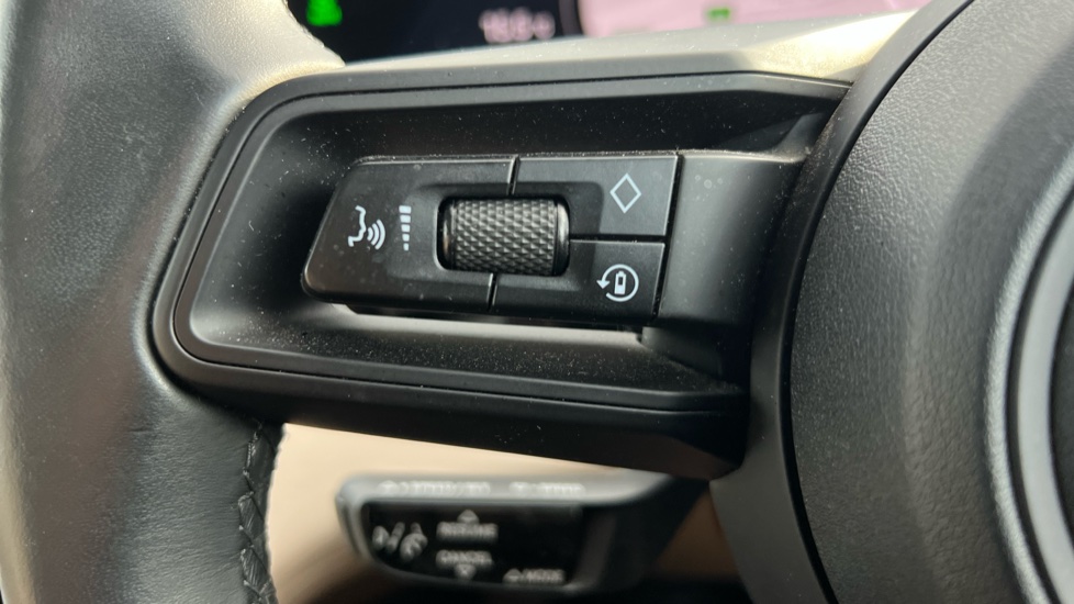 "Sport leather steering wheel with speed limiter and audio/communication controls",