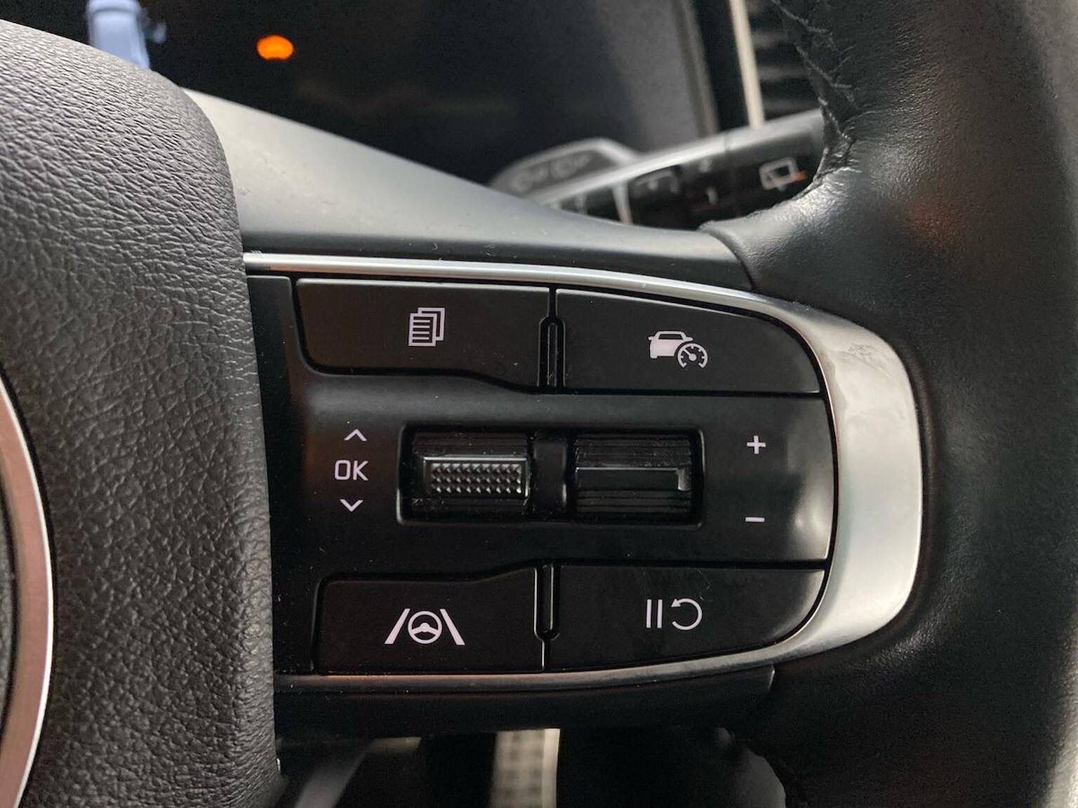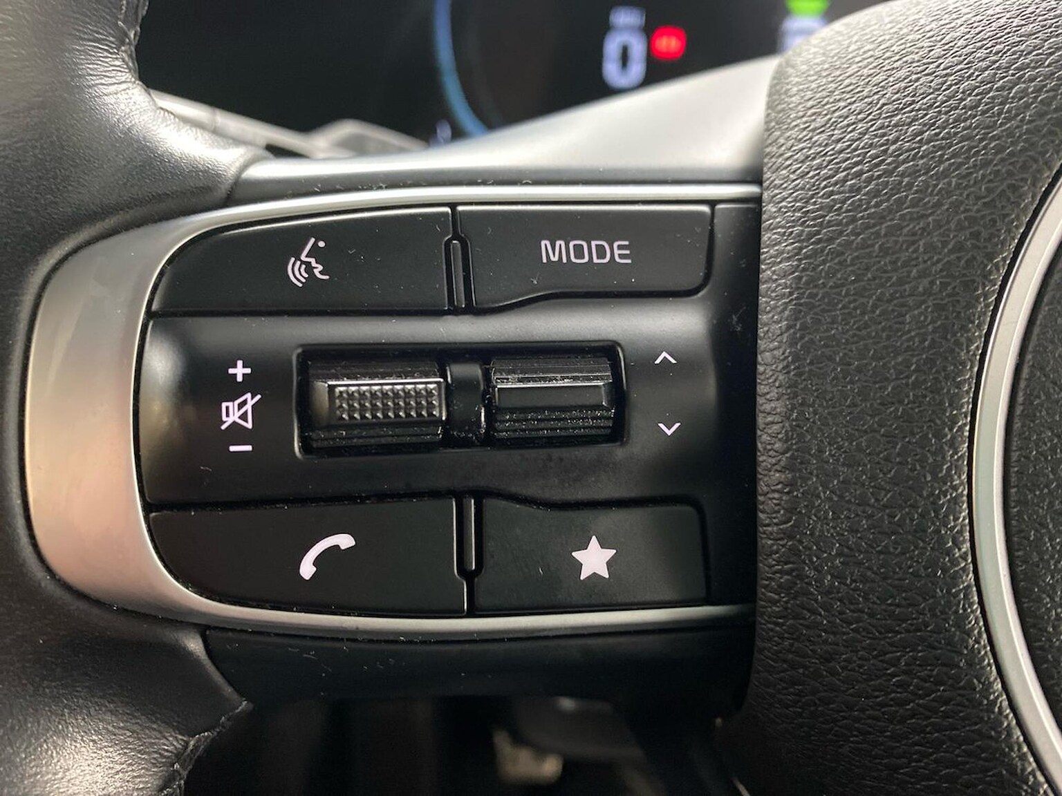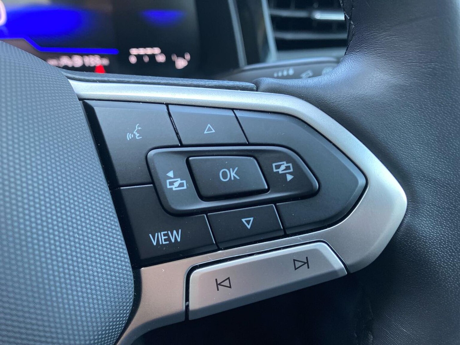"Three spoke leather wrapped multifunction steering wheel"