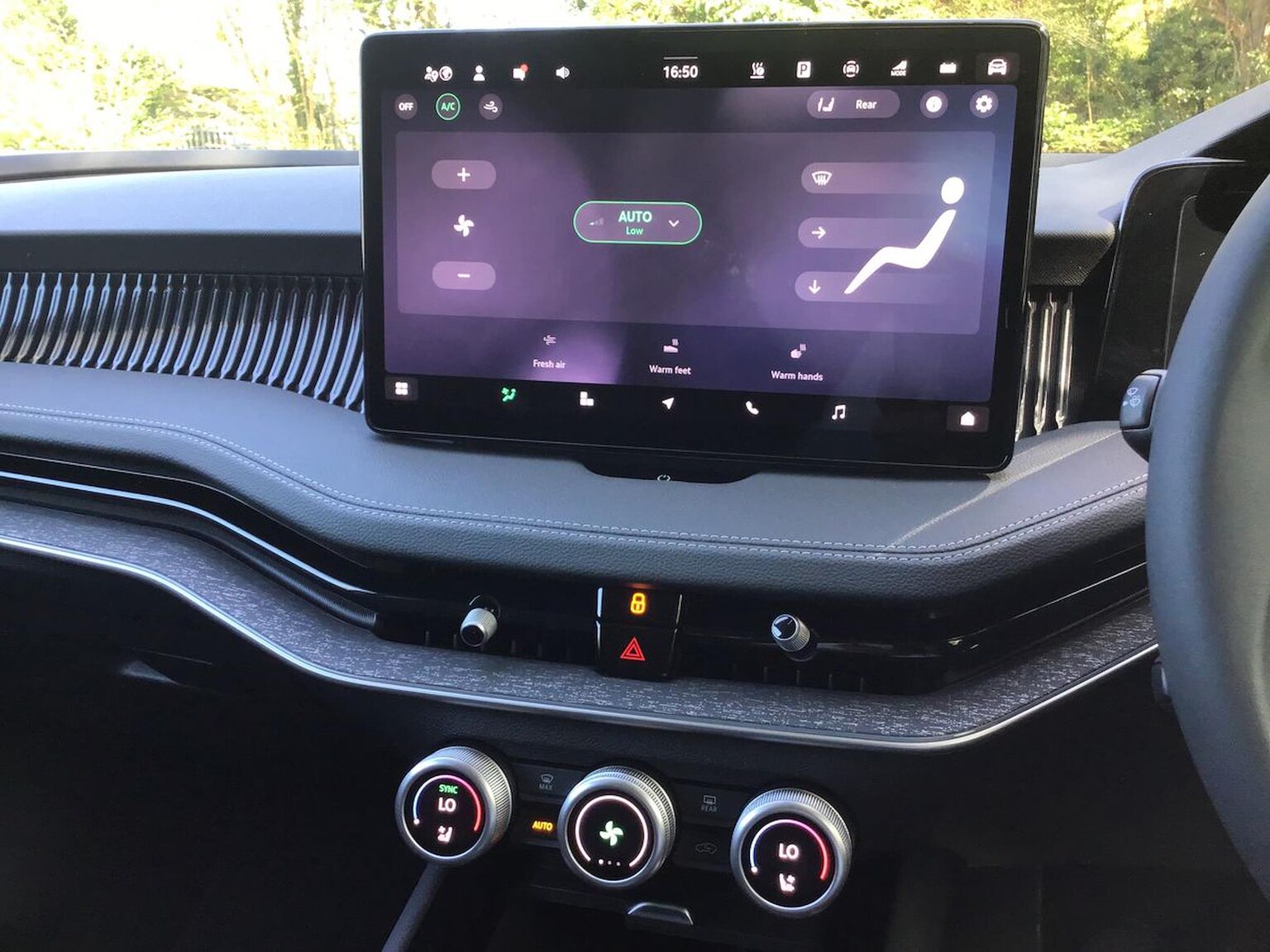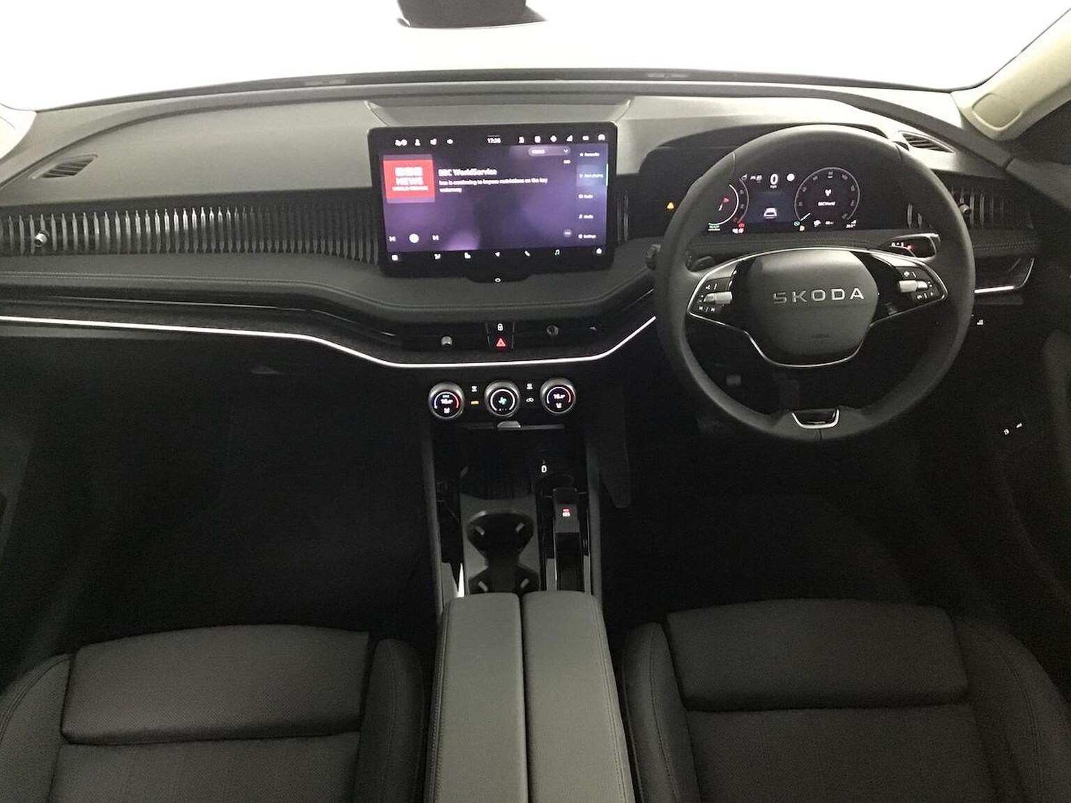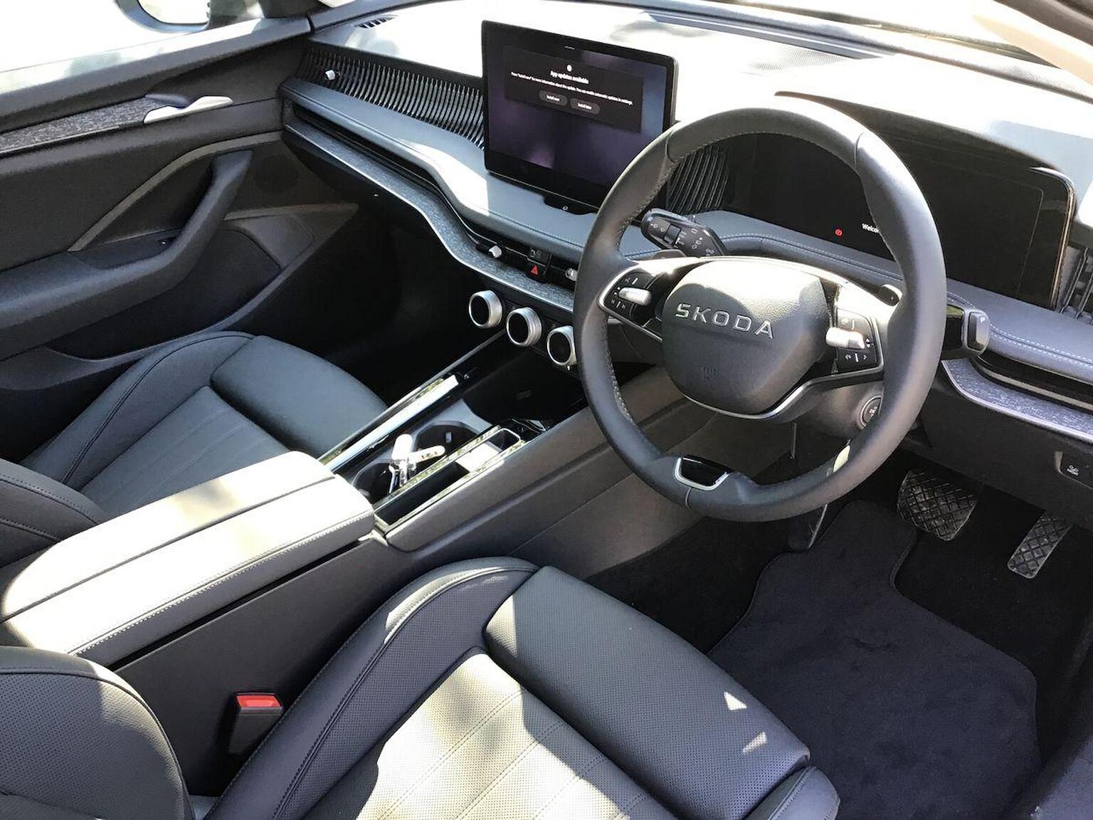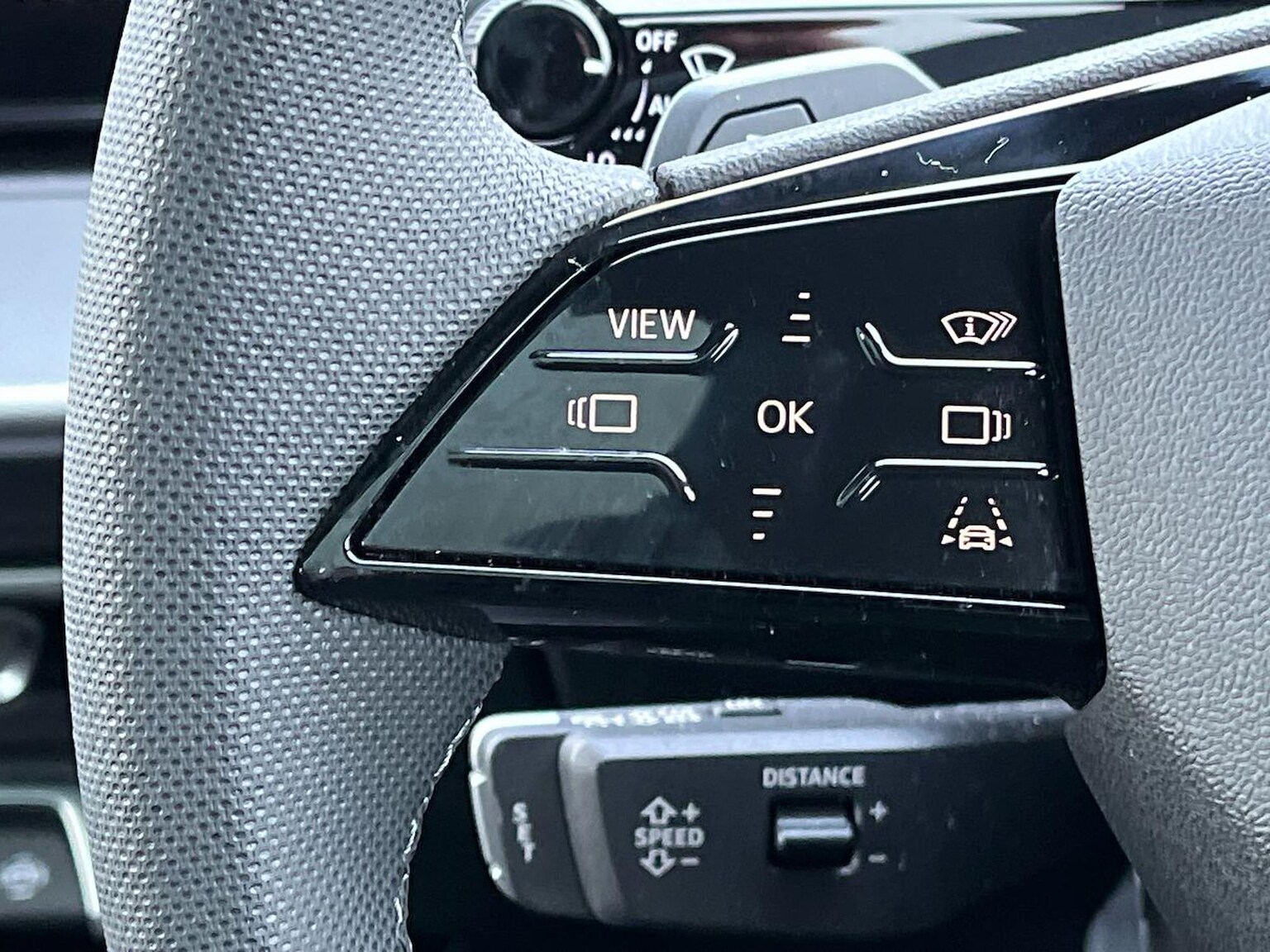"Three spoke leather wrapped multifunction steering wheel"