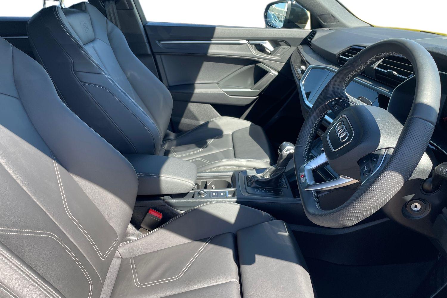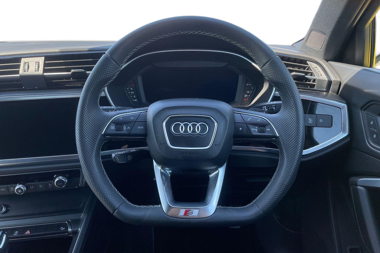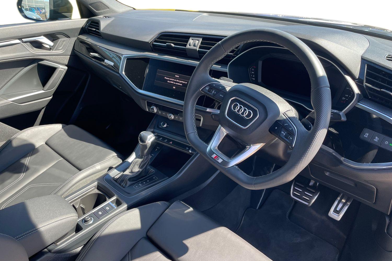 "features": "Amazon alexa Integration, Audi connect safety and service, Audi drive select, Audi lane departure warning, Audi smartphone interface includes wireless Apple carplay/Android Auto, Audi Virtual Cockpit - 10.25\" display, Bluetooth interface, Camera based traffic sign recognition, Distraction and Fatigue warning, Legal emergency call, MMI Navigation Plus with high resolution 10.1 inch touchscreen colour display, Power operated tailgate, Progressive steering, Service interval indicator, Start stop system with recuperation, Voice control system with natural language interaction, Diesel particulate filter, Sports suspension, 2 USB-C ports with charge and data functions, 6 passive loudspeakers, DAB digital radio module, Acoustic windscreen, Audi Beam uses LEDs to project the Audi logo onto the ground as you exit your Q3, Auto dimming door mirrors, Auto dimming frameless rear view mirror, Black roof rails, Electrically folding, adjustable and heated door mirrors with integrated LED side indicators and kerb view function for passenger side, Front and rear electric windows, Front fog lights, Grille vertical bars in aluminium silver/Matt, High gloss black finish B and C pillars, LED Dynamic rear indicators, LED headlights with LED daytime running lights, LED rear lights, LED third brake light, Privacy glass dark tinted rear and rear-side windows (from B-pillar backwards), Rain and light sensors, Rear diffuser grille in grained matt black, Rear diffuser strip in matt anthracite black, Rear side wing doors, Rear wiper, S line bumpers in contrasting Manhattan grey, Variable front intermittent wipers, 12V socket in rear centre console, 3 seat bench in 2nd row, 40:20:40 folding with manual adjustment for 60:40 forwards/backwards position and backrest angle, Adjustable rear seat bench/backrest with centre armrest and cupholder, Black cloth headlining, Dual zone electronic climate control, Electric lumbar support, Front and rear black floor mats with contrast stitching in rock grey, Front and rear headrests, Front centre armrest, Height and reach adjustable steering wheel, Illuminated door sill trims with S logo, ISOFIX child seat mounting for front passenger with airbag deactivation and outer rear seat including top tether attachment point for outer rear seats, Manual front seats with height adjustment, Perforated leather gearknob, Single front passenger seat, Stainless steel luggage compartment sill finisher, Stainless steel pedals, Twin leather upholstery with front sport seats + S embossing, Black styling pack - Q3, Non smoking pack - Q3, 3x3 point rear seatbelts, 6 airbags - Driver, front passenger, curtain and side windows, Audi pre-sense front with pedestrain and cyclist recognition, Electrically operated child locks on rear doors, Electromechanical parking brake, Electronic stabilisation control including ABS, ASR and EDL, Front seatbelt reminder, Hill descent control, Hill hold assist, Pre sense basic, Seatbelt monitoring, Tyre pressure warning, Warning triangle and first aid kit, Anti theft alarm, Anti theft wheel bolts, Immobiliser, Remote central locking, Aluminium look interior elements, Detail dashboard around MMI touch colour display in glass look, black with surround in aluminium look, Leatherette door armrest, Piano black inlay, ",