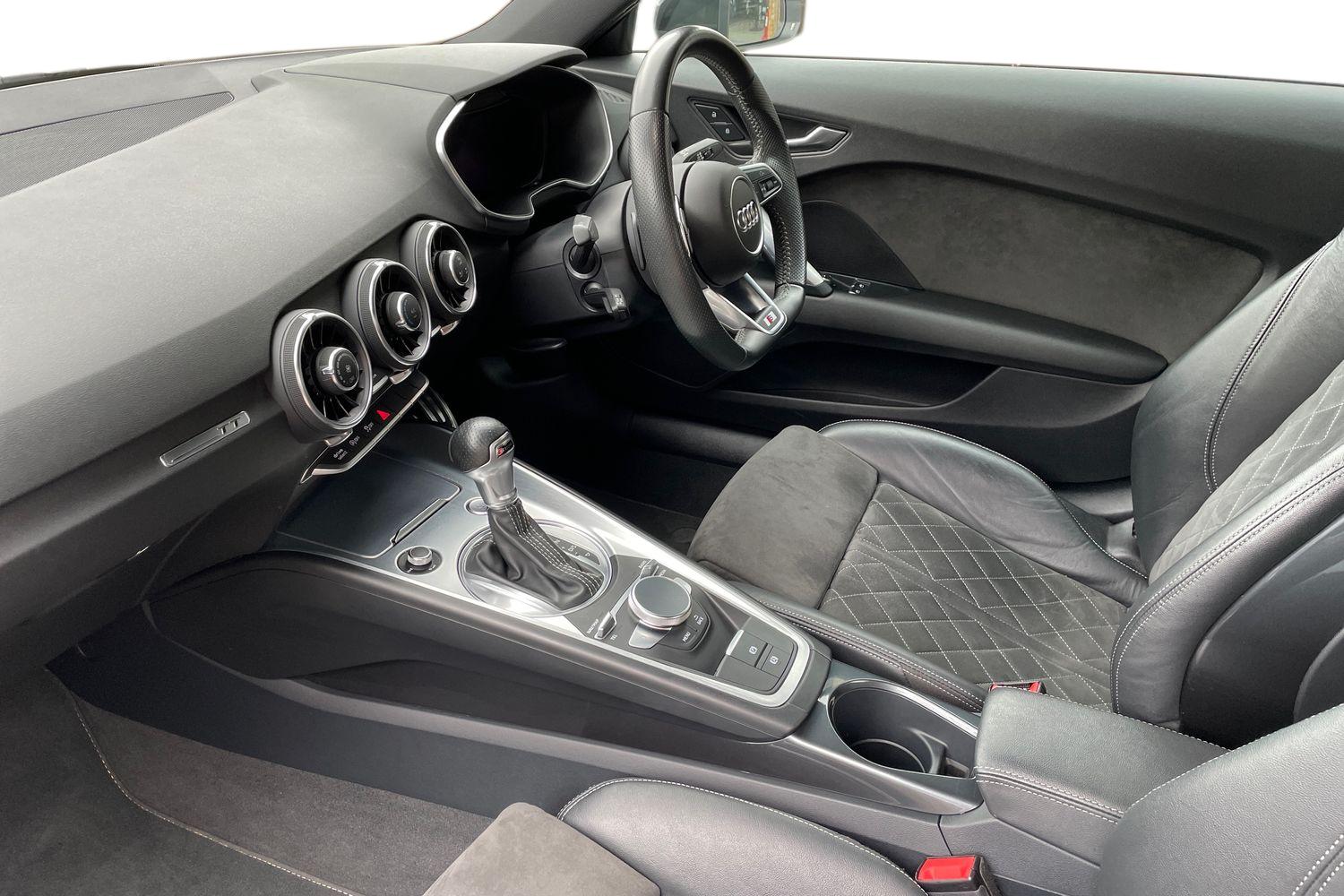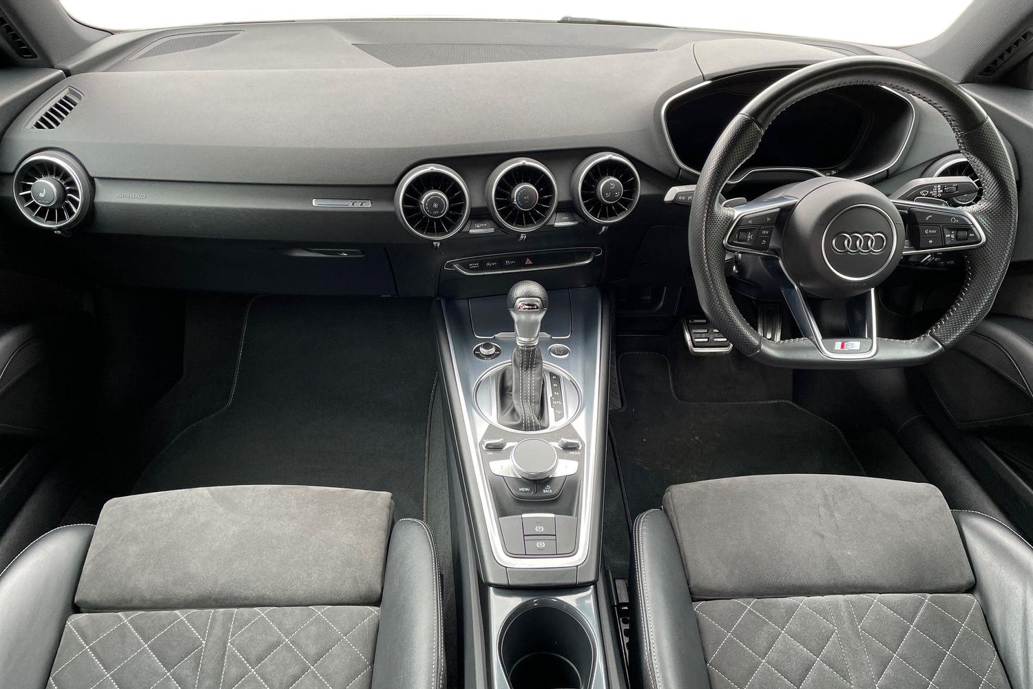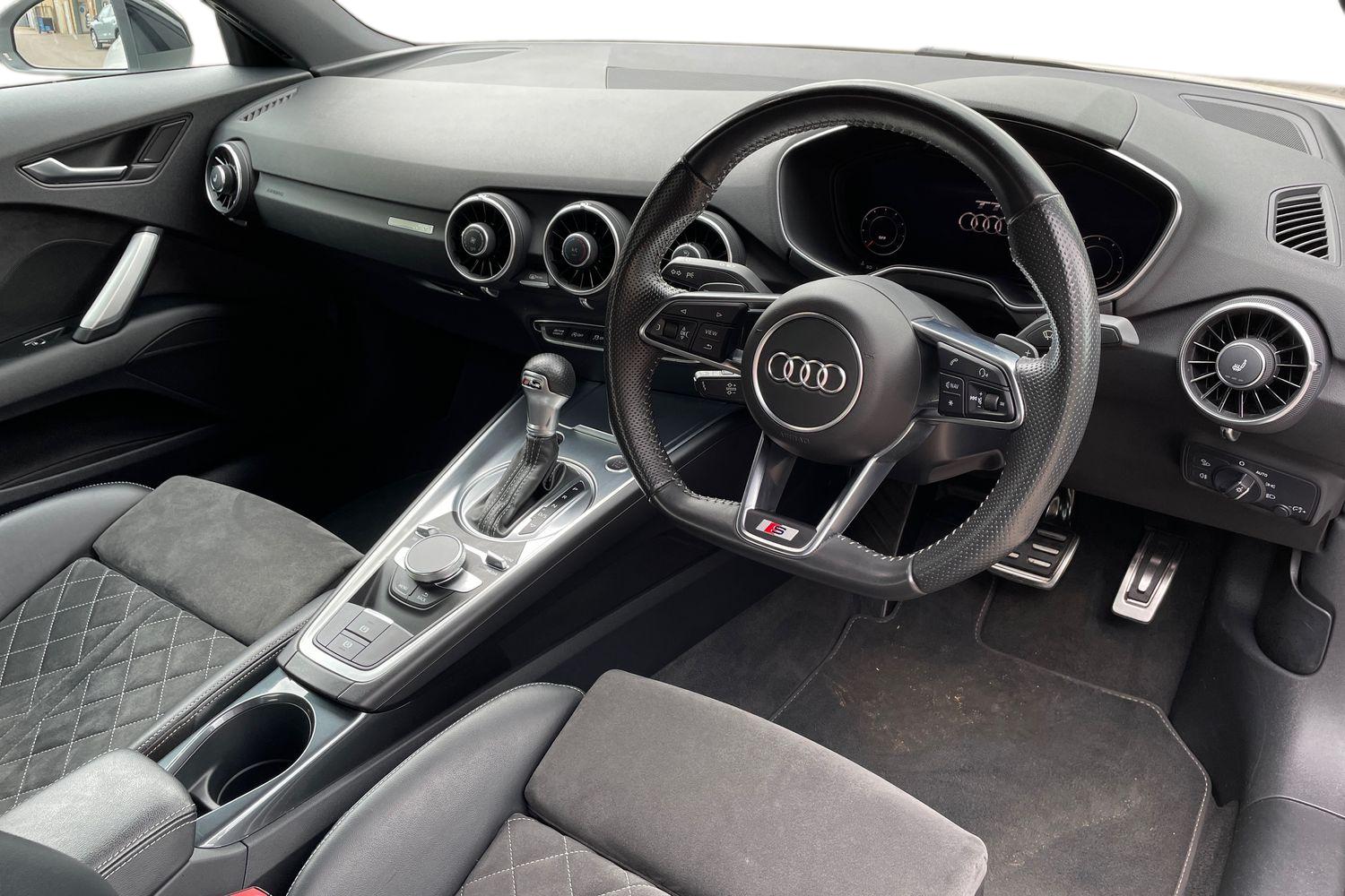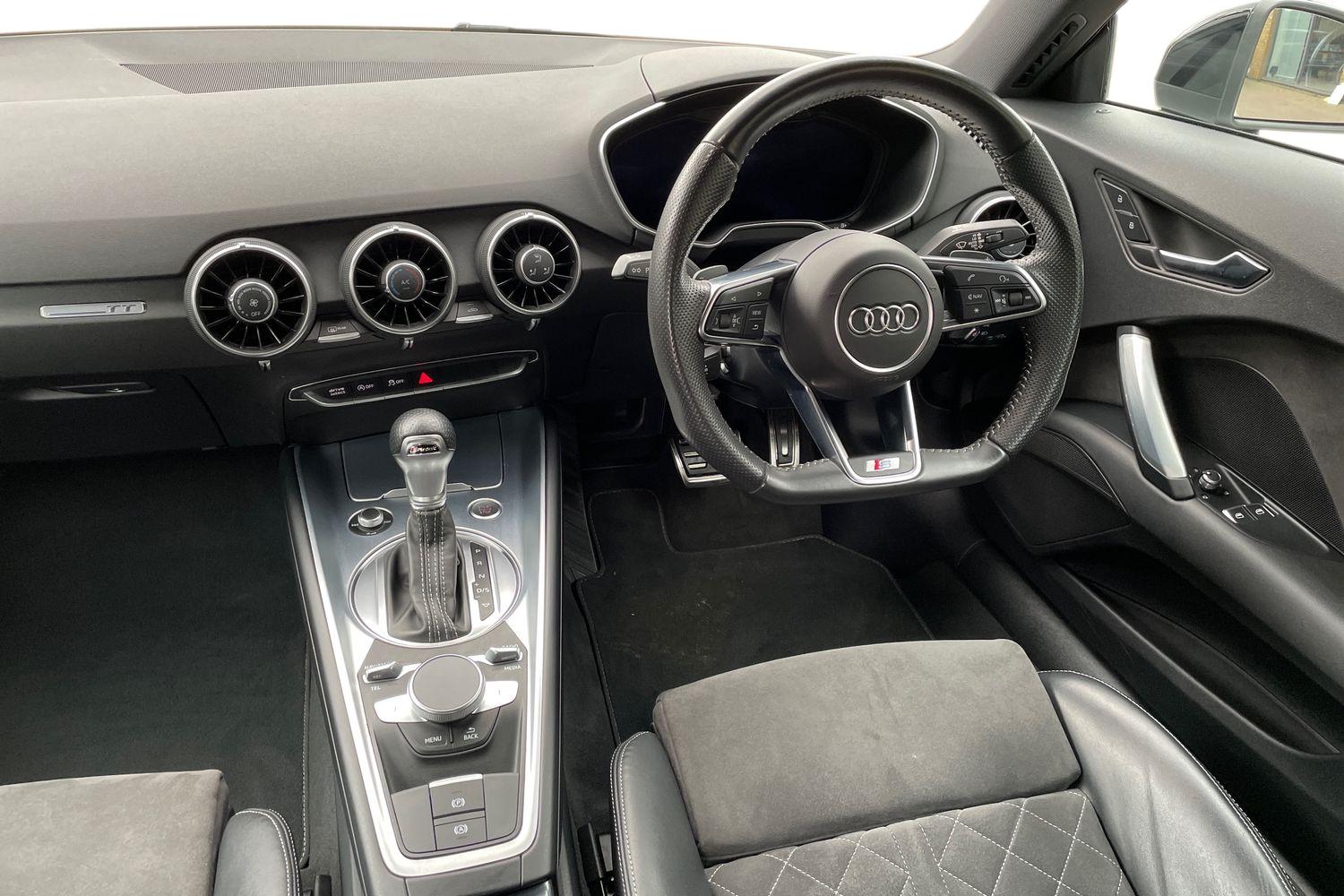 "features": "Audi drive select with 4 Pre configured modes, Audi smartphone interface, Audi virtual cockpit - 12.3\" high-resolution LCD display with fully customisable instrument cluster, Cruise control + speed limiter, Emergency call service, MMI touch panel, Mobile phone preparation with bluetooth interface, Progressive power assisted steering, Service interval indicator, Start/Stop system with energy recuperation, TP memo, Sports suspension, AM/FM radio, Bluetooth audio streaming, DAB Digital radio, MMI Radio with CD player and SD/XC card slot, Auto dimming rear view mirror, Auto headlight range control, Black chrome tailpipe, Dark privacy glass from B-pillar backwards, Electric folding door mirrors, Electric front windows, Electrically adjustable and heated door mirrors with integrated LED side indicators, Front fog lights, Green tinted heat insulating glass, LED 3rd brake light, LED daytime running lights, LED headlights with LED rear lights + dynamic rear indicators, Light and rain sensors, Rear boot, Sunband for windscreen, 12V socket, 2 rear seats, 3 spoke flat bottomed high multi-function leather sport steering wheel with gearshift paddles, 4 way electric lumbar support for driver and front passenger, Black headlining, Contrasting silver stitching in steering wheel, Door sill trims, Extended aluminium look with stainless steel pedals, Front centre armrest, Front passenger seat, Front super sports seats, Heated front seats, Height/reach adjust steering wheel, Integrated head restraints, ISOFIX child seat mounting for front passenger seat with airbag deactivation, Manual adjustment of seat height, fore/aft position, seat angle, seat depth and backrest angle, Perforated leather gearknob in black, Rear head restraints, Rear top tether child seat ISOFIX attachment, Split folding rear seat, Black styling pack - TT, Non smoking pack - TT/TT RS, 3 point front seat belts, ABS, ASR traction control, Curtain airbags, Driver and front passenger airbag with front passenger airbag deactivation, EDL traction control, Electromechanical parking brake, ESP, First aid kit, Front side airbags, Head airbags, Hill hold assist, Seatbelt warning, Tyre pressure loss indicator, Warning triangle, Anti theft alarm, Anti theft wheel bolts, Immobiliser, Keyless Go, Remote central locking, Matt brushed aluminium inlays, Tool kit, Tyre repair kit, ",