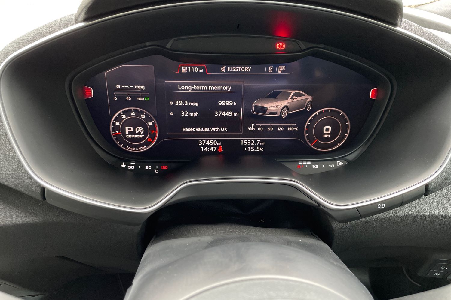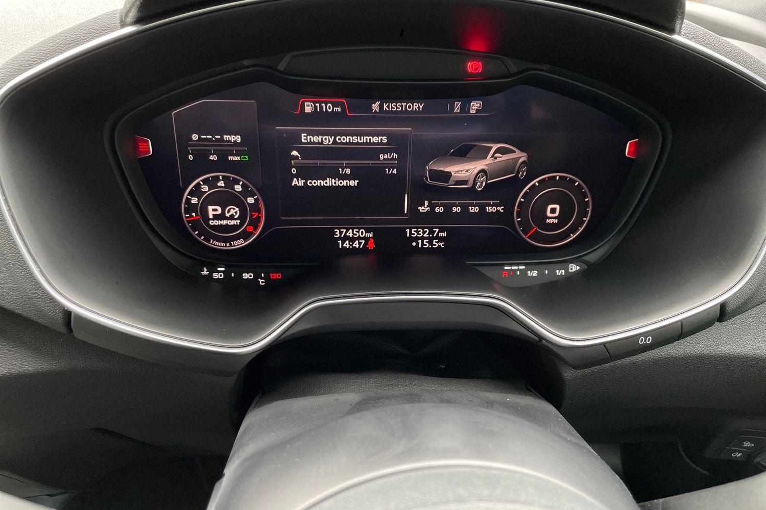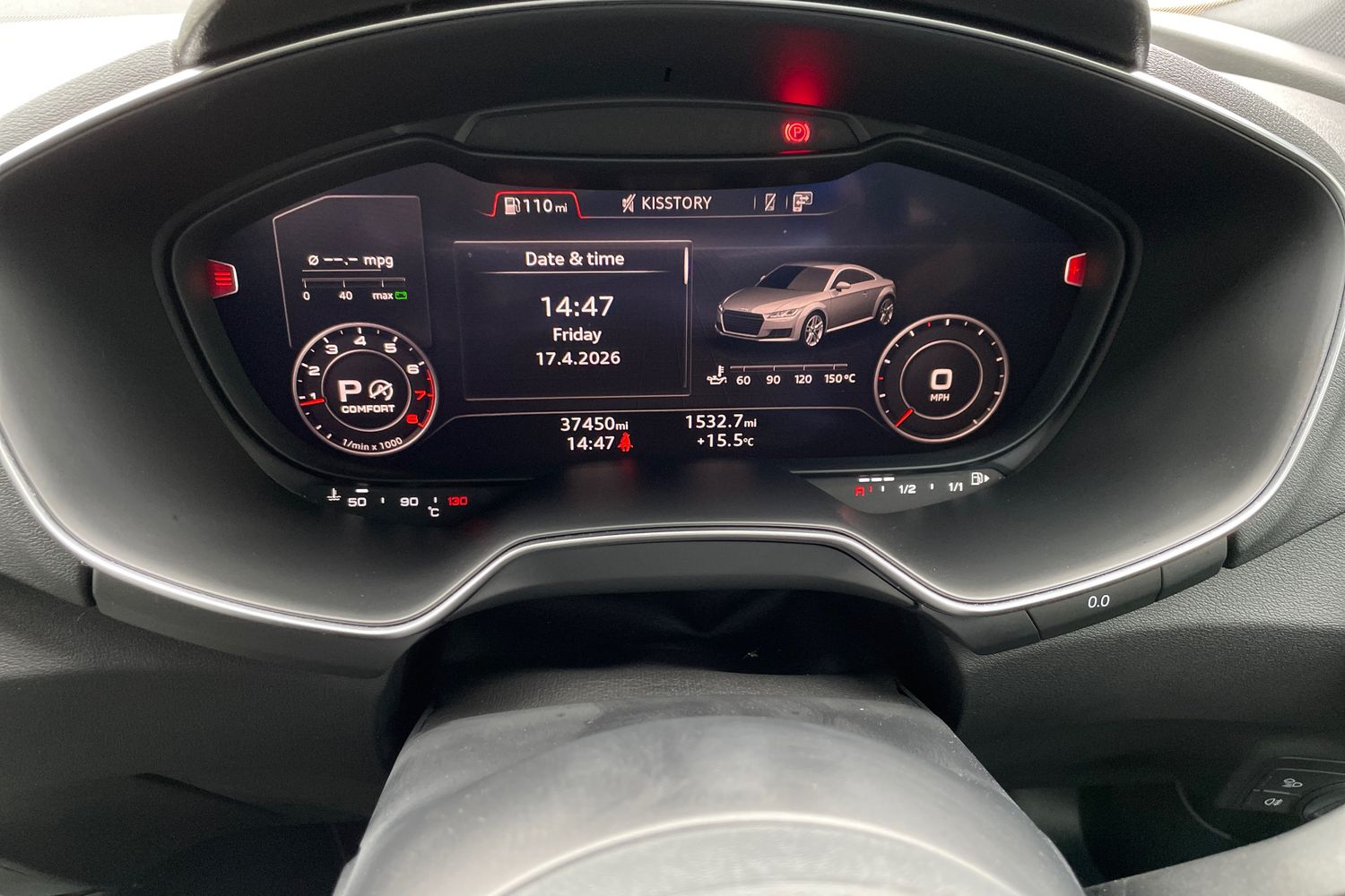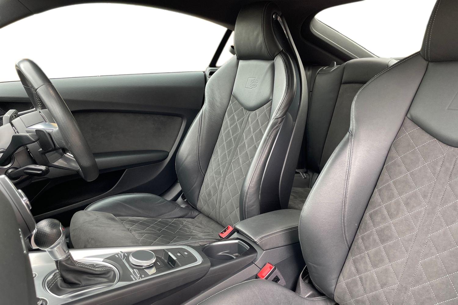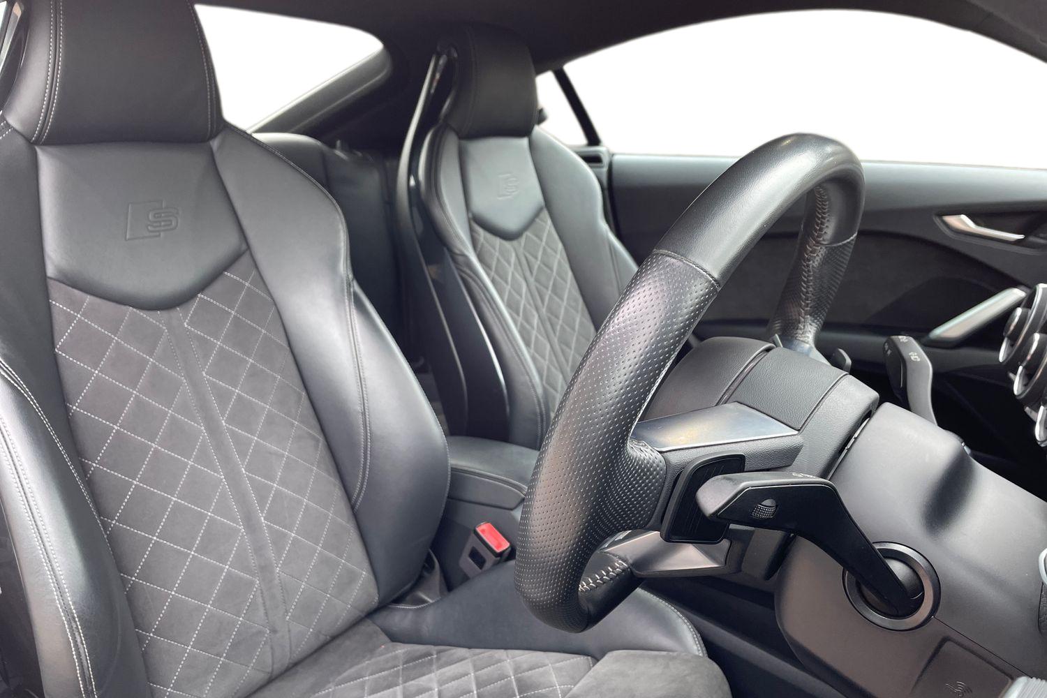 "features": "Audi drive select with 4 Pre configured modes, Audi smartphone interface, Audi virtual cockpit - 12.3\" high-resolution LCD display with fully customisable instrument cluster, Cruise control + speed limiter, Emergency call service, MMI touch panel, Mobile phone preparation with bluetooth interface, Progressive power assisted steering, Service interval indicator, Start/Stop system with energy recuperation, TP memo, Sports suspension, AM/FM radio, Bluetooth audio streaming, DAB Digital radio, MMI Radio with CD player and SD/XC card slot, Auto dimming rear view mirror, Auto headlight range control, Black chrome tailpipe, Dark privacy glass from B-pillar backwards, Electric folding door mirrors, Electric front windows, Electrically adjustable and heated door mirrors with integrated LED side indicators, Front fog lights, Green tinted heat insulating glass, LED 3rd brake light, LED daytime running lights, LED headlights with LED rear lights + dynamic rear indicators, Light and rain sensors, Rear boot, Sunband for windscreen, 12V socket, 2 rear seats, 3 spoke flat bottomed high multi-function leather sport steering wheel with gearshift paddles, 4 way electric lumbar support for driver and front passenger, Black headlining, Contrasting silver stitching in steering wheel, Door sill trims, Extended aluminium look with stainless steel pedals, Front centre armrest, Front passenger seat, Front super sports seats, Heated front seats, Height/reach adjust steering wheel, Integrated head restraints, ISOFIX child seat mounting for front passenger seat with airbag deactivation, Manual adjustment of seat height, fore/aft position, seat angle, seat depth and backrest angle, Perforated leather gearknob in black, Rear head restraints, Rear top tether child seat ISOFIX attachment, Split folding rear seat, Black styling pack - TT, Non smoking pack - TT/TT RS, 3 point front seat belts, ABS, ASR traction control, Curtain airbags, Driver and front passenger airbag with front passenger airbag deactivation, EDL traction control, Electromechanical parking brake, ESP, First aid kit, Front side airbags, Head airbags, Hill hold assist, Seatbelt warning, Tyre pressure loss indicator, Warning triangle, Anti theft alarm, Anti theft wheel bolts, Immobiliser, Keyless Go, Remote central locking, Matt brushed aluminium inlays, Tool kit, Tyre repair kit, ",