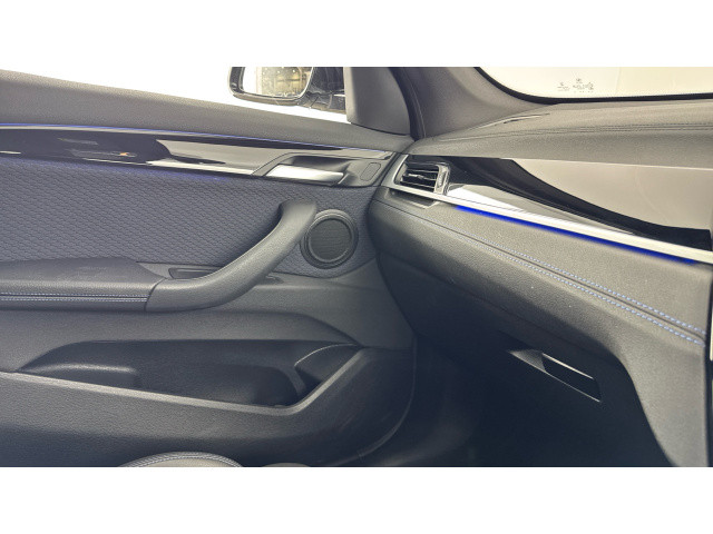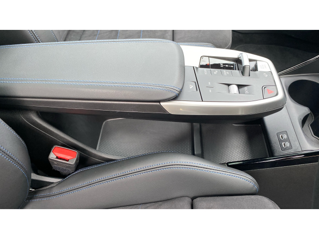 "Blue ambient lighting on front cup holders",