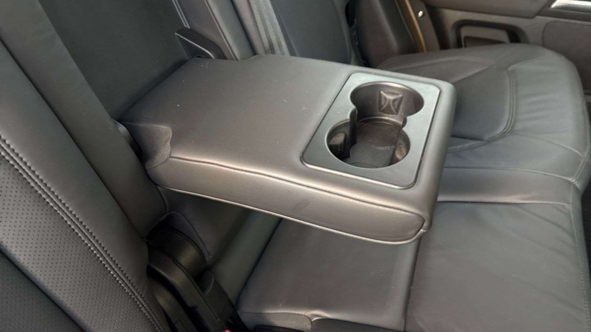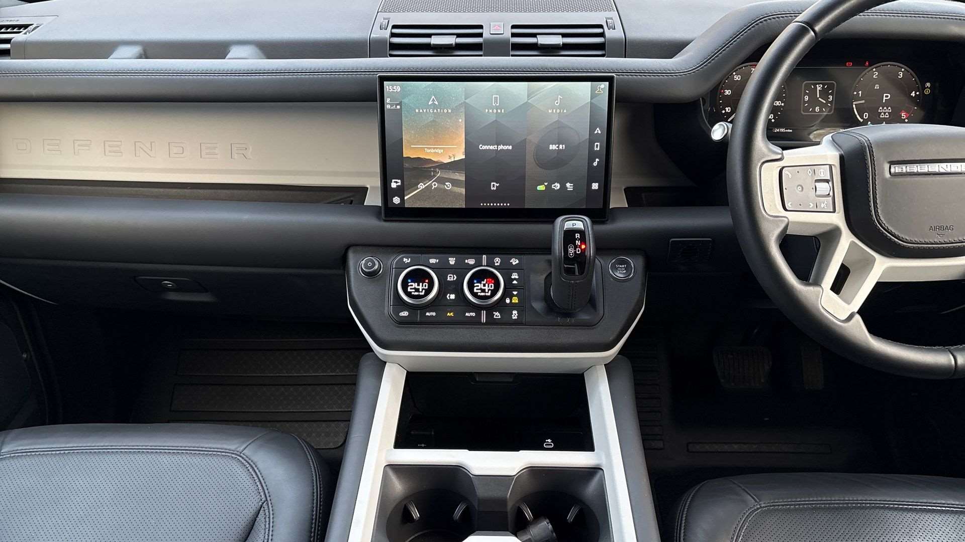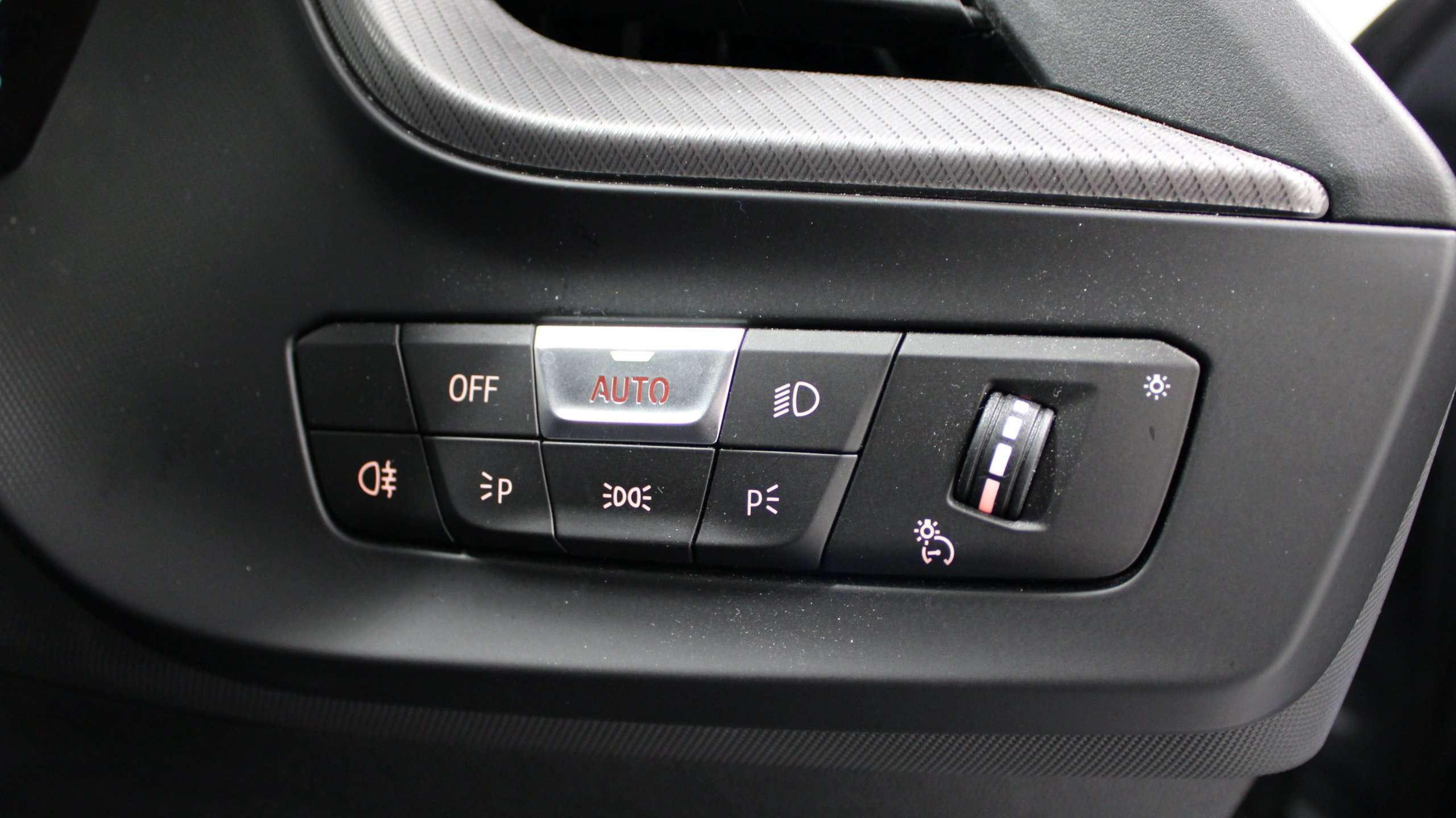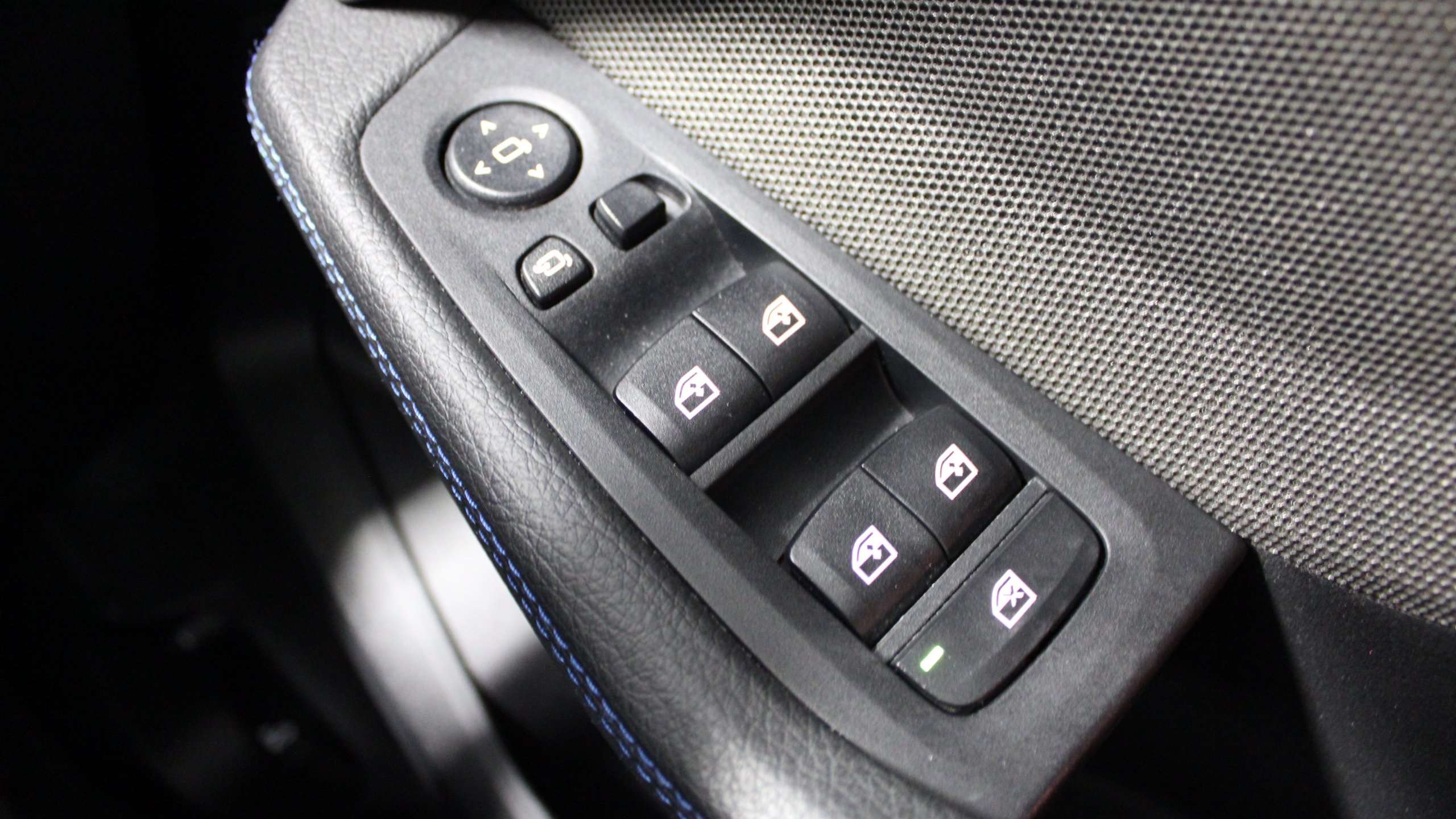 "Black artificial leather dashboard with grey stitching",