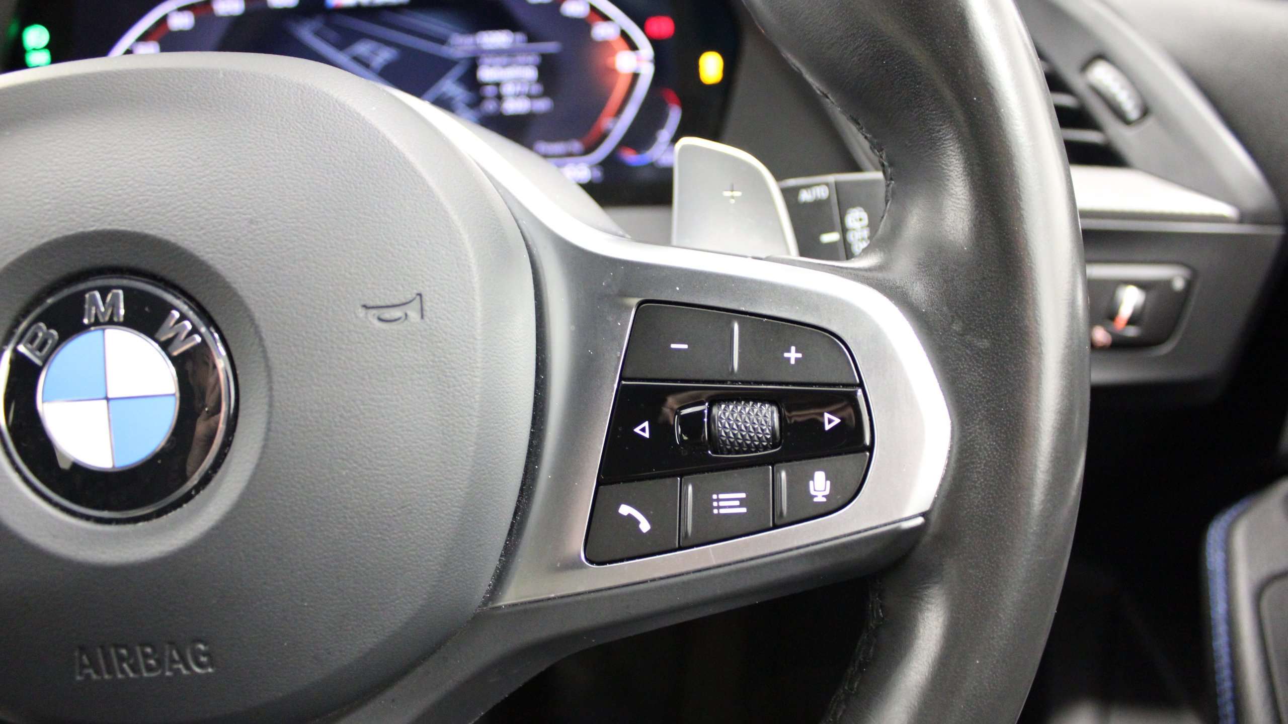 "3-spoke leather heated sports multifunction steering wheel with paddles for recuperation level selection",